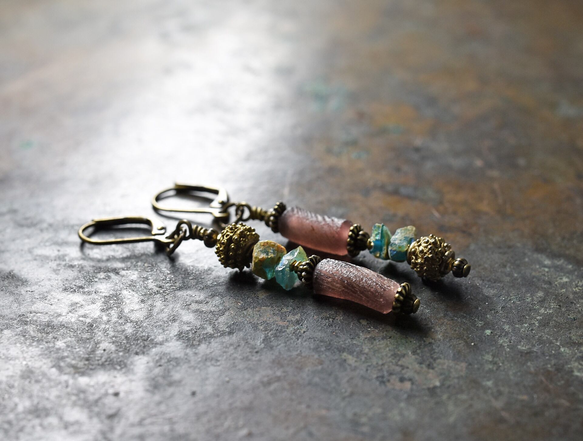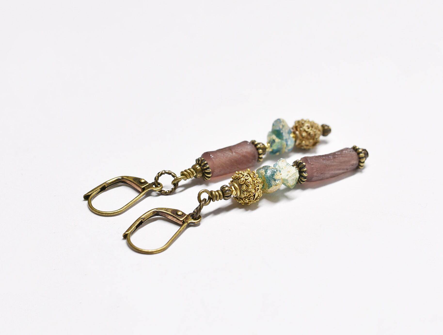 2種類のローマングラスとツブツブの民族ブラスを繋いだアンシメトリーなピアスです。