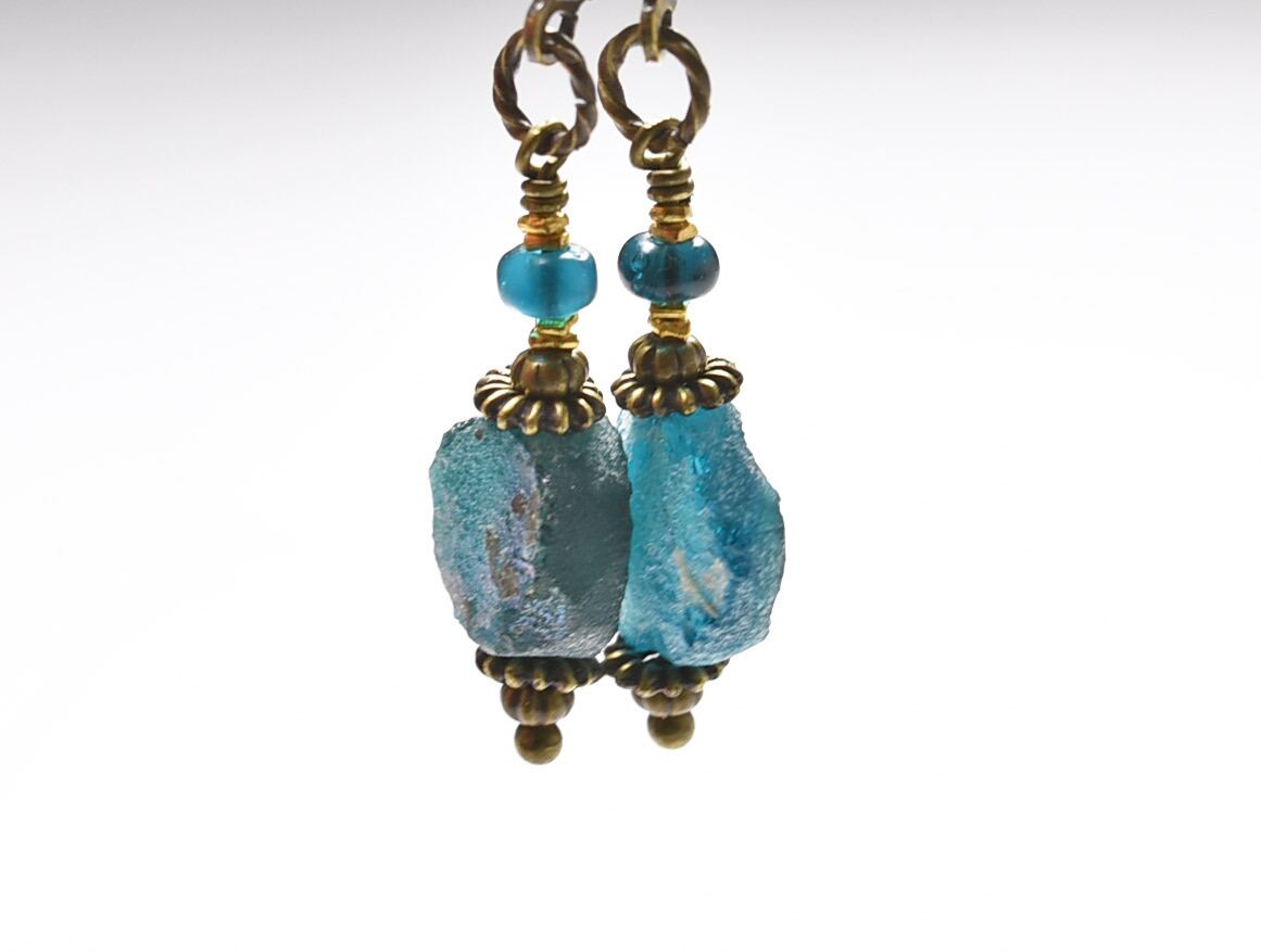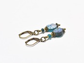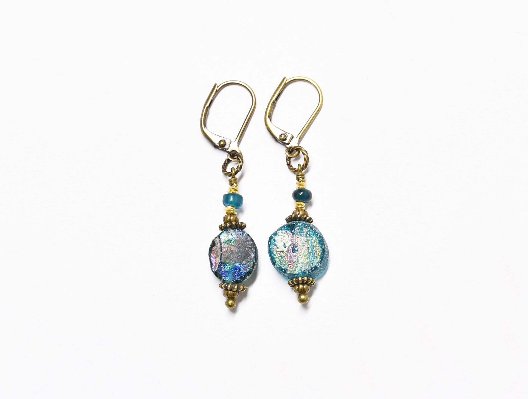 煌めくブルーグリーンー&エメラルドブルーローマングラスのピアス