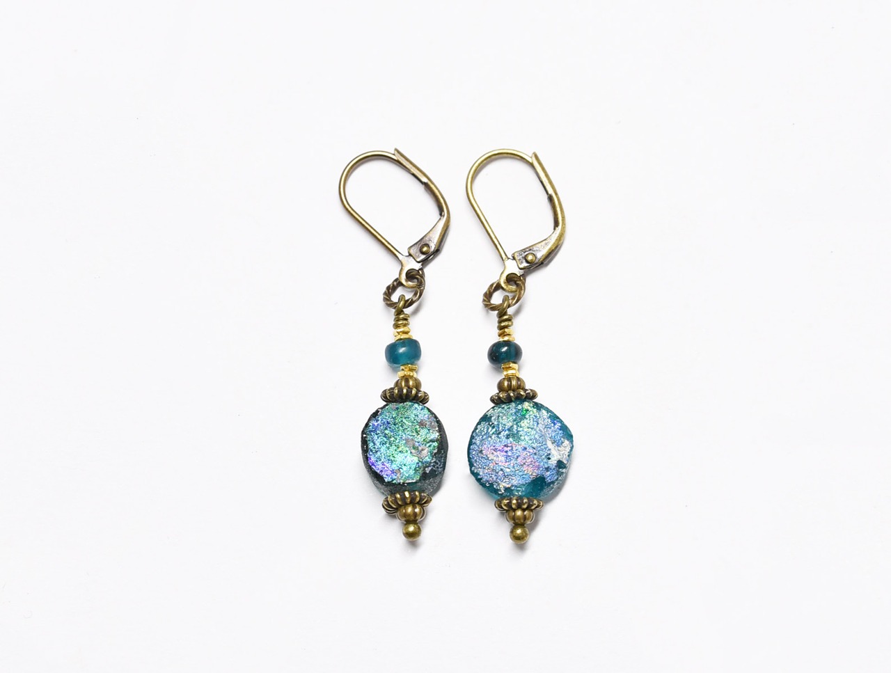 銀化したローマングラスとインドパシフィックビーズを繋いだ小ぶりなピアスです。