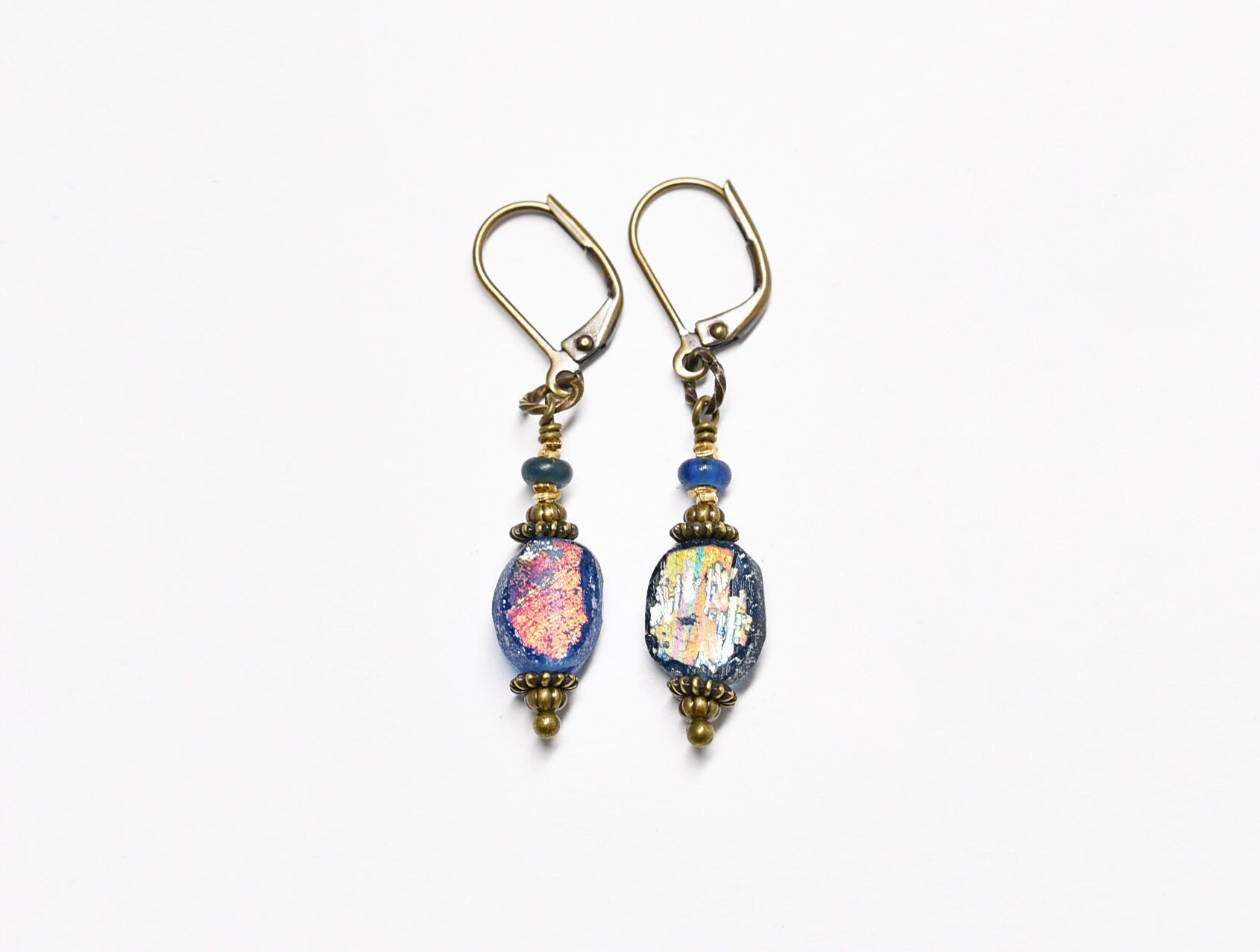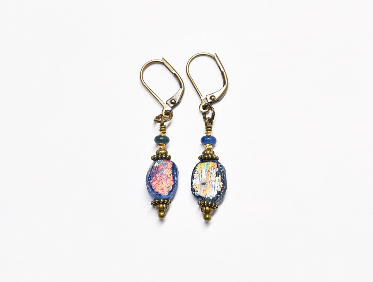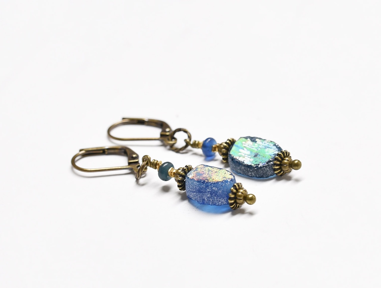 煌めくスカイブルー&ロイヤルブルーローマングラスのピアス