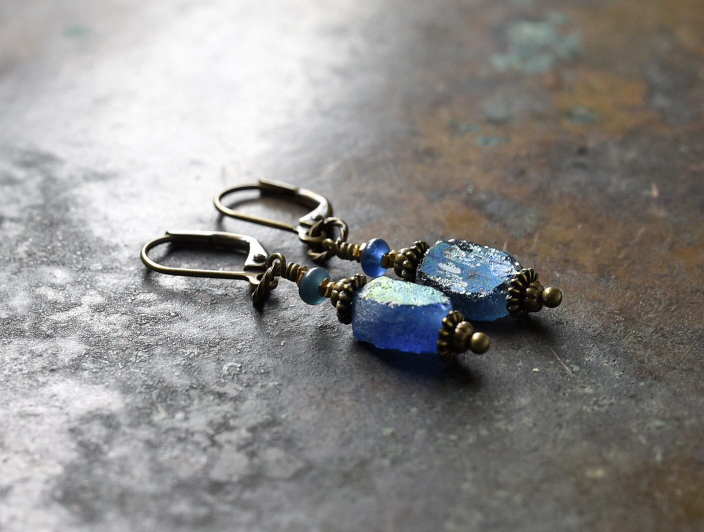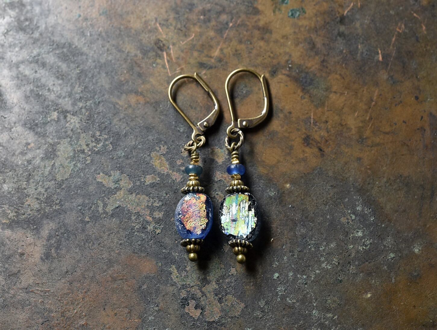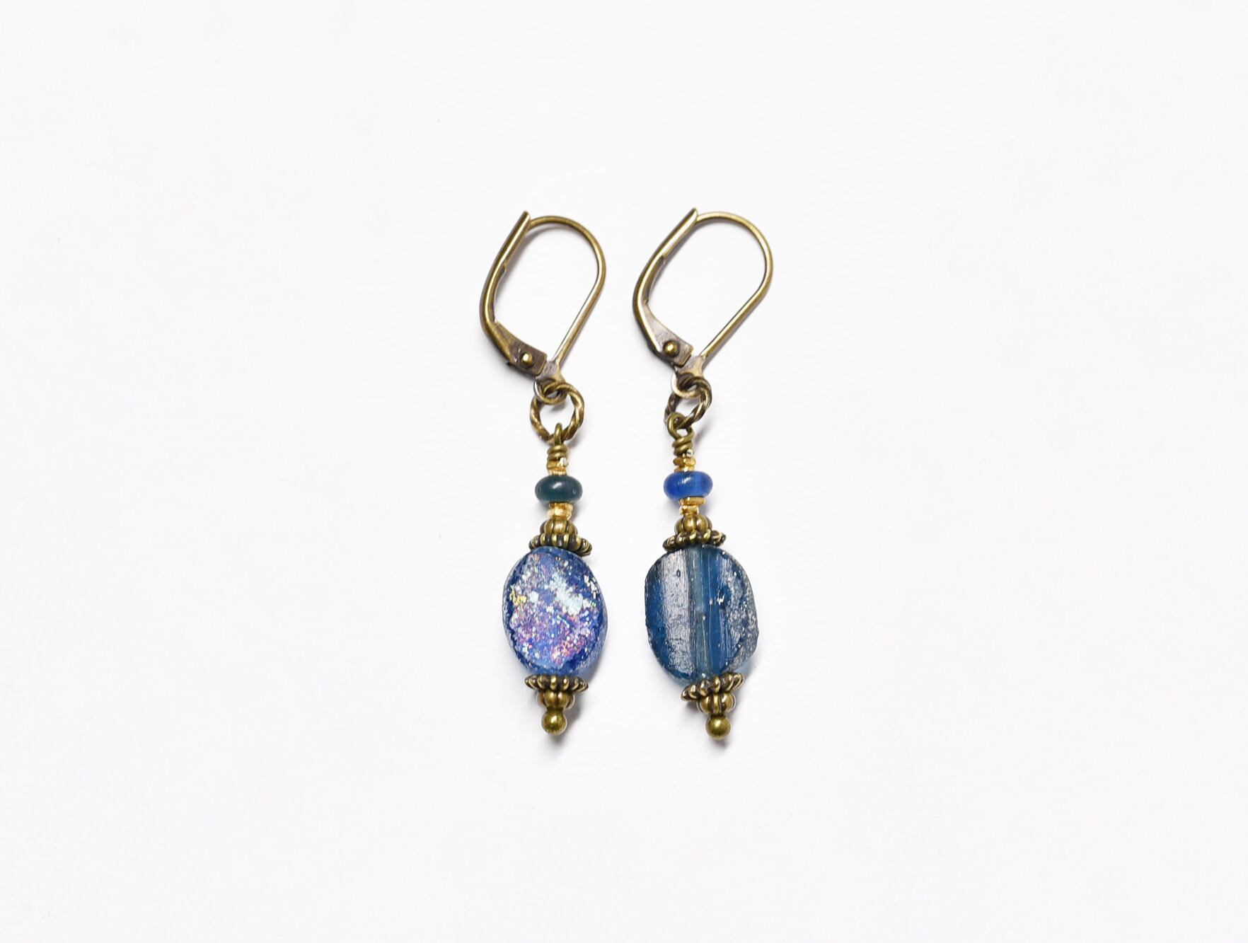煌めくスカイブルー&ロイヤルブルーローマングラスのピアス