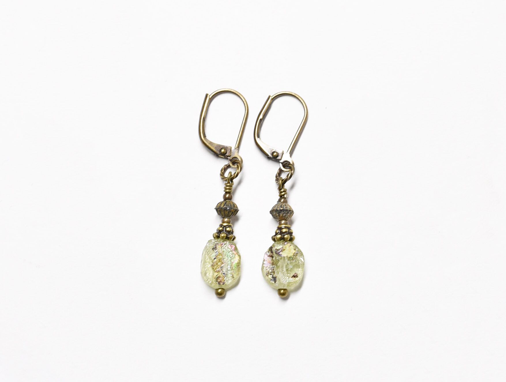 オリーブイエローの小さな銀化ローマングとブラスビーズのピアス