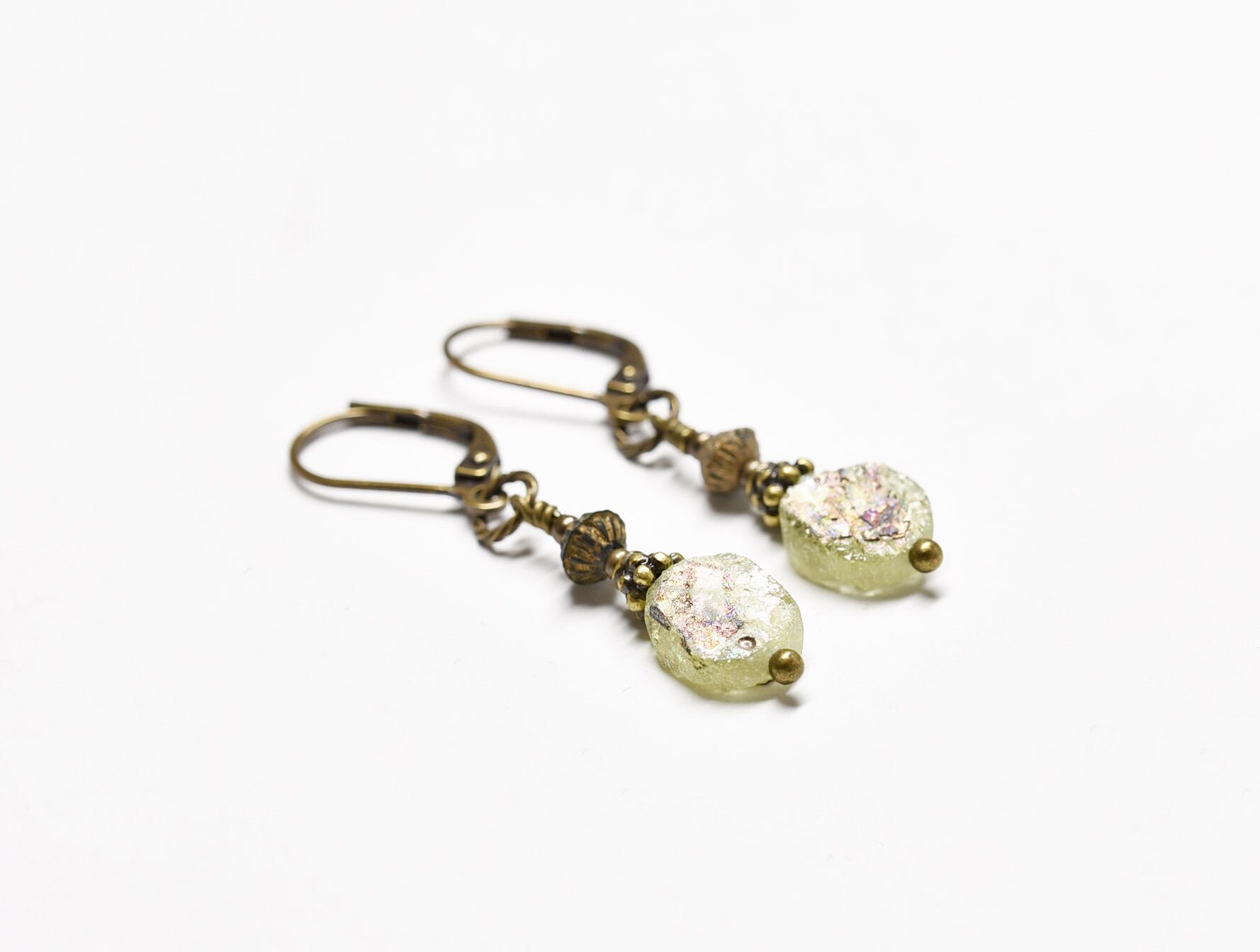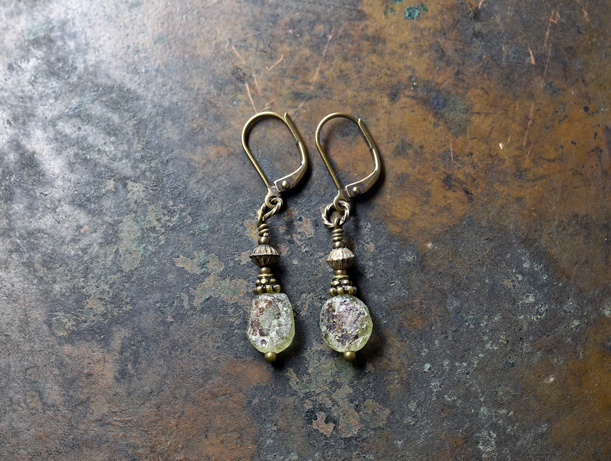 銀化したローマングラスとブラスビーズを繋いだ小ぶりなピアスです。