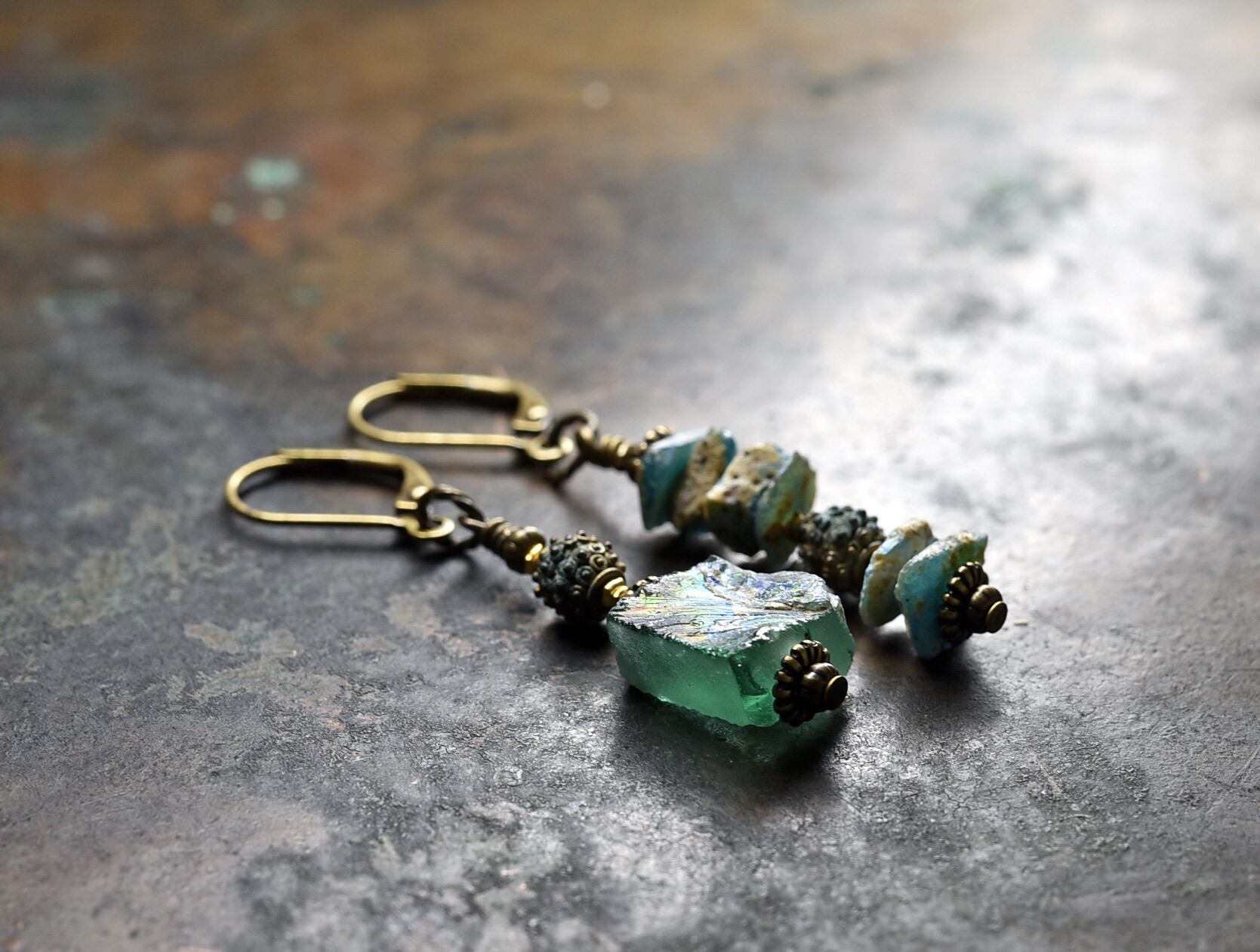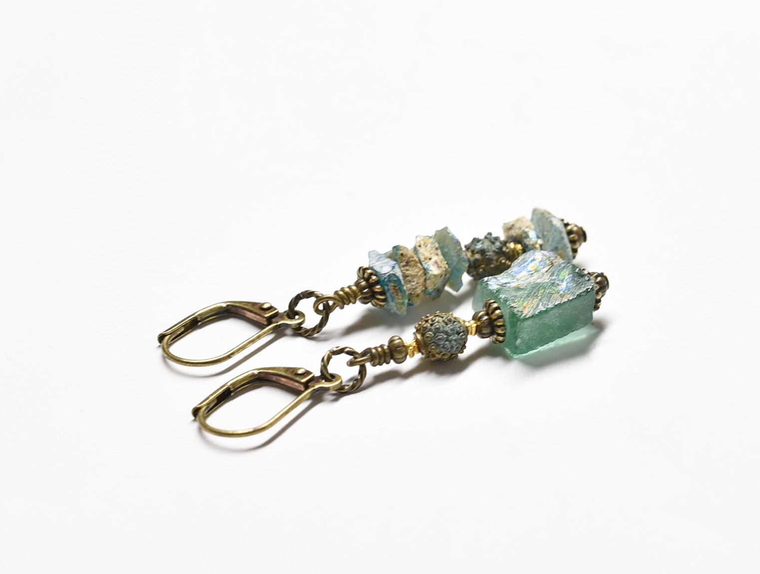 2種類のローマングラス、ベニン族のブラスビーズを繋いだアンシメトリーなピアスです。