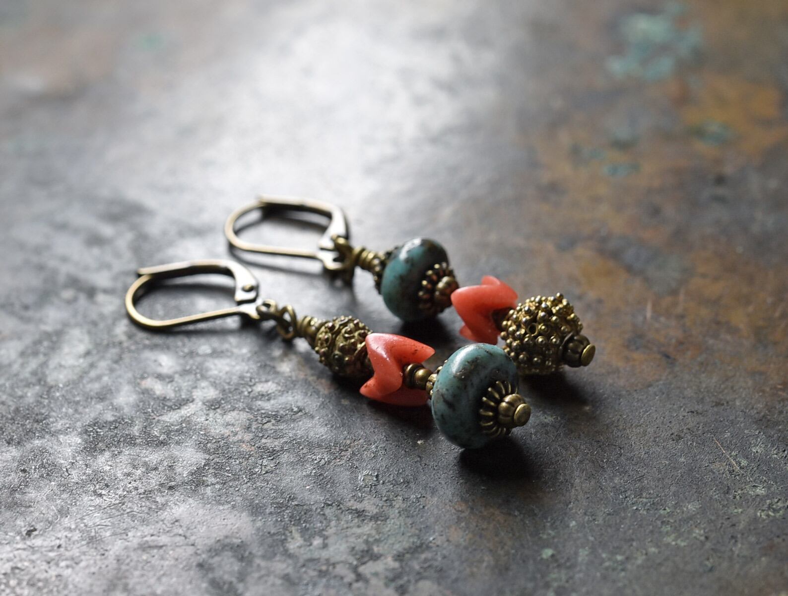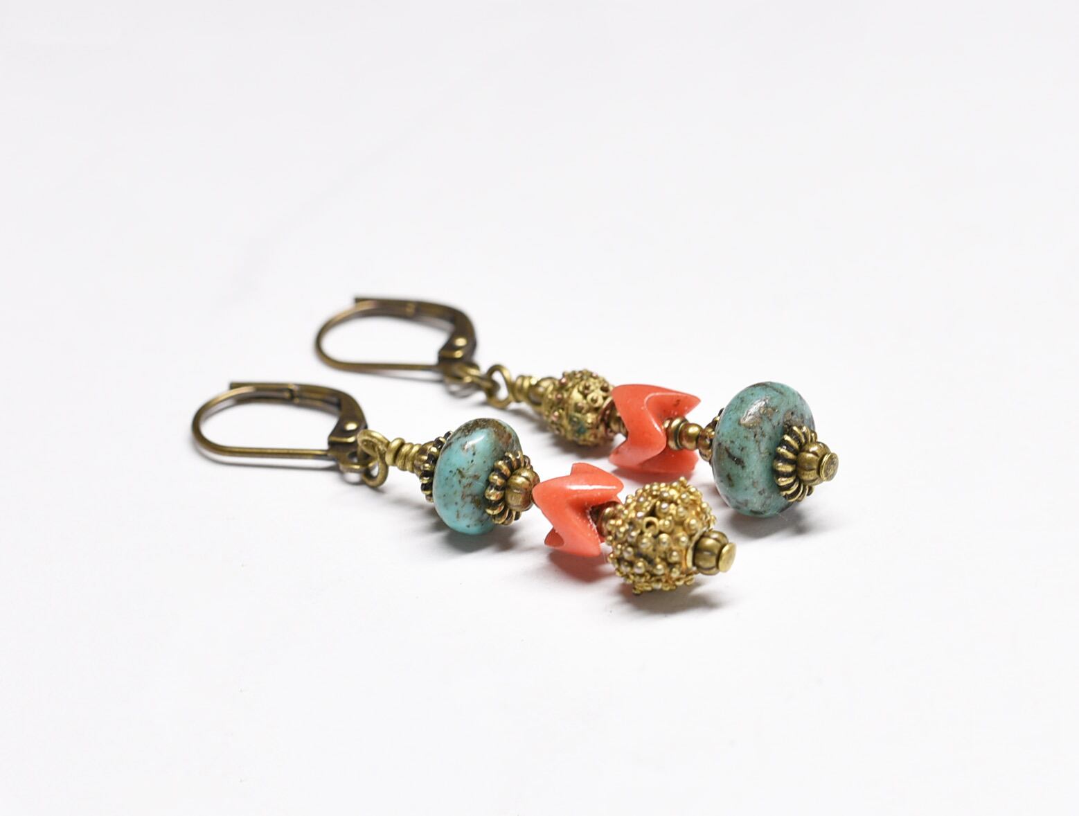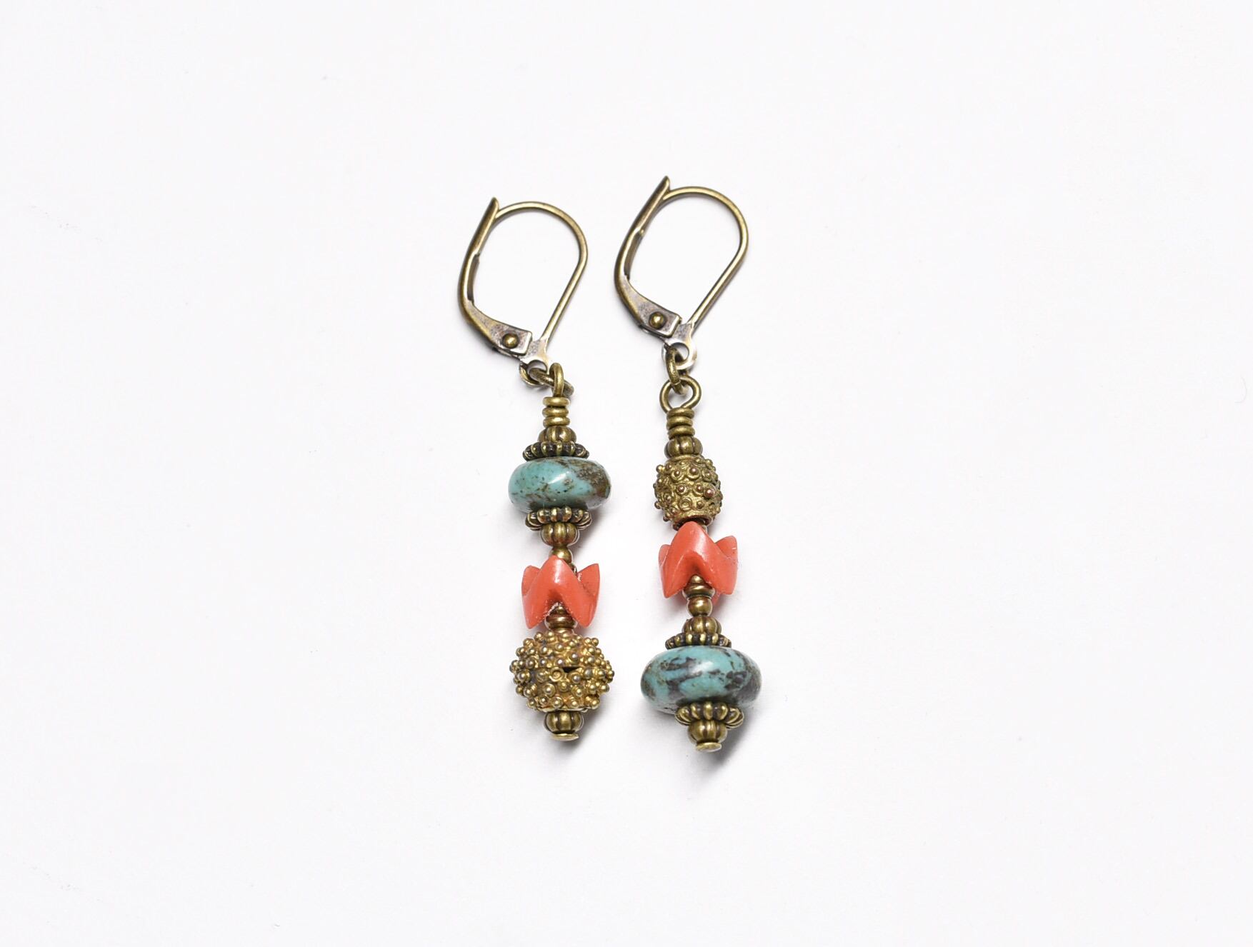 ターコイズの朱色スネークビーズ、民族ツブツブブラスのアンシメトリーピアス