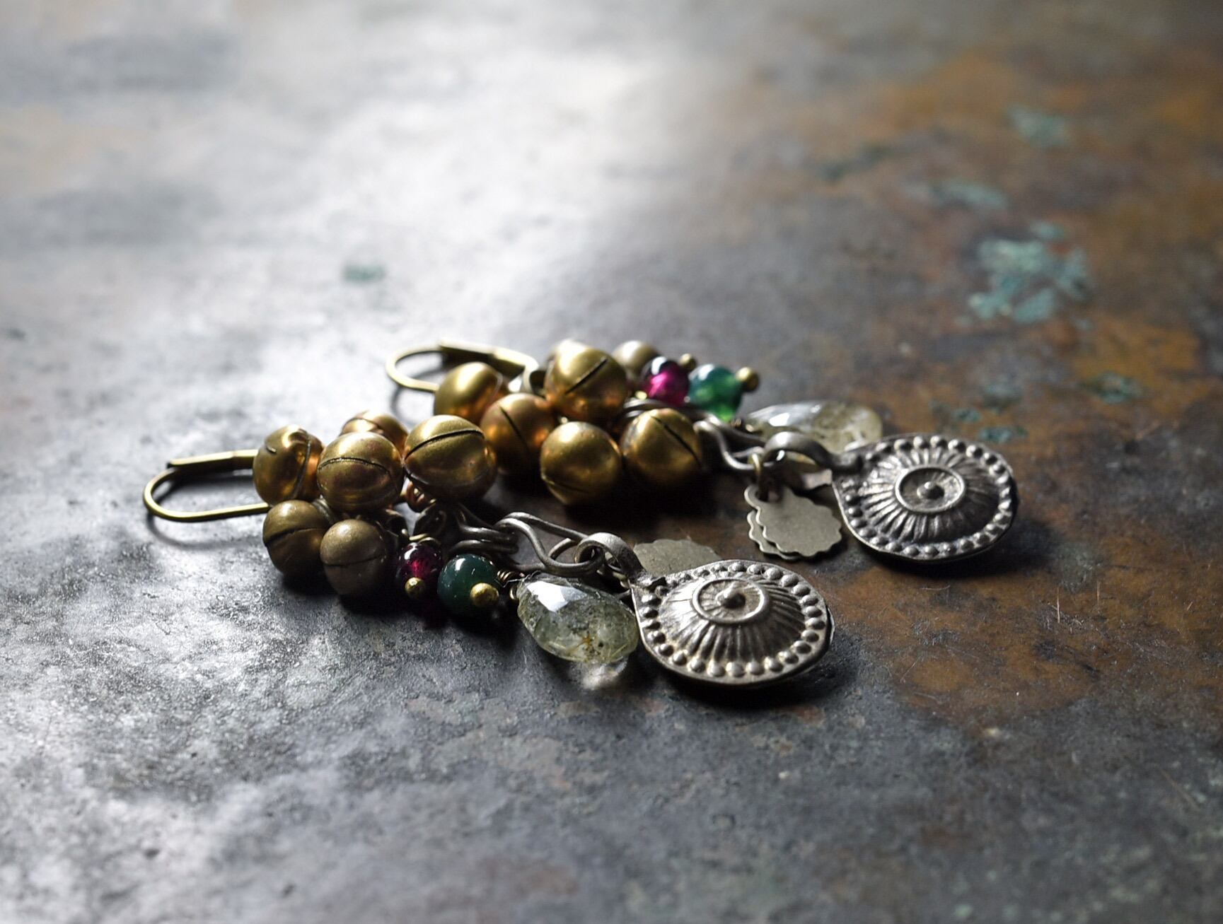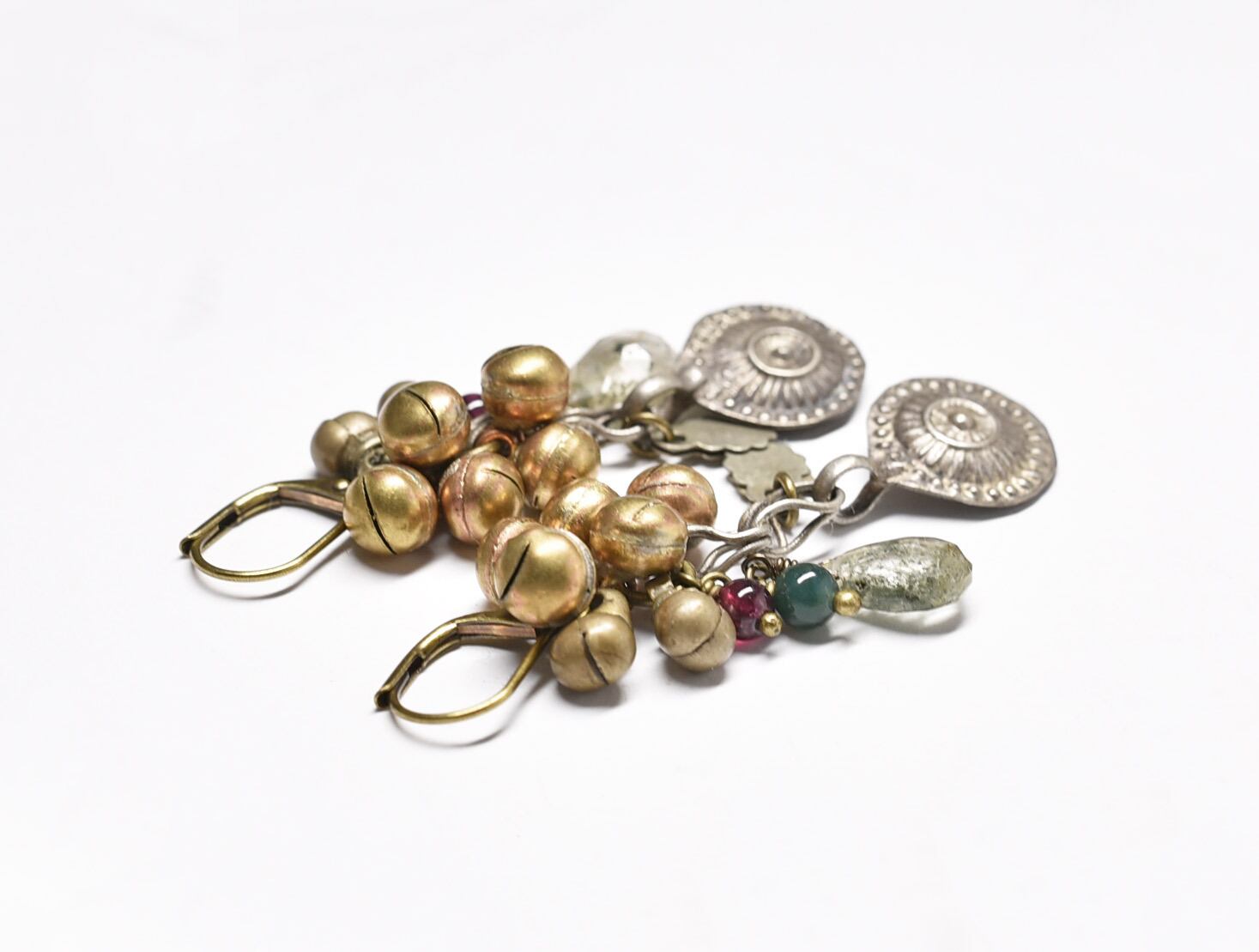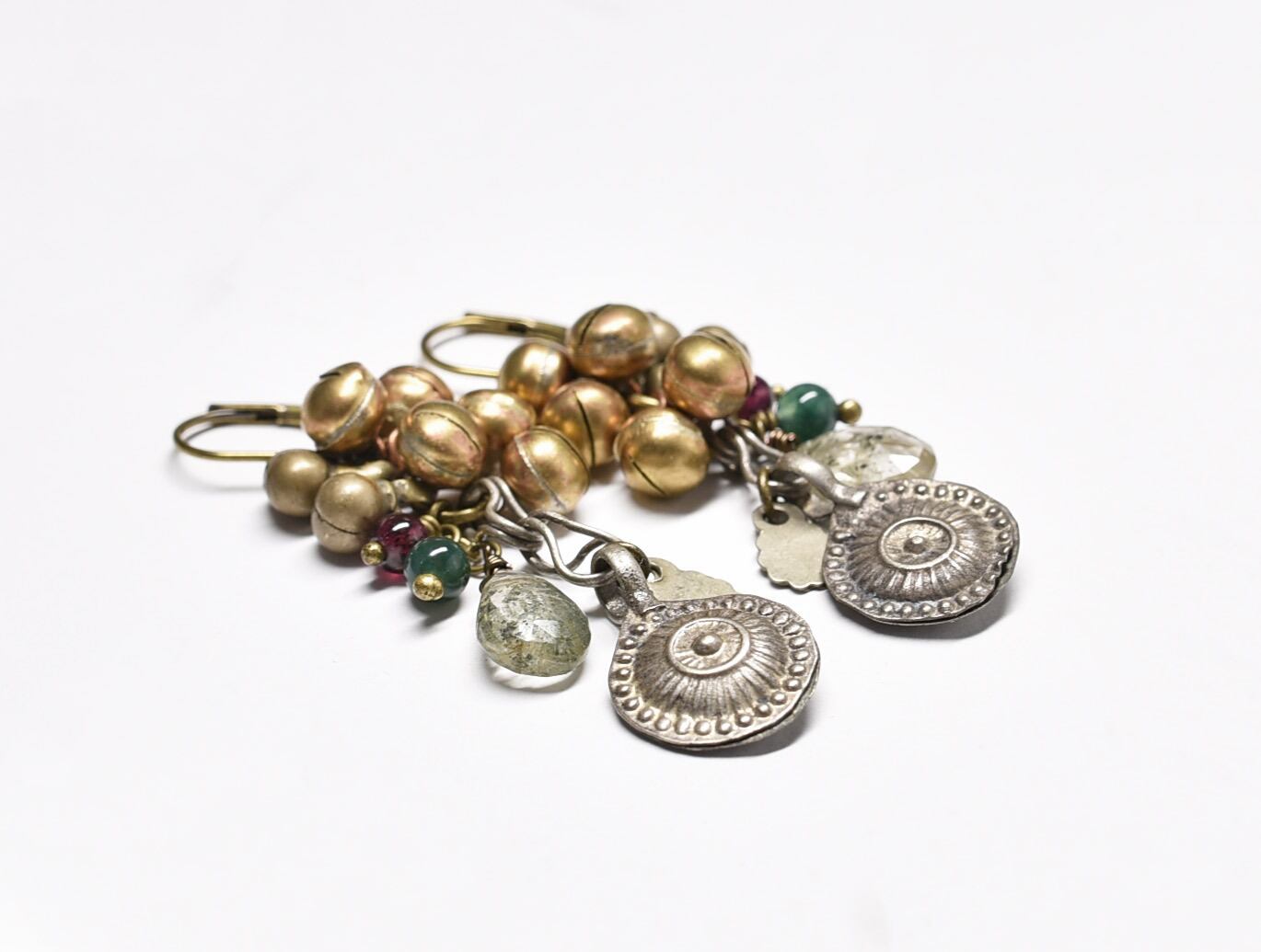 アフガンメタルとガーデンルチルクォーツ、たわわな鈴とガーネット、モスアゲートを繋いだピアスです。