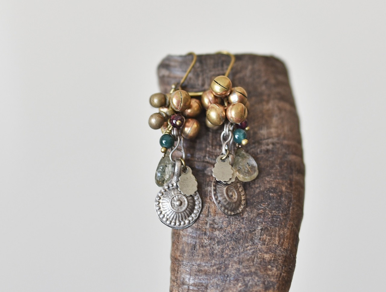 アフガンメタルとガーデンルチルクォーツ、たわわな鈴とガーネット、モスアゲートのピアス
