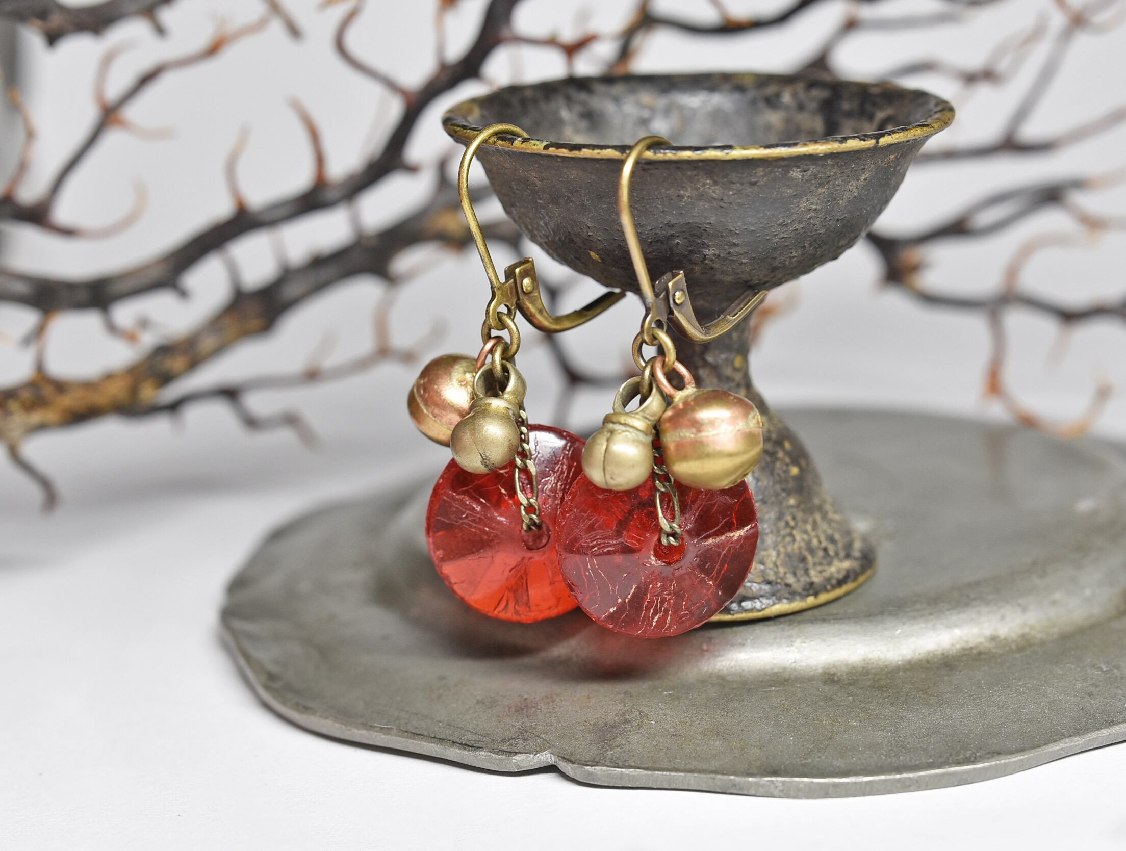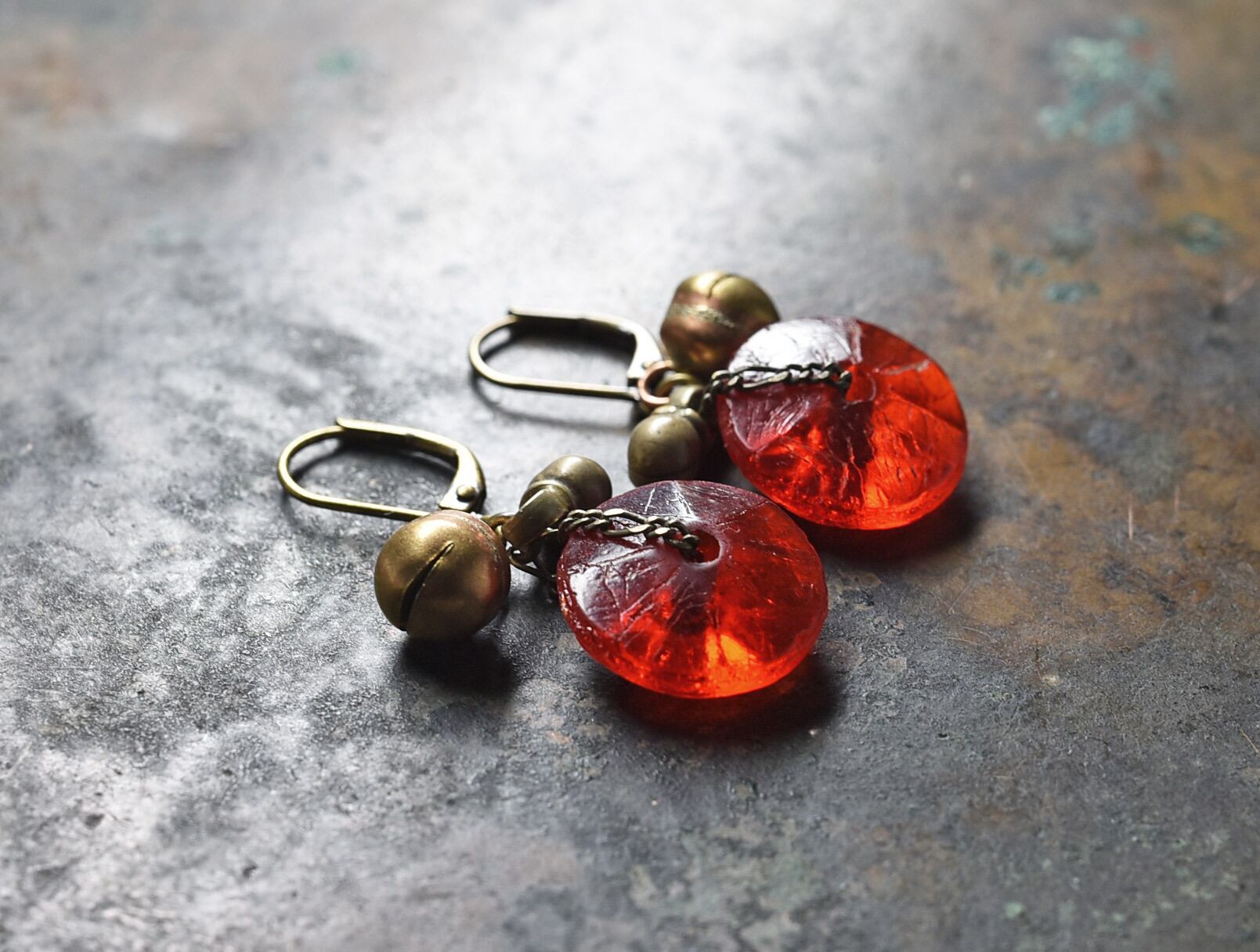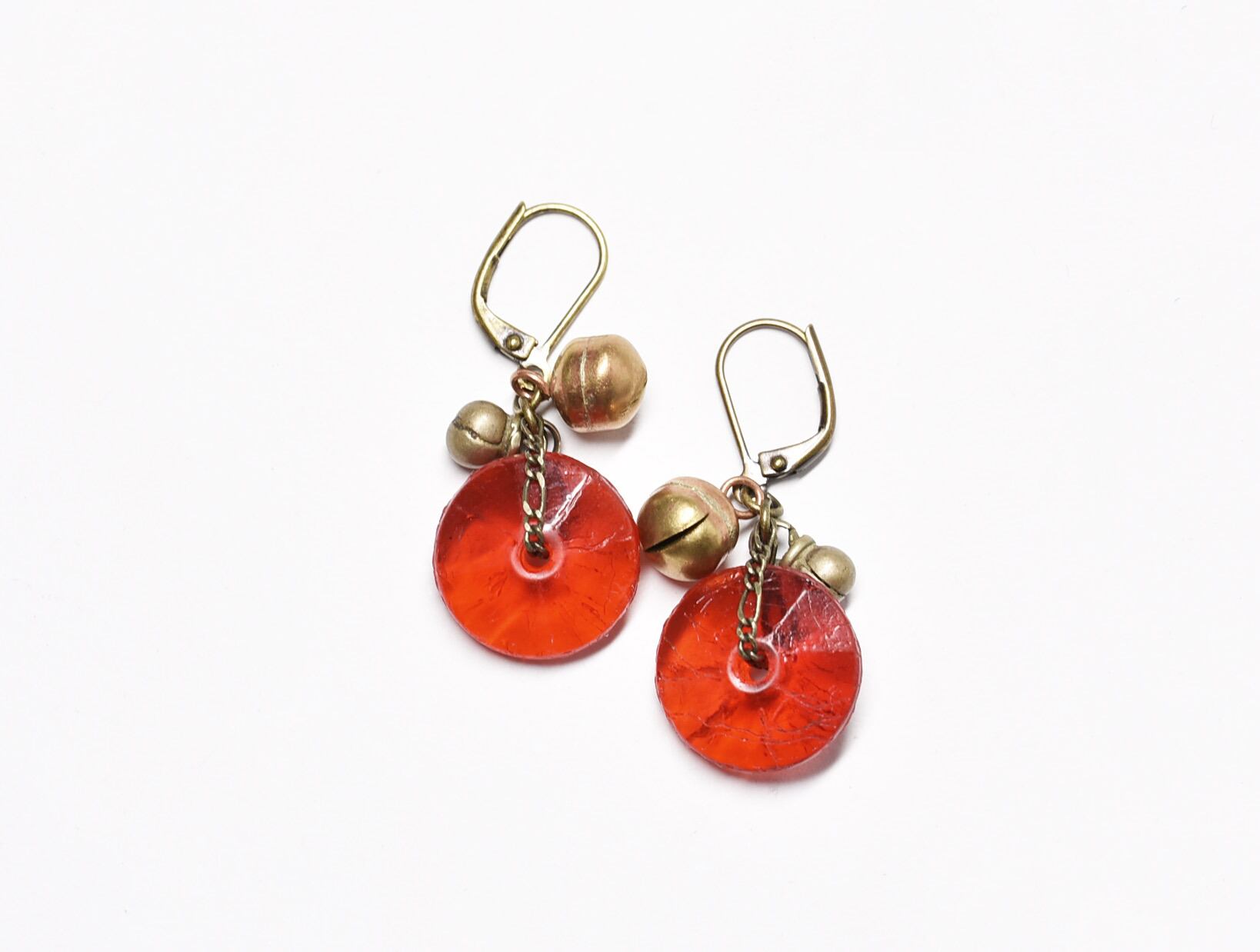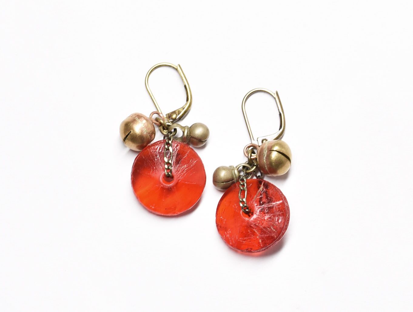 真っ赤なディスク型アンティークボヘミアビーズと2種類の鈴のピアス