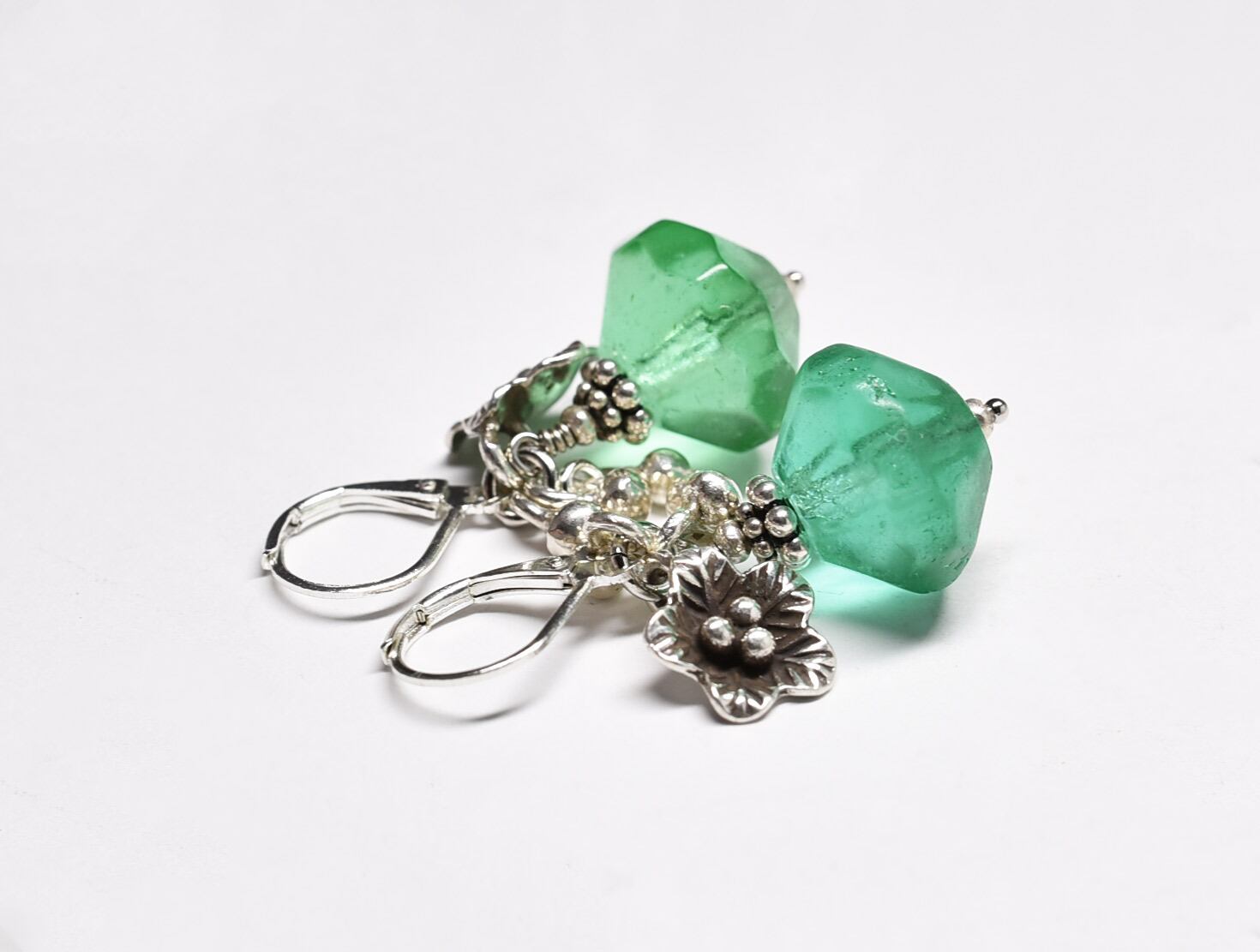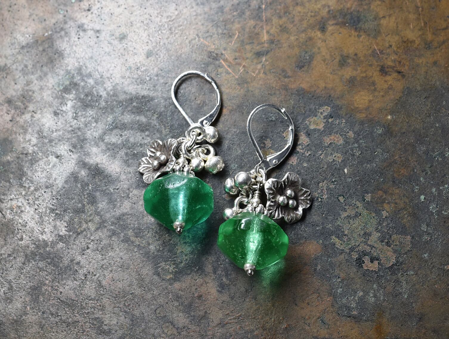 アンティークウランガラスとカレンシルバーのお花とツブツブチャームピアス