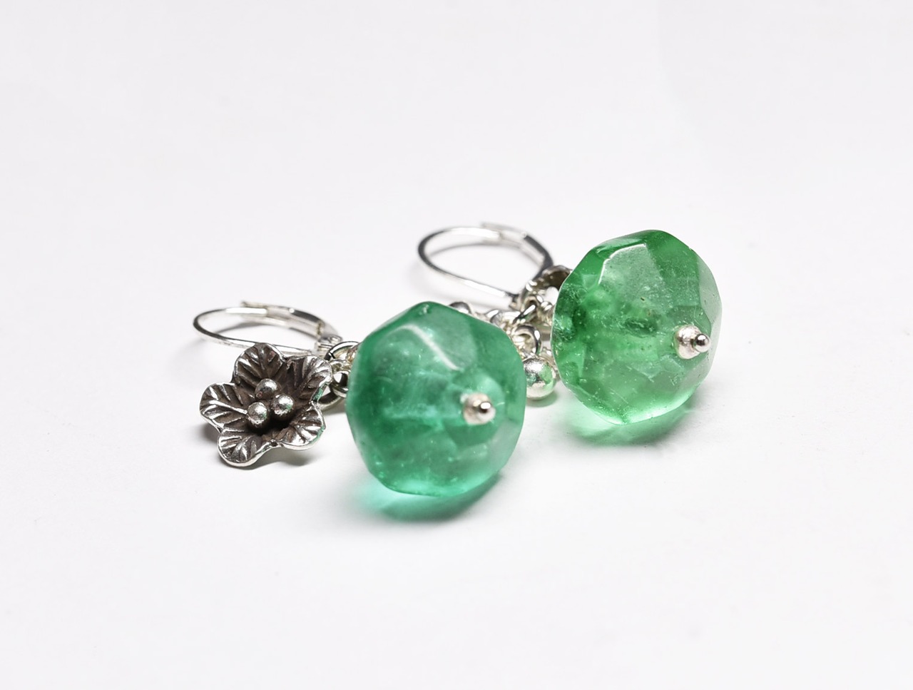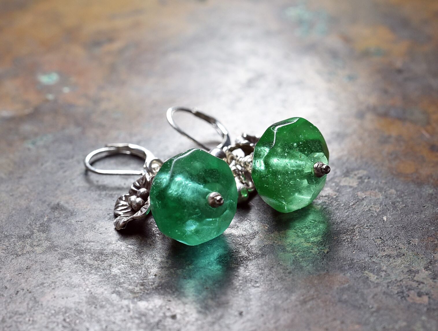 アンティークのウランガラスと、カレンシルバーのお花と小さなツブツブチャームを繋いだピアスです。