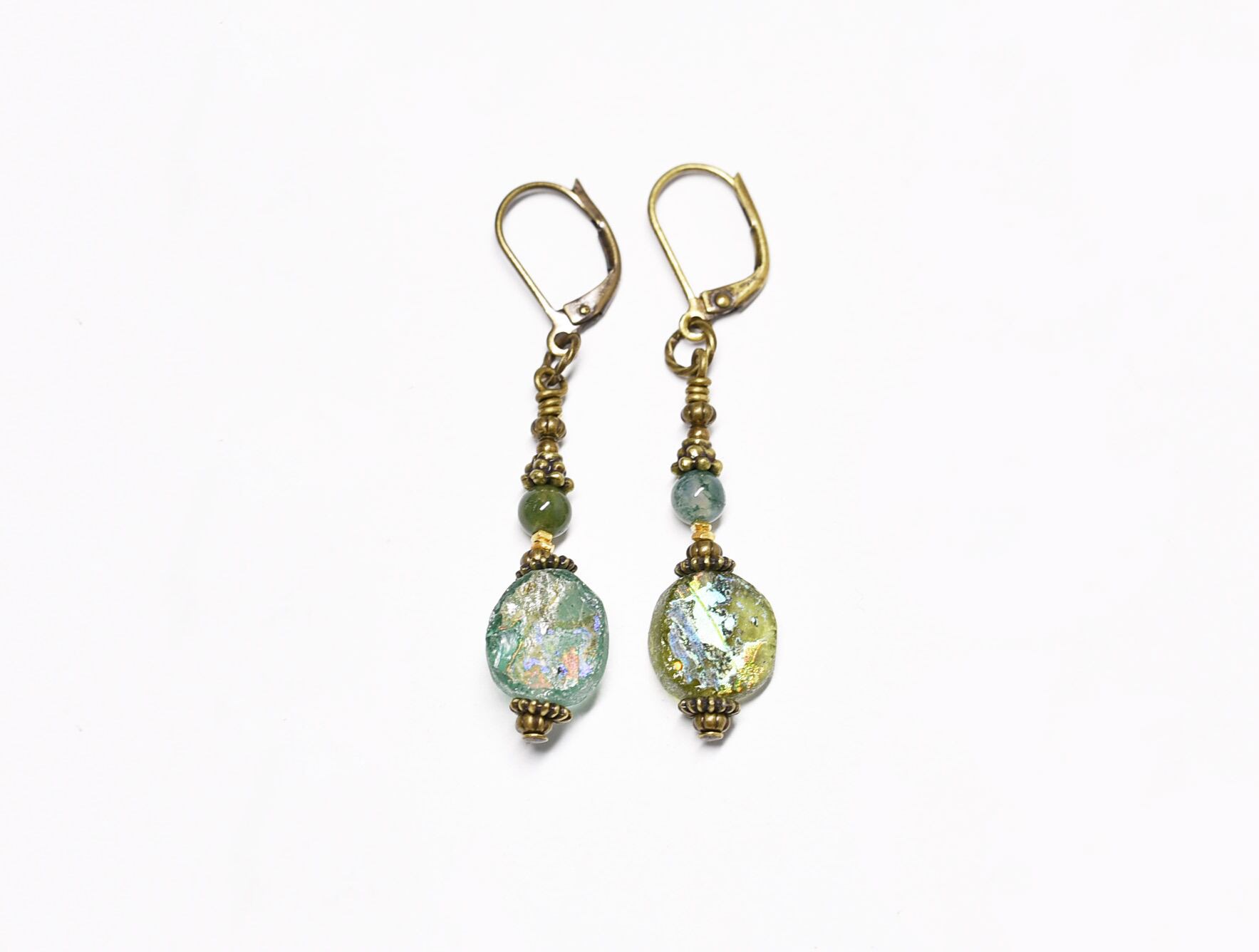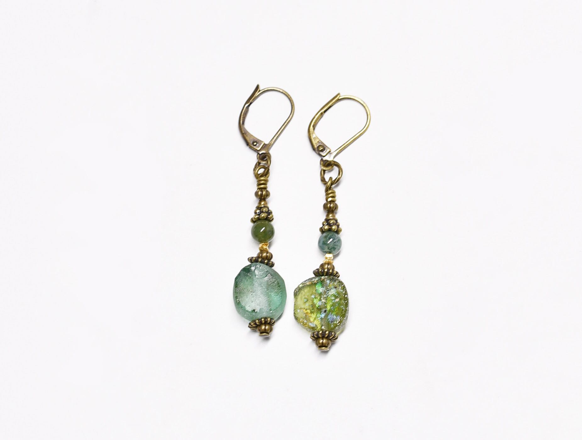 銀化淡いグリーン&オリーブグリーンローマングラスとモスアゲートの小ぶりなアンシメトリーピアス