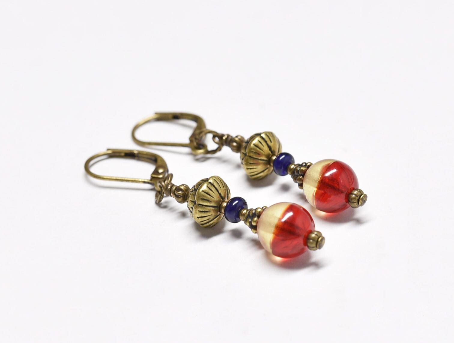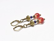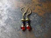 ウランガラスと瑠璃色のアンティークビーズ、蓮華ブラスビーズを繋いだピアスです。