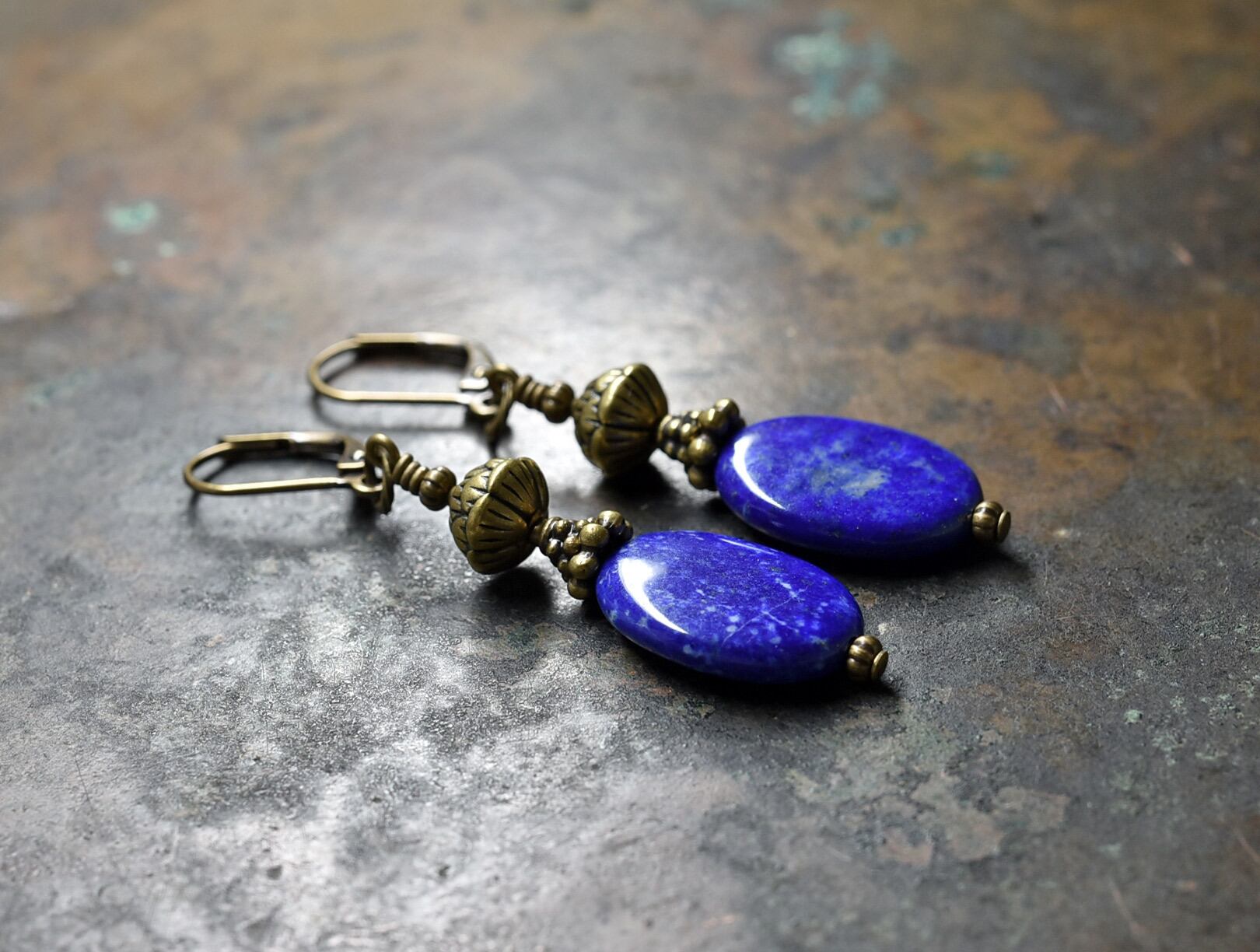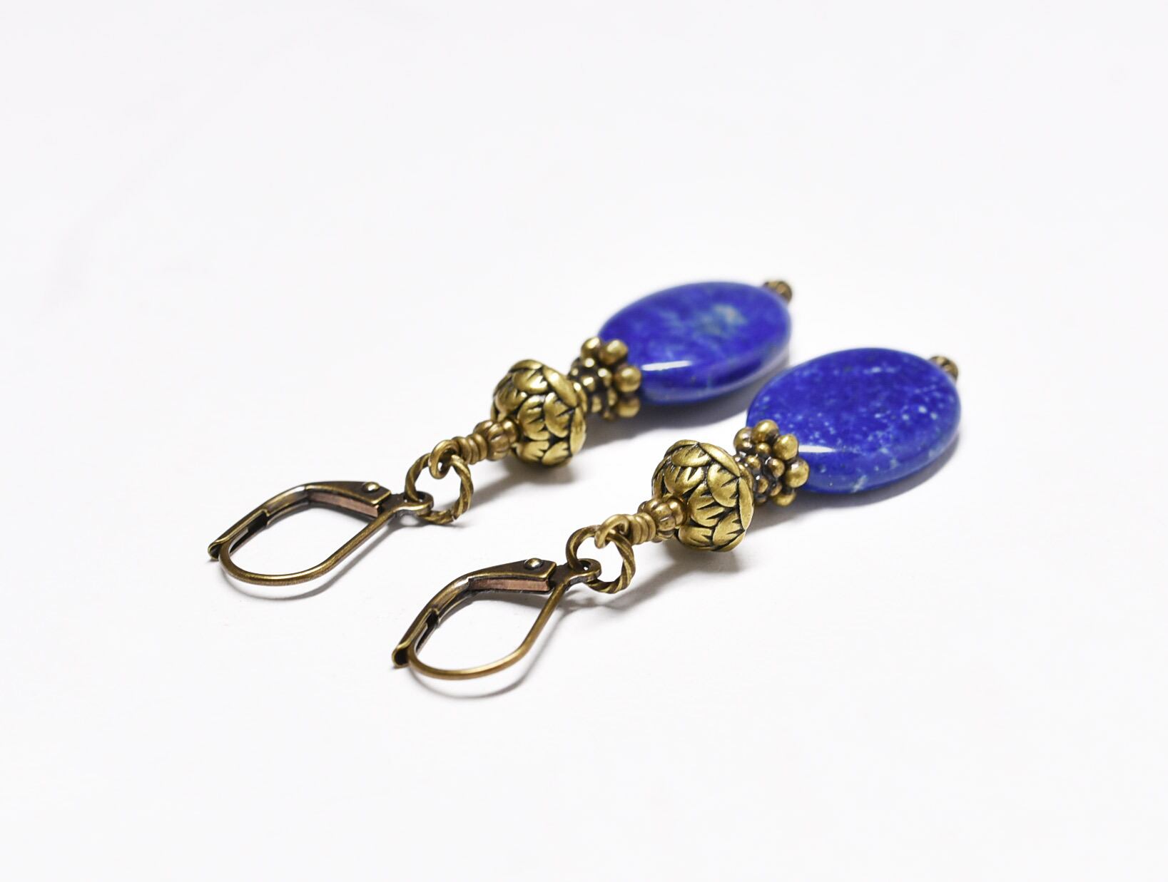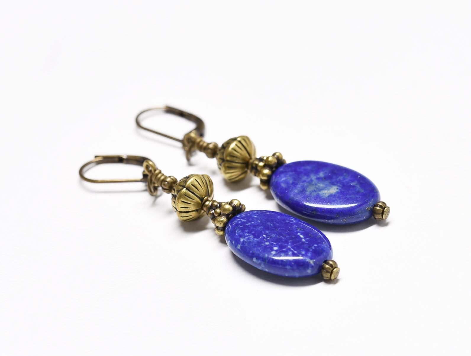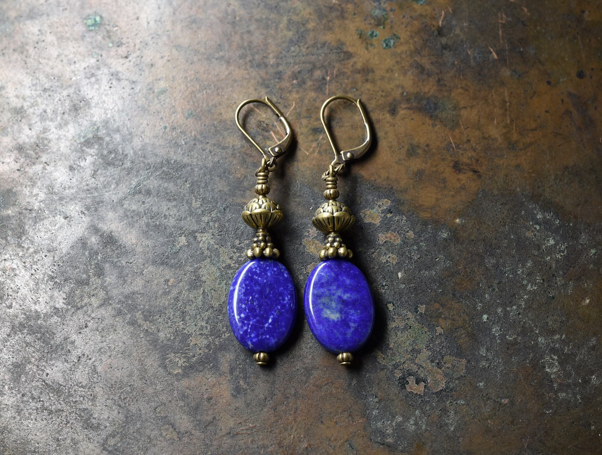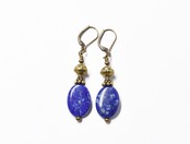オーバルラピスと蓮華ブラスビーズを繋いだピアスです。