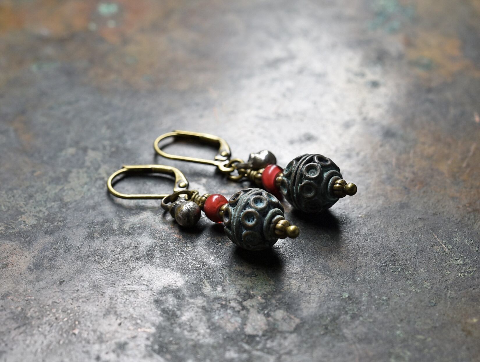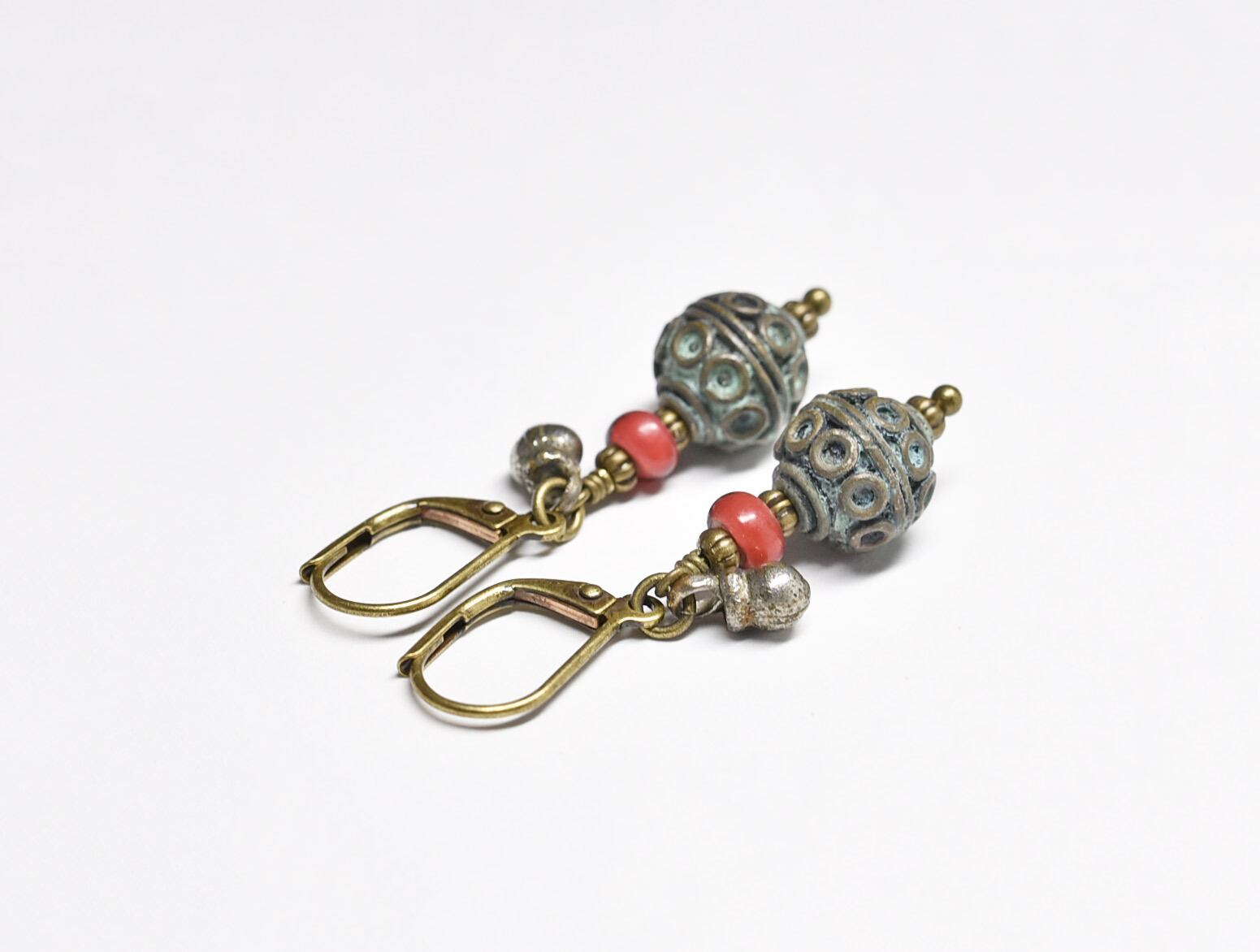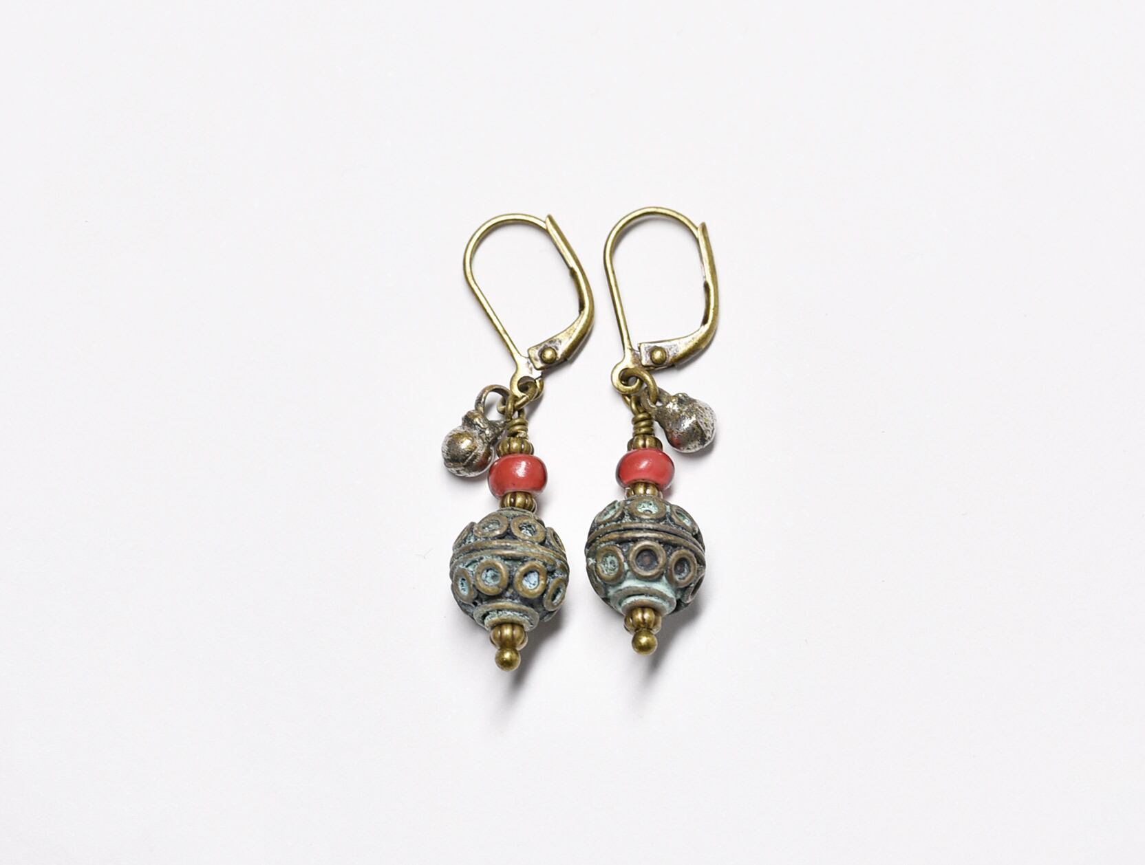 アフガニスタンメタルパーツと金赤ホワイトハーツ、民族鈴を繋いだピアスです。