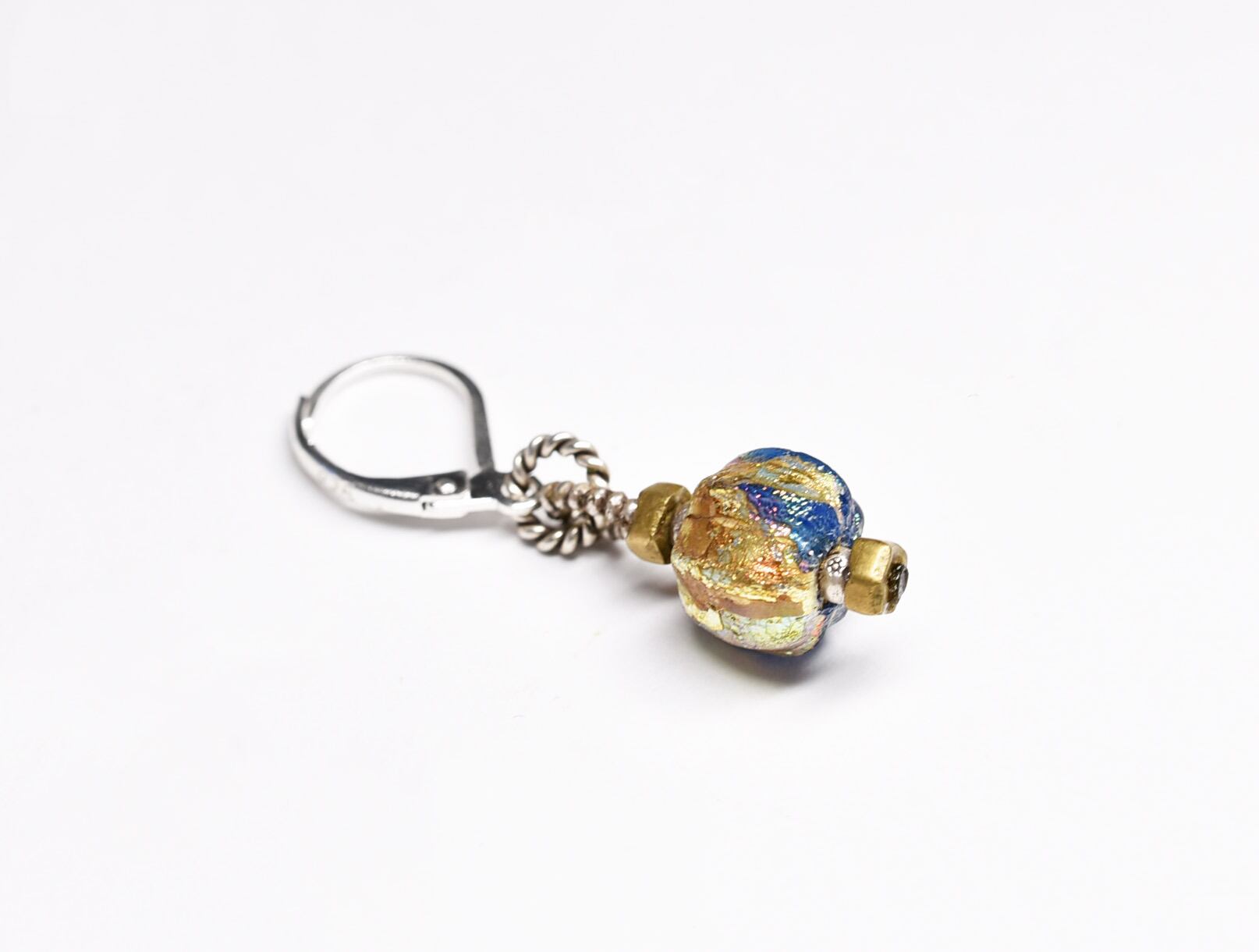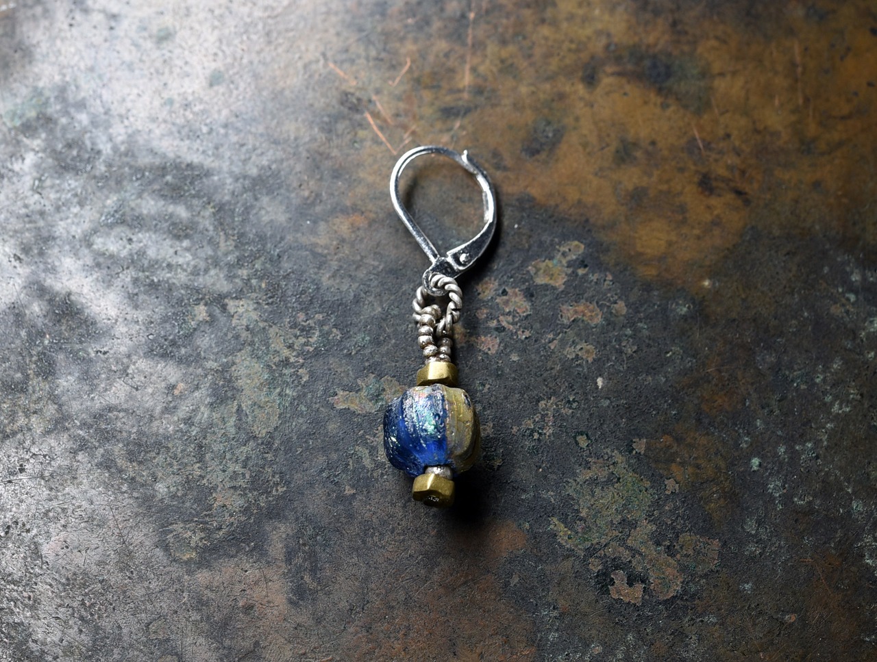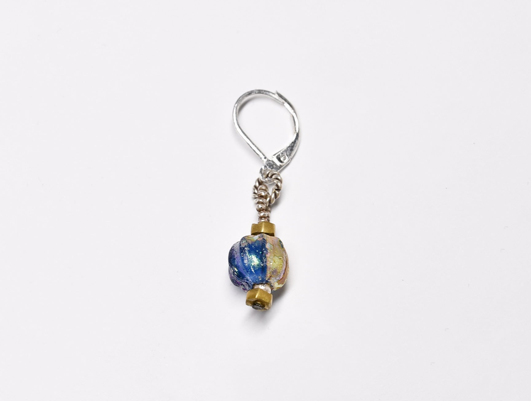 素晴らしい銀化と金化の輝きが見られる筋の施されたローマングラスの片耳ピアスです。