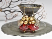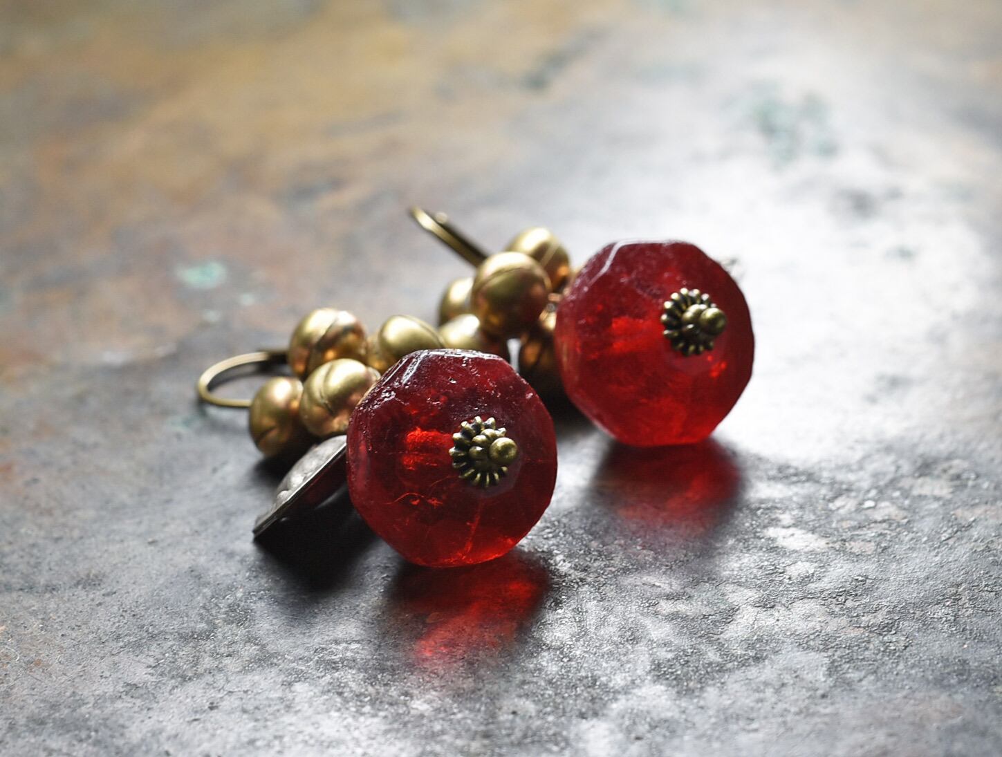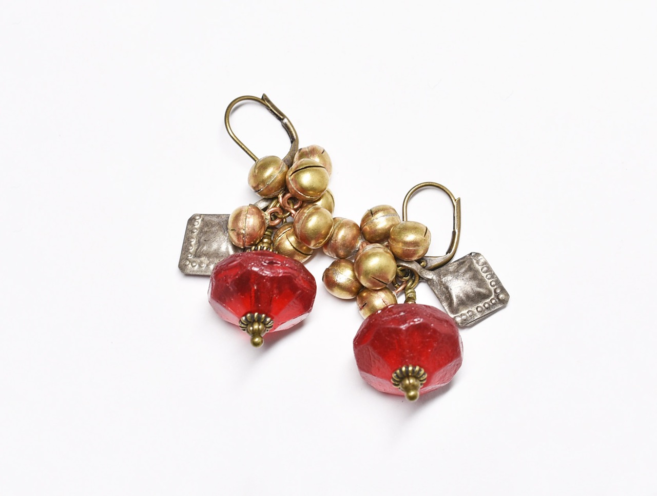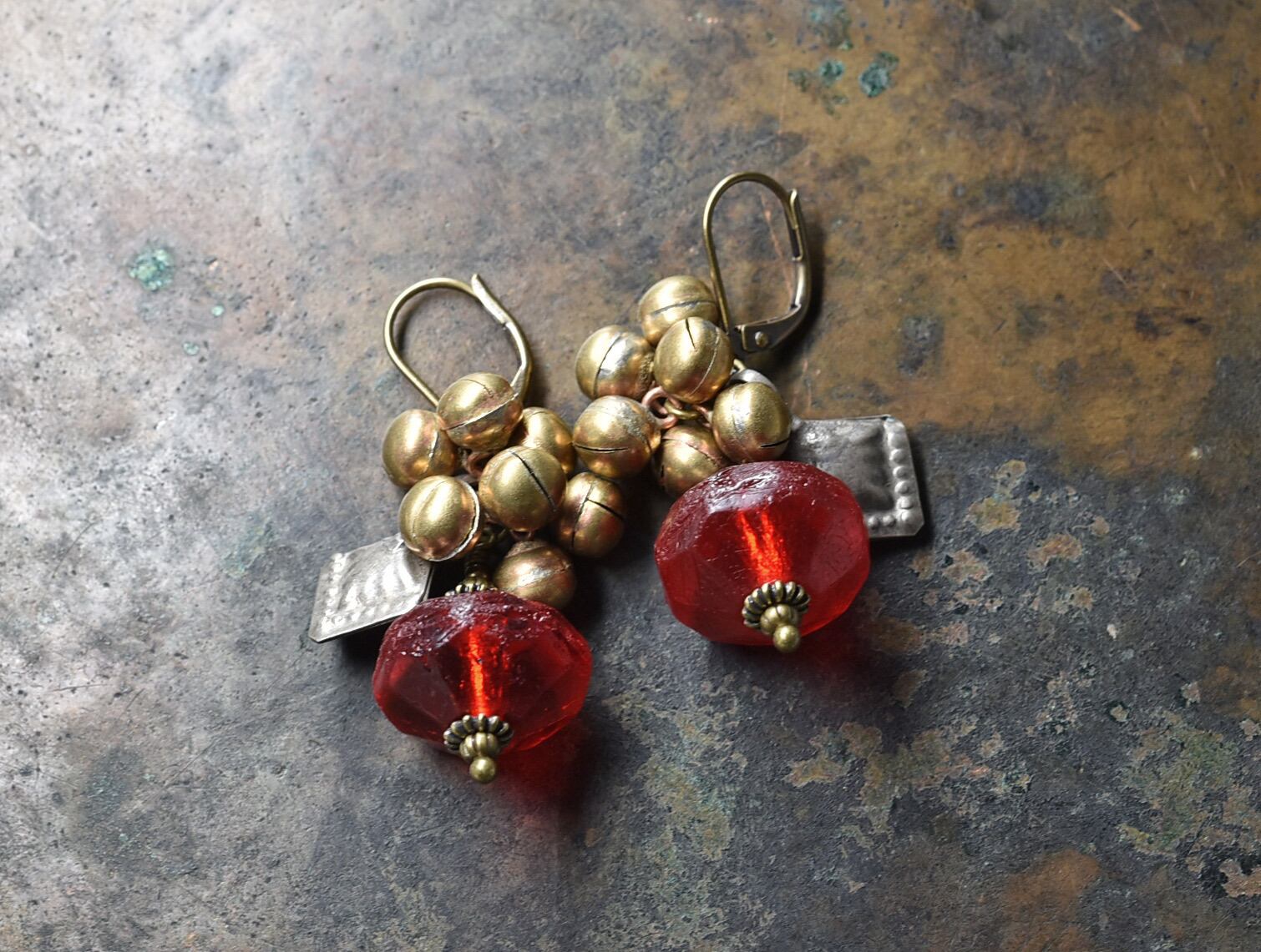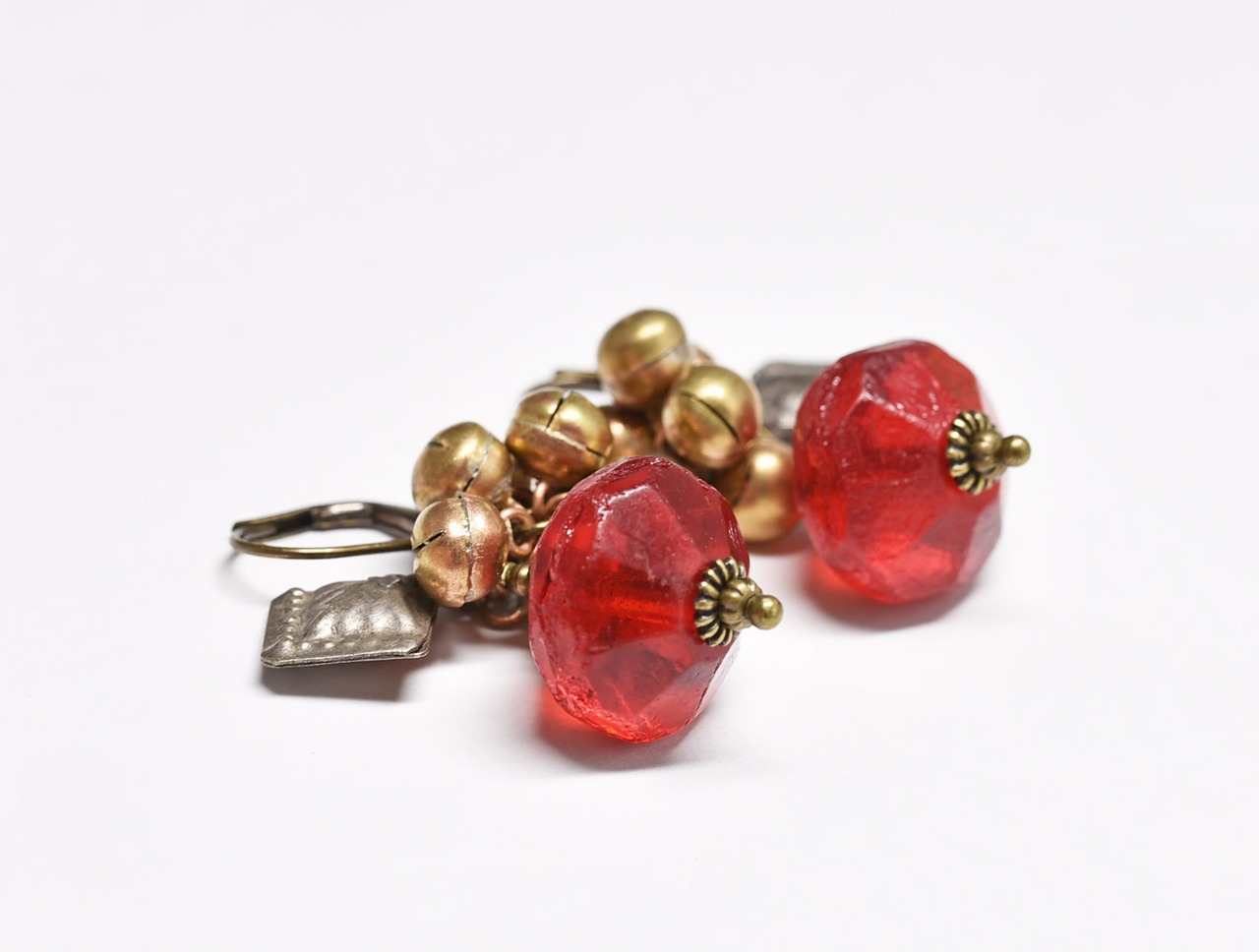 真っ赤な算盤型アンティークボヘミアビーズとたわわな鈴、アフガンパーツのピアス