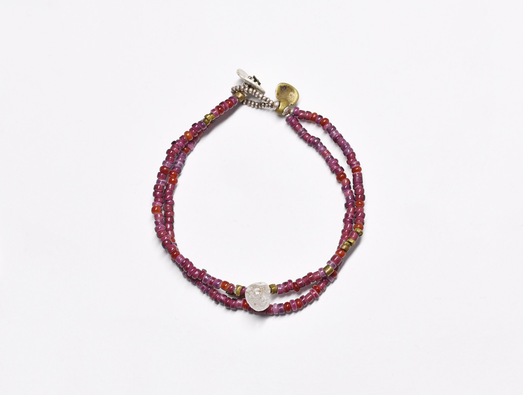 濃淡のある紫色や赤色のビーズはホワイトハーツと呼ばれるアンティークビーズです。