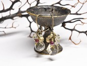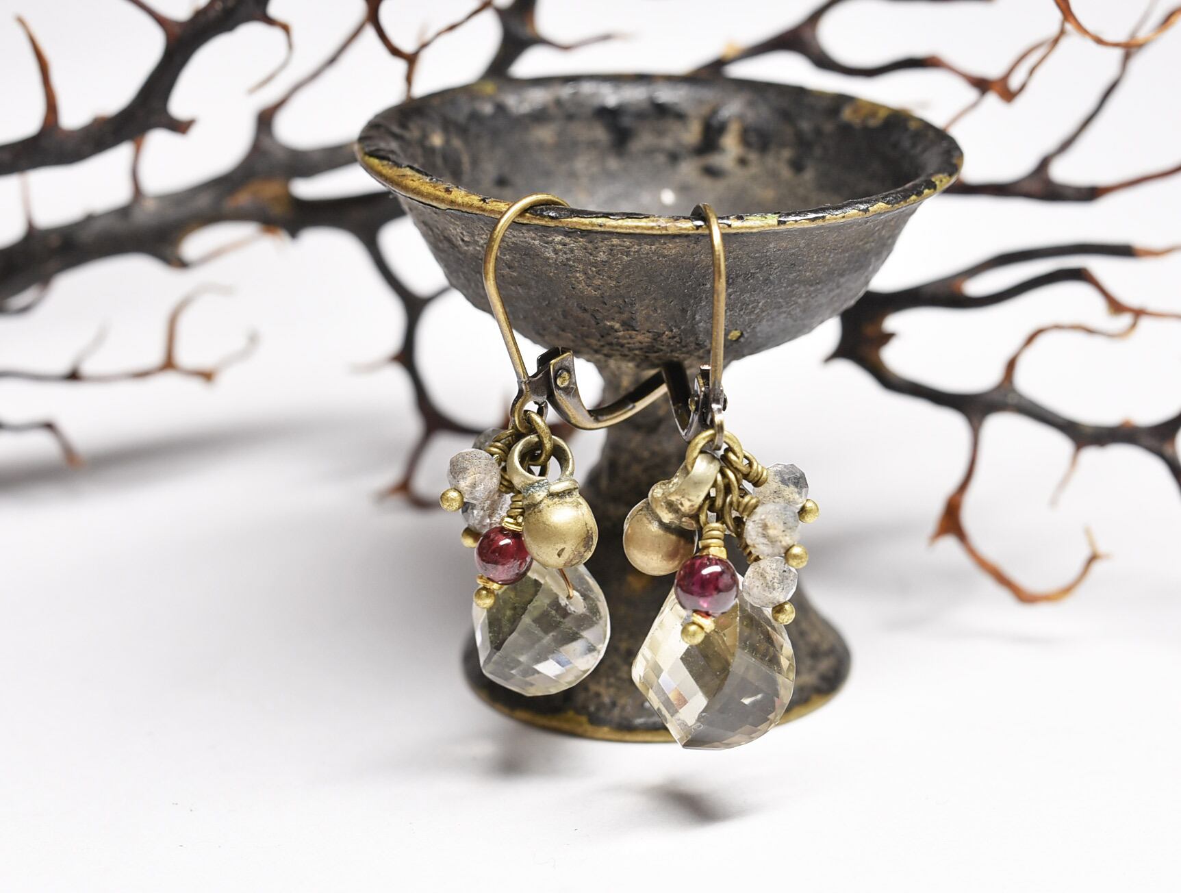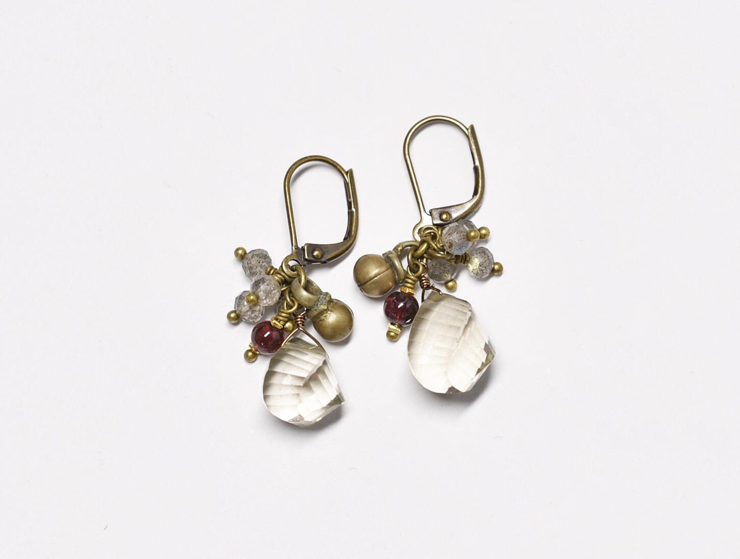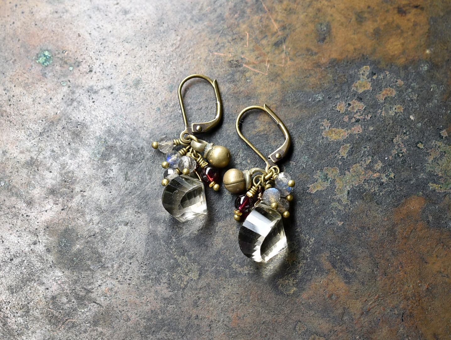 スモーキークォーツ、ラブラドライト、ガーネットと民族鈴のピアス