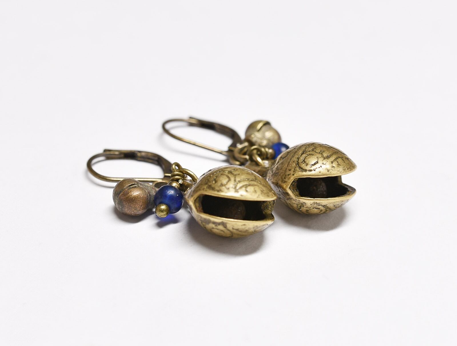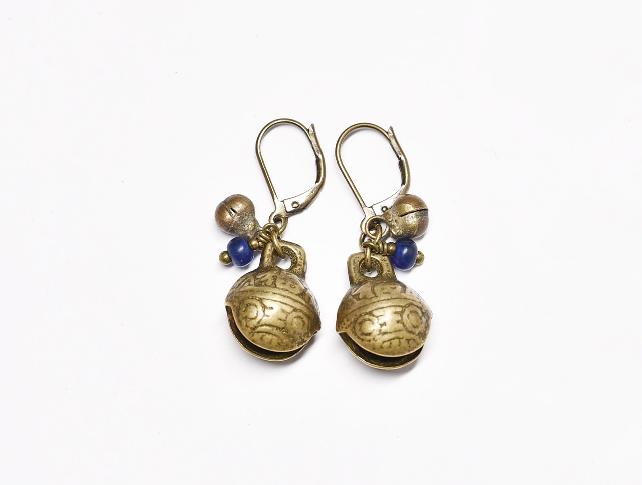 デッドストックベルと民族鈴、ダークブルービーズを繋いだピアスです。