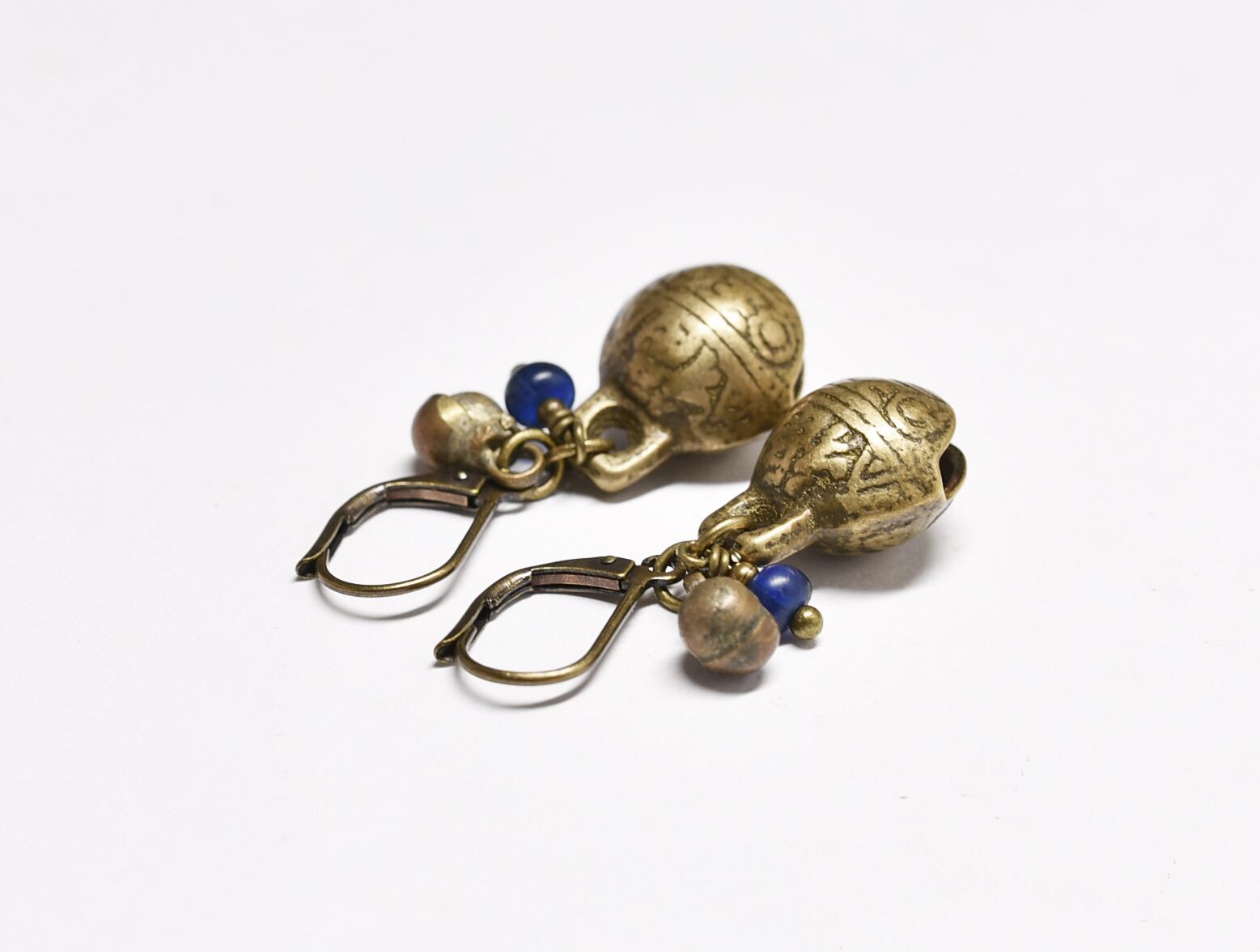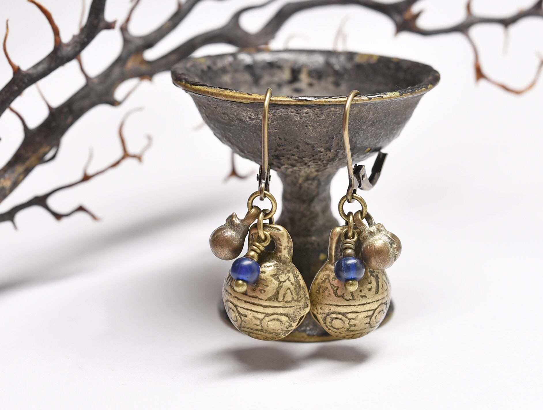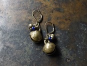 デッドストックベルと民族鈴、ダークブルービーズのピアス