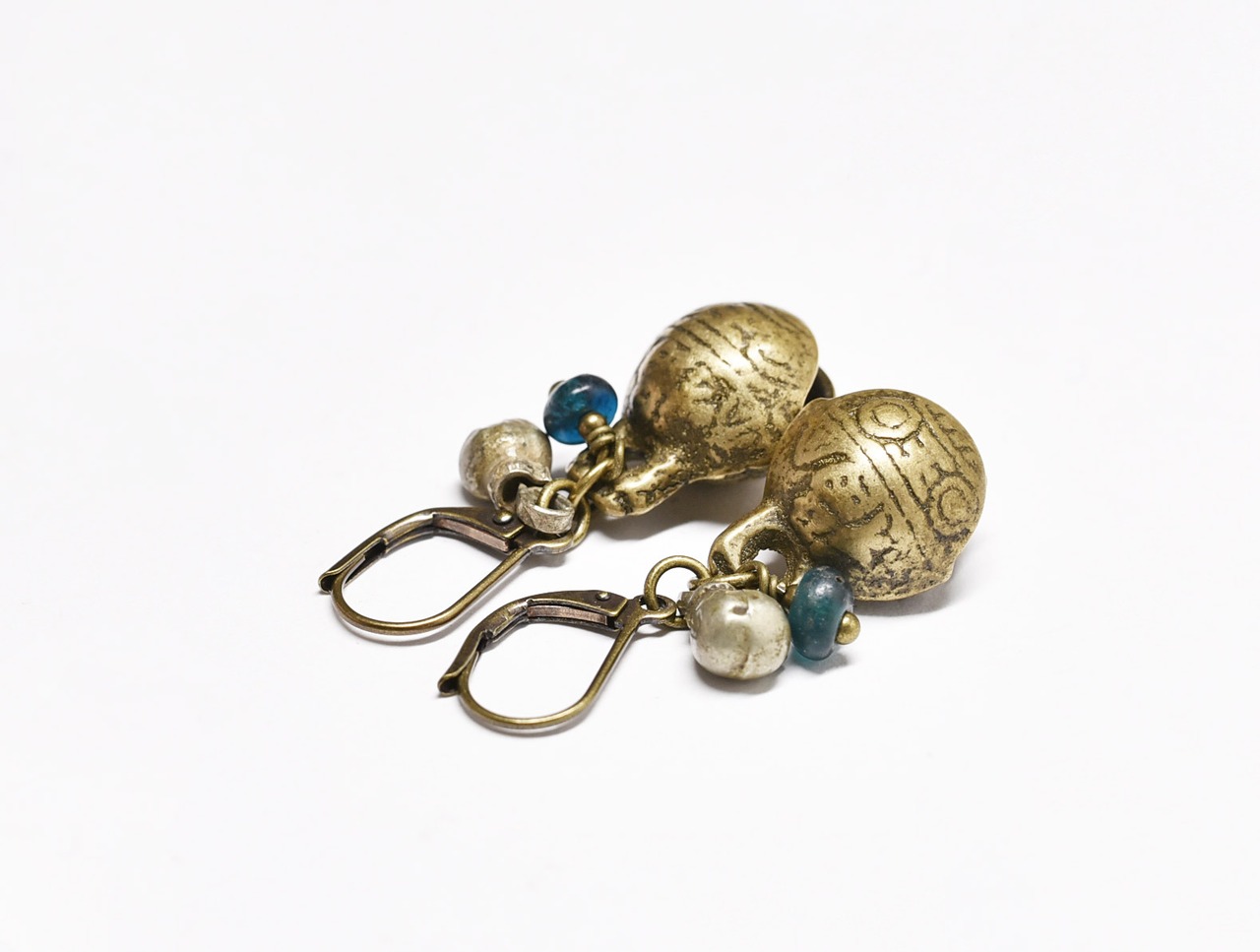 デッドストックベルと民族鈴、インディゴブルービーズのピアス