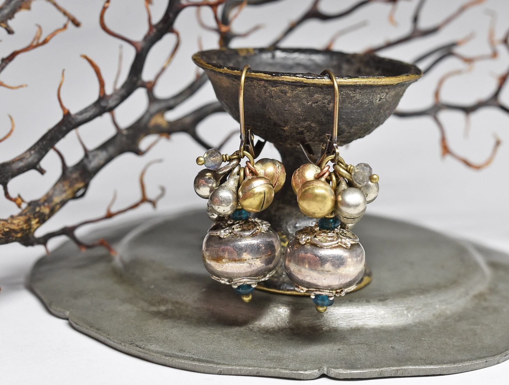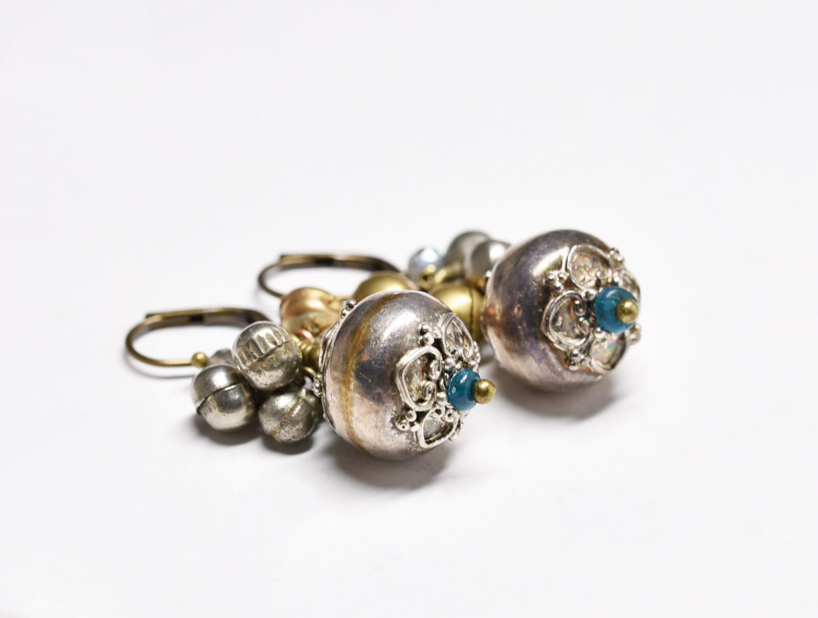 ぽってりoldシルバーとたわわな鈴、エメラルドブルービーズとラブラドライトを繋いだピアスです。
