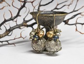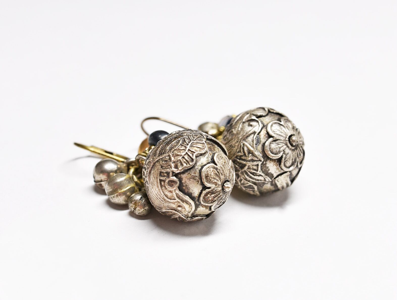繊細な細工が施されたoldシルバーとたわわな鈴、エメラルドブルービーズとラブラドライトを繋いだピアスです。