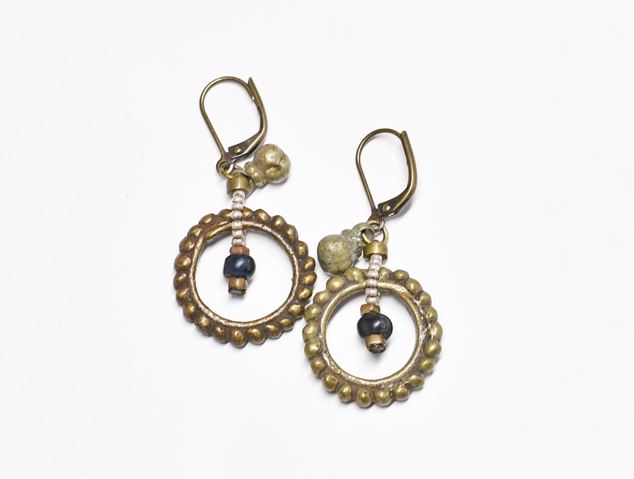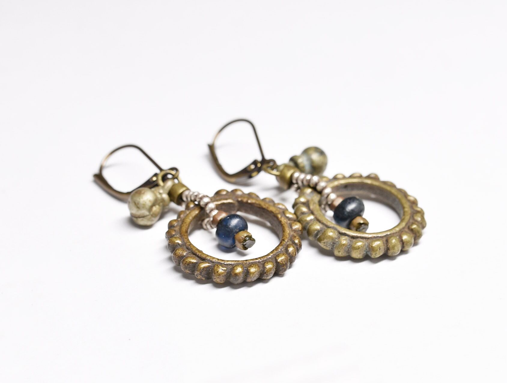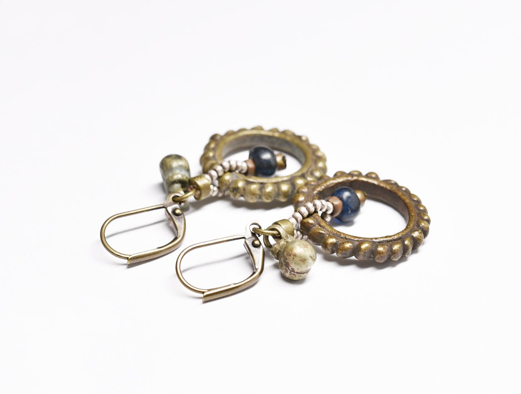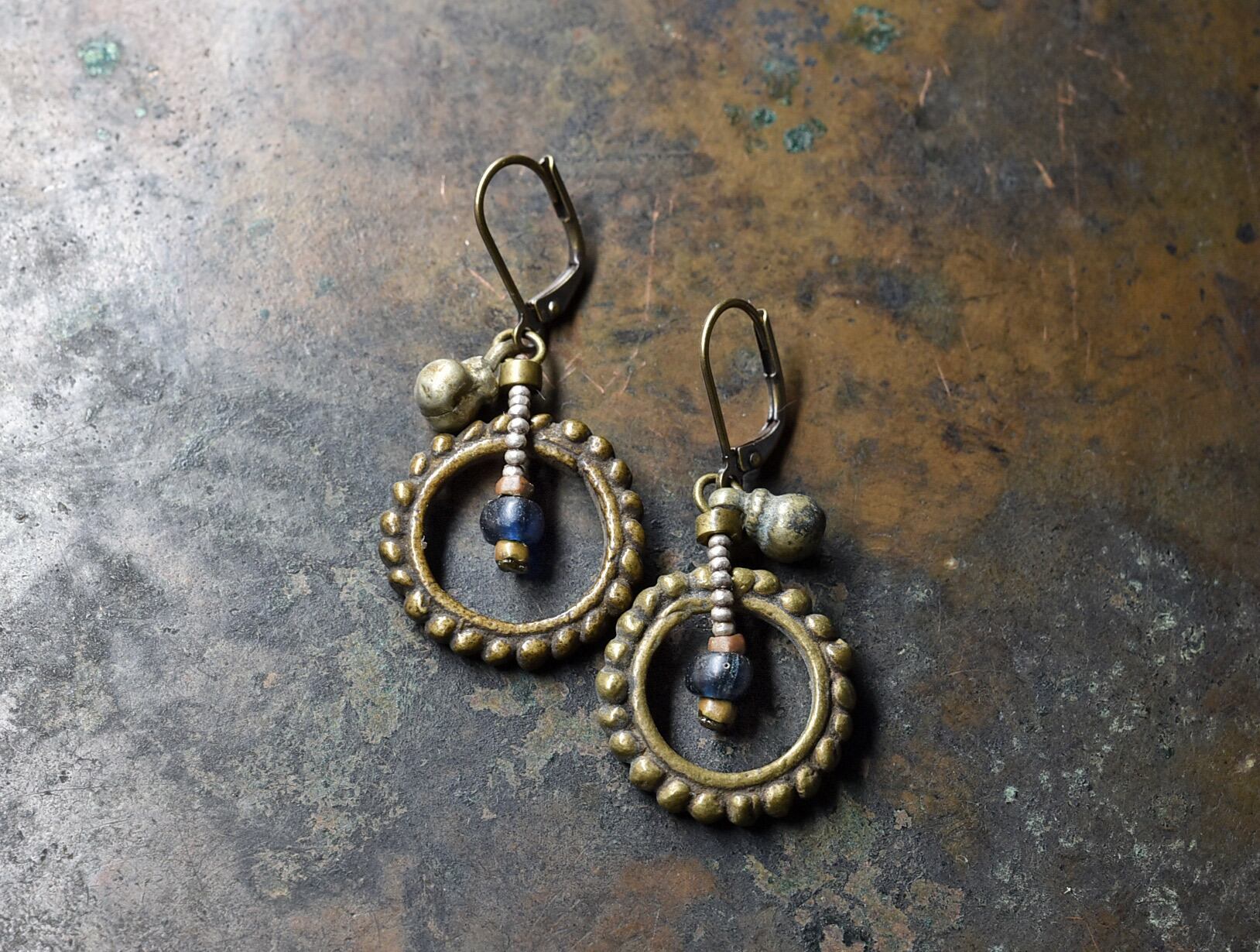 oldインドリングと一粒のダークブルーアンティークビーズ、oldオリッサブラス、小さなカレンシルバー、民族鈴を繋いだピアスです。