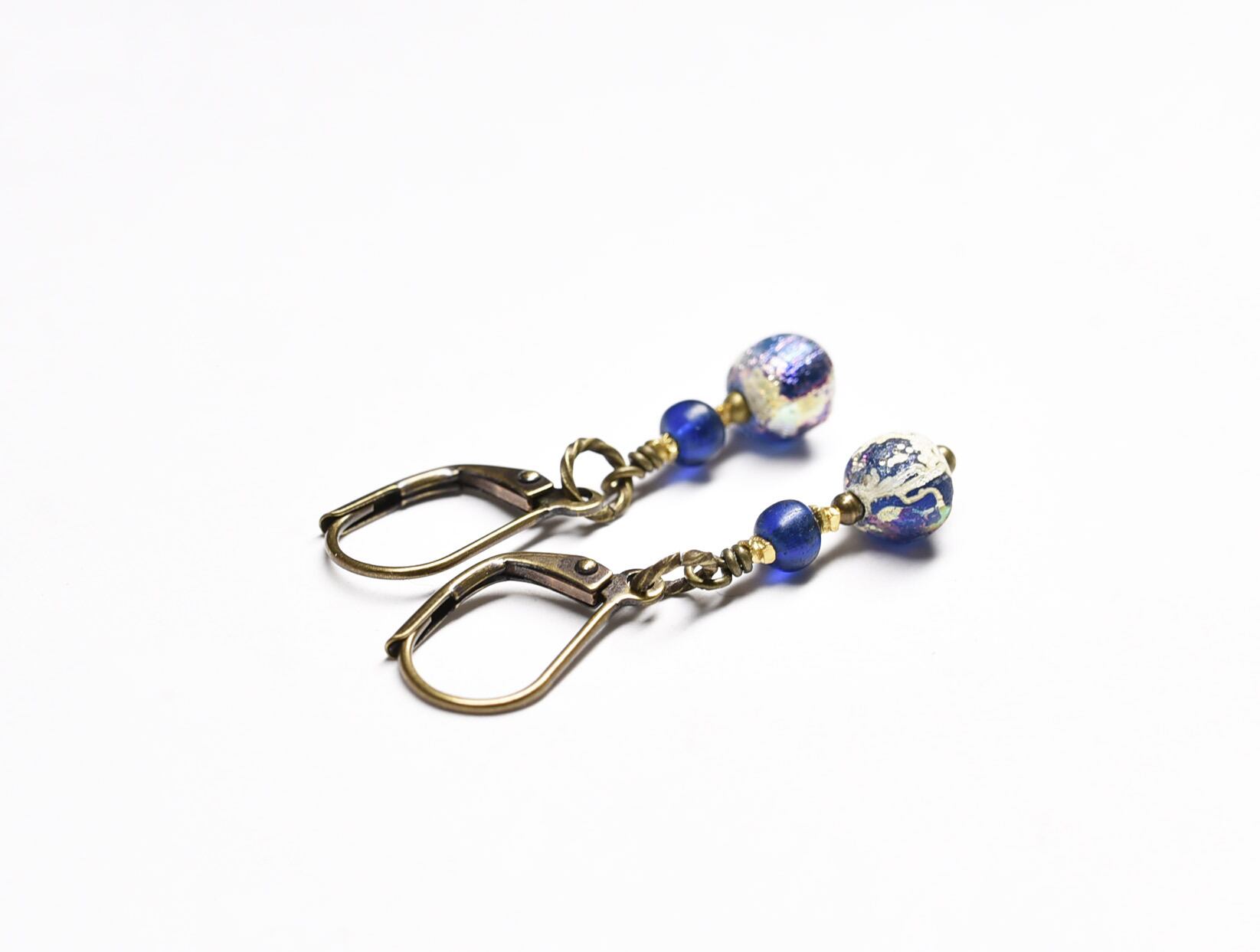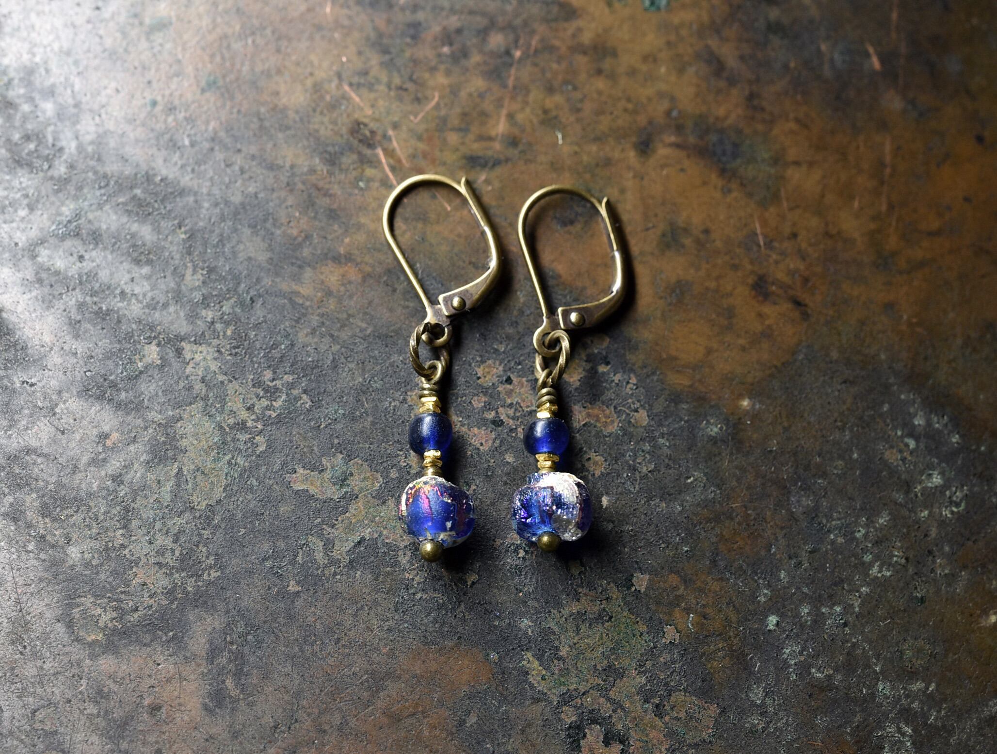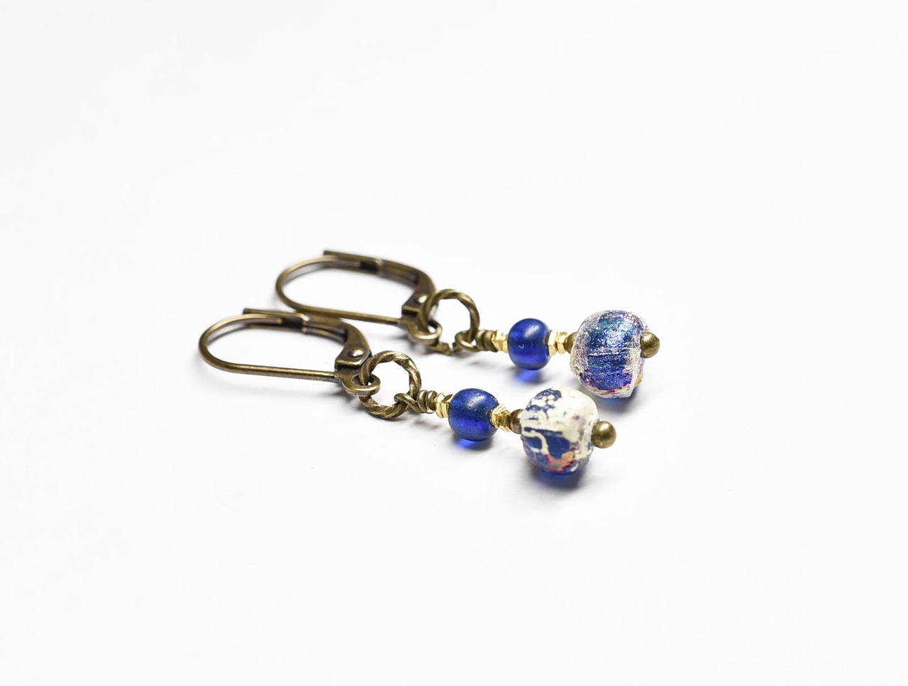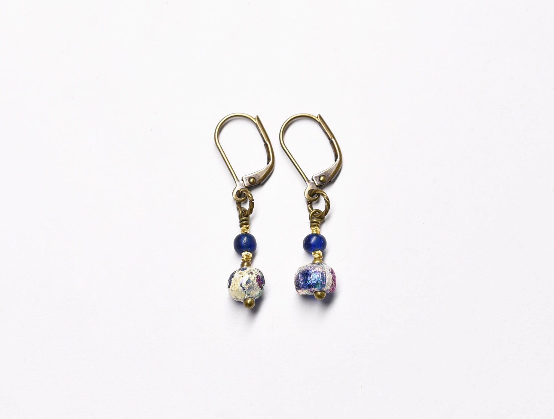 美しい銀化ローマングラスビーズとダークブルーアンティークビーズの小さなピアス
