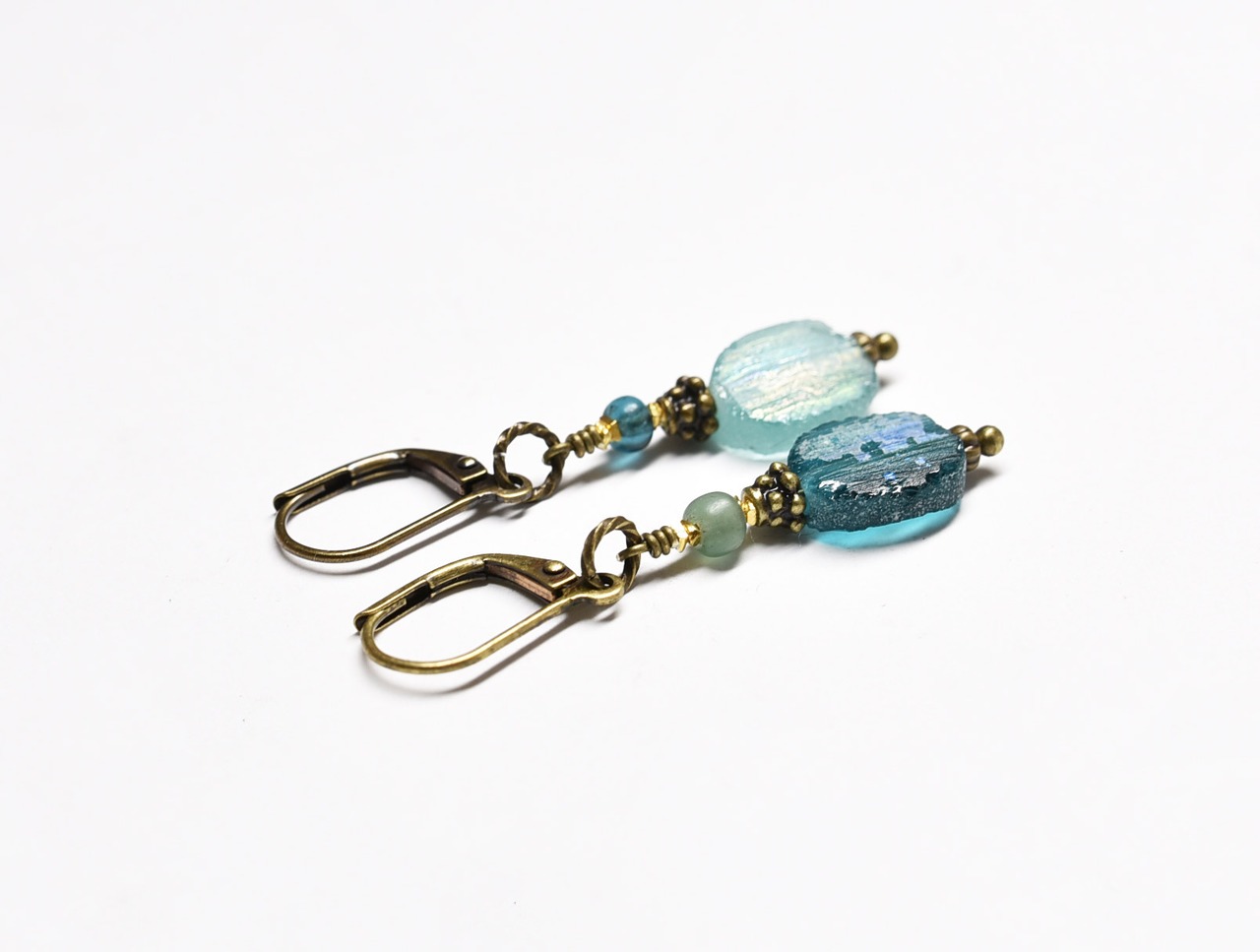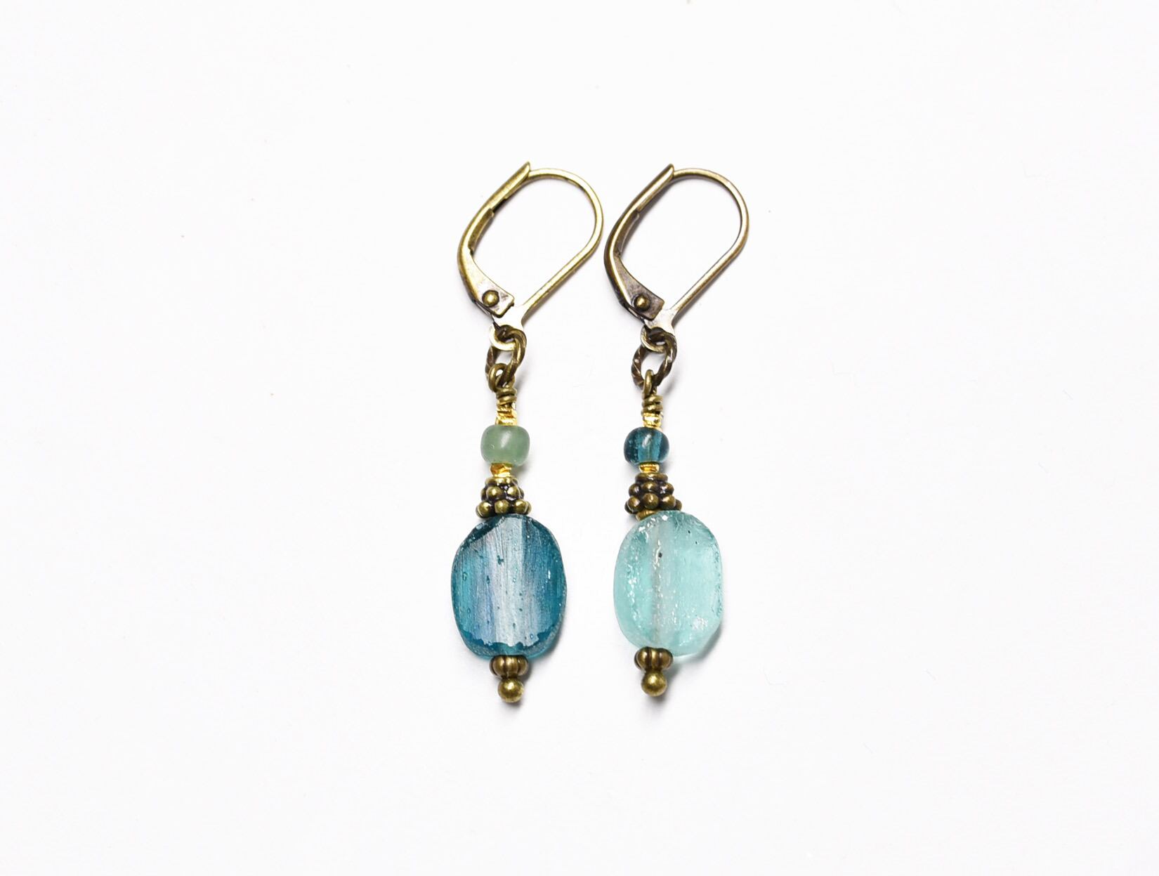 ソーダブルー&ブルーグリーン銀化ローマングラスのカラーアンシメトリーピアス
