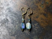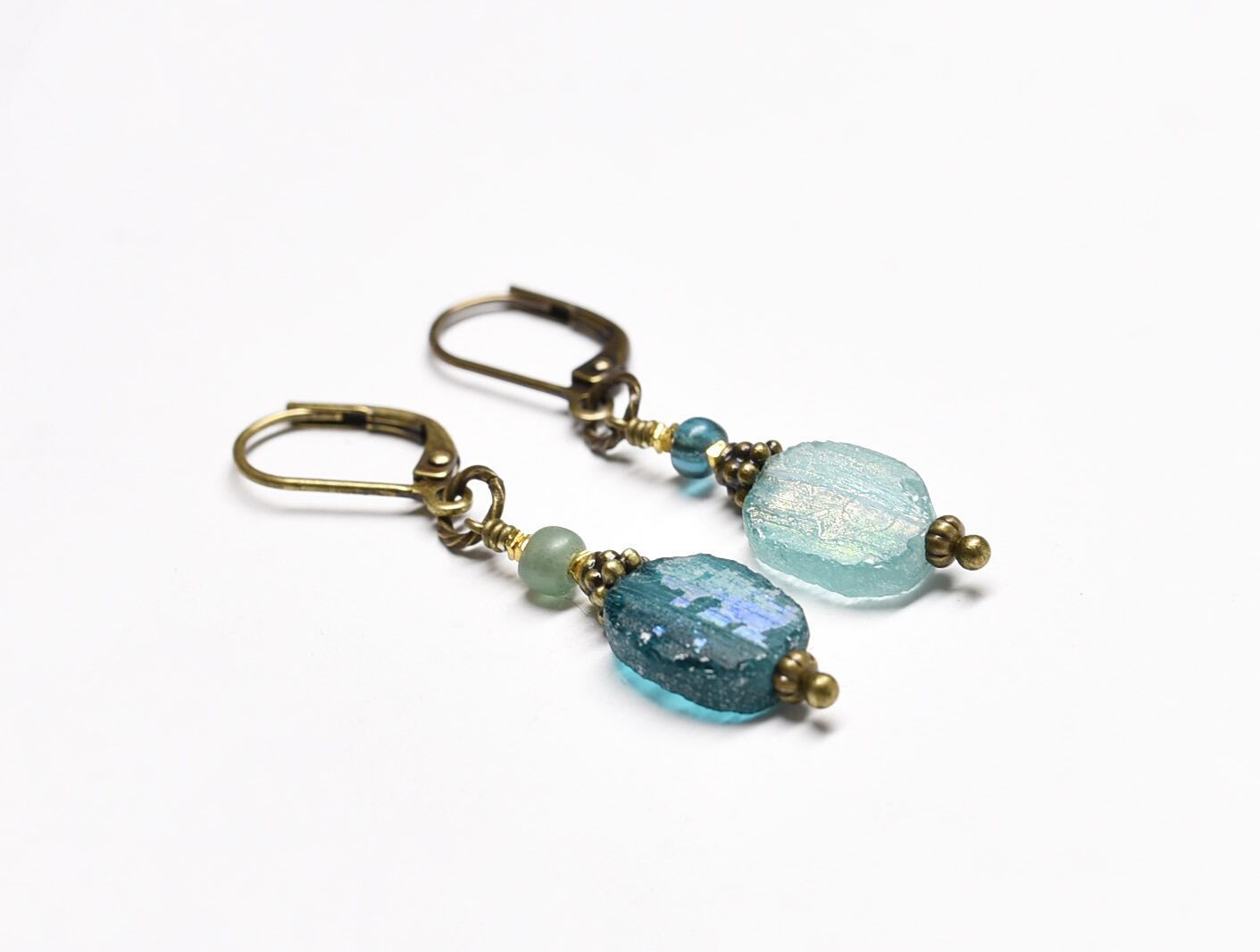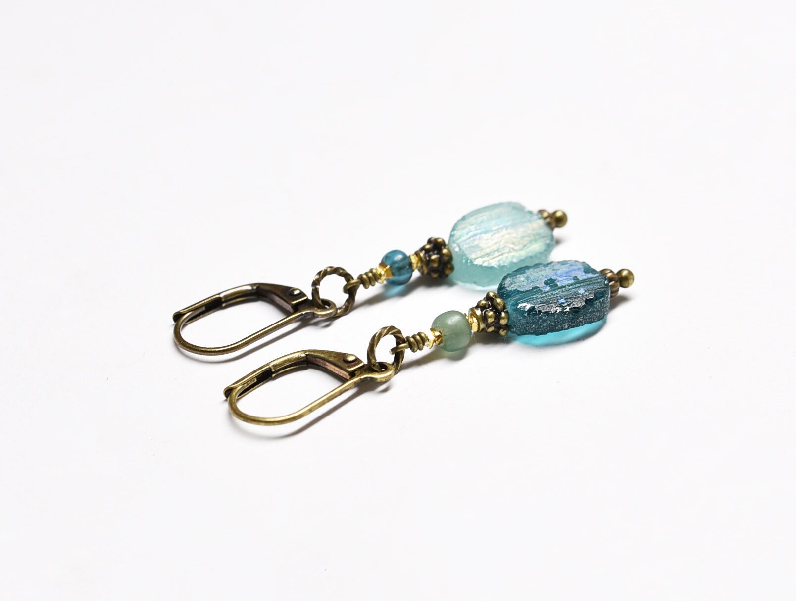 銀化したローマングラスと小さなアンティークビーズを繋いだカラーアンシメトリーなピアスです。