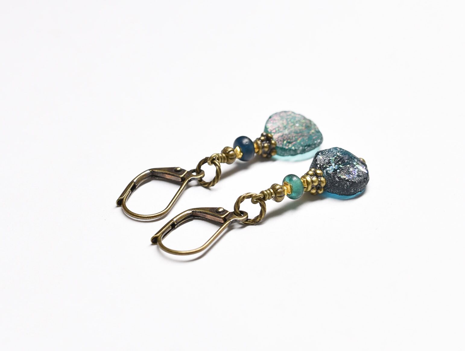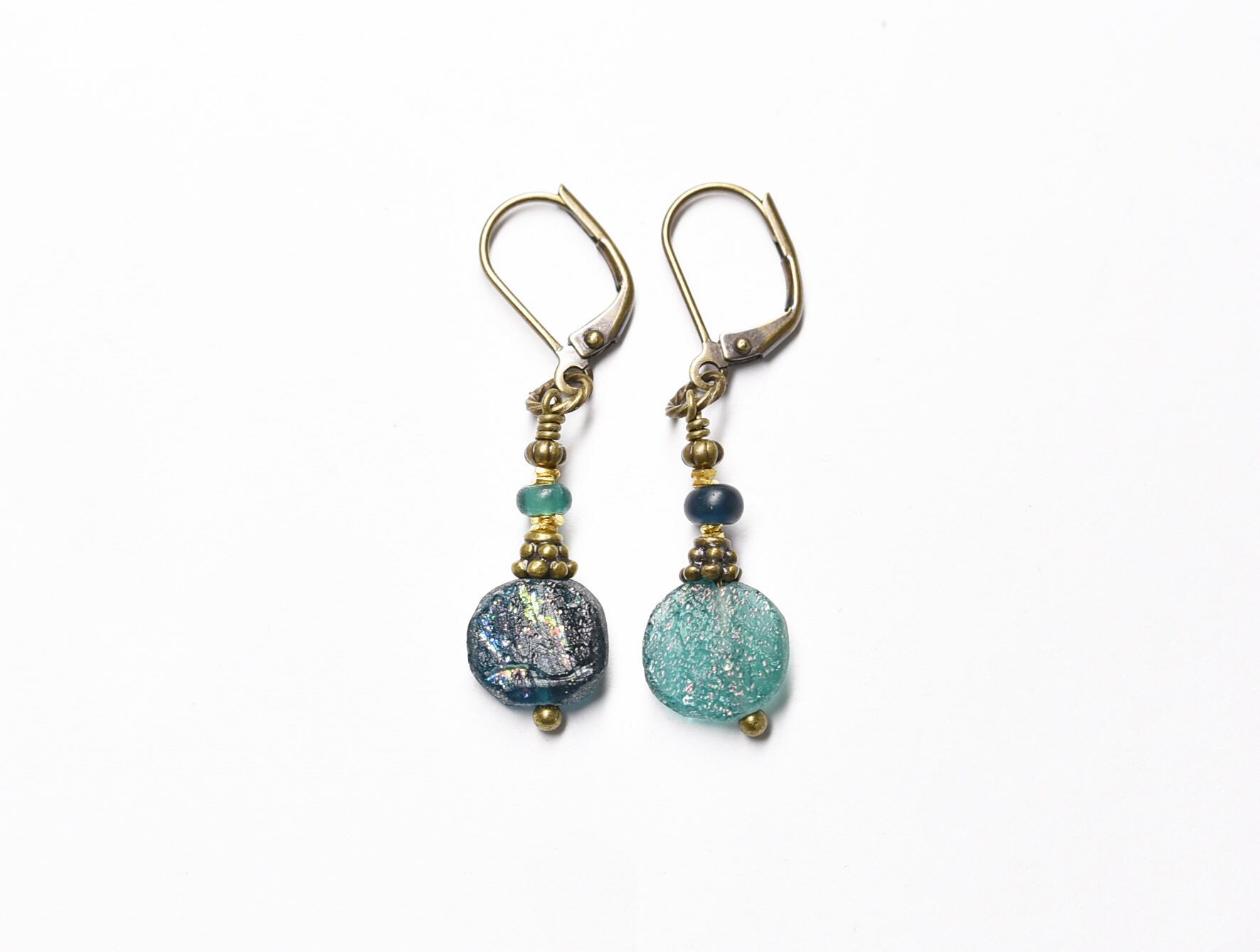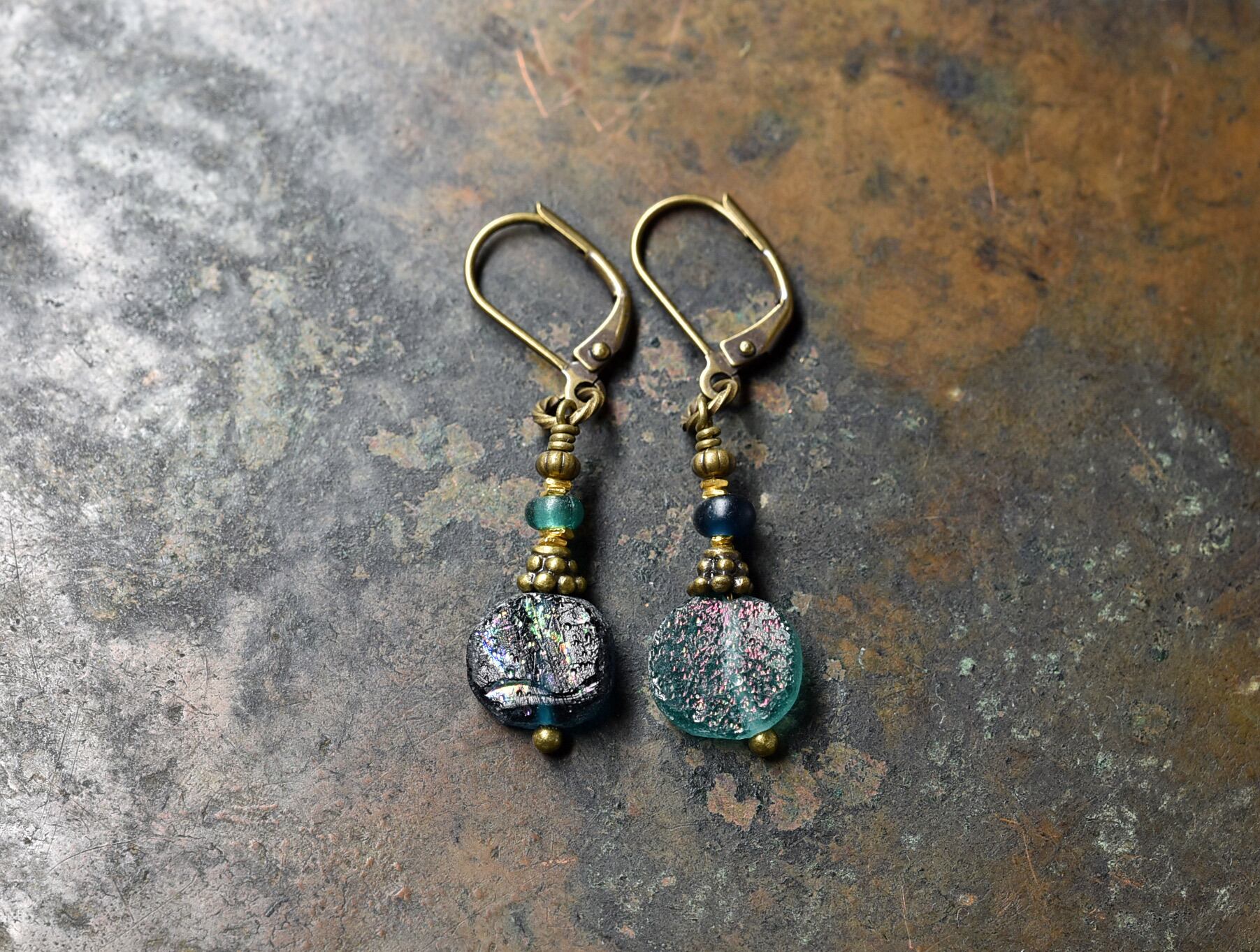銀化したローマングラスと小さなアンティークビーズを繋いだカラーアンシメトリーなピアスです。