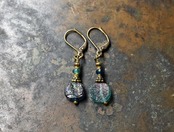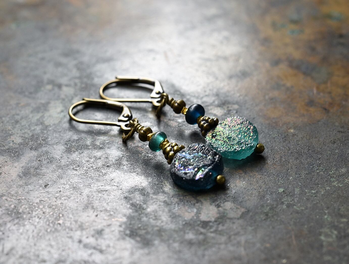 ダークグリーン&ブルーグリーン銀化ローマングラスのカラーアンシメトリーピアス