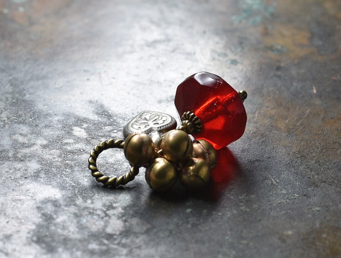 真っ赤算盤型アンティークビーとたわわな鈴、アフガンメタルパーツを繋いだペンダントトップです。