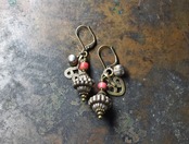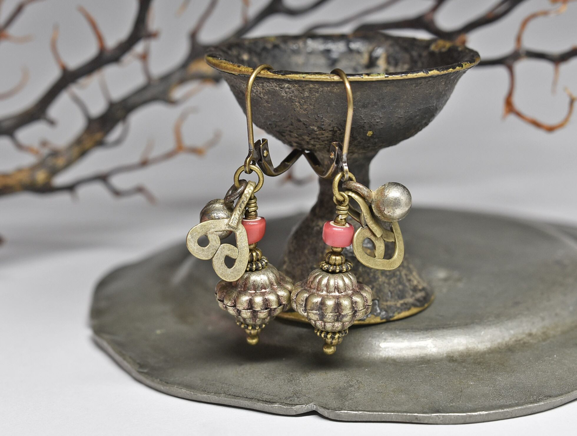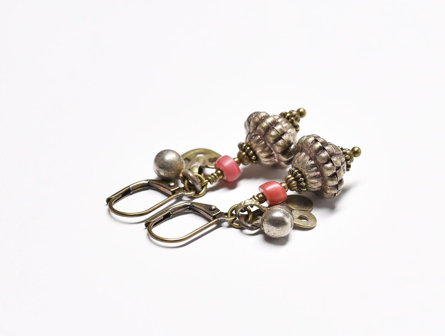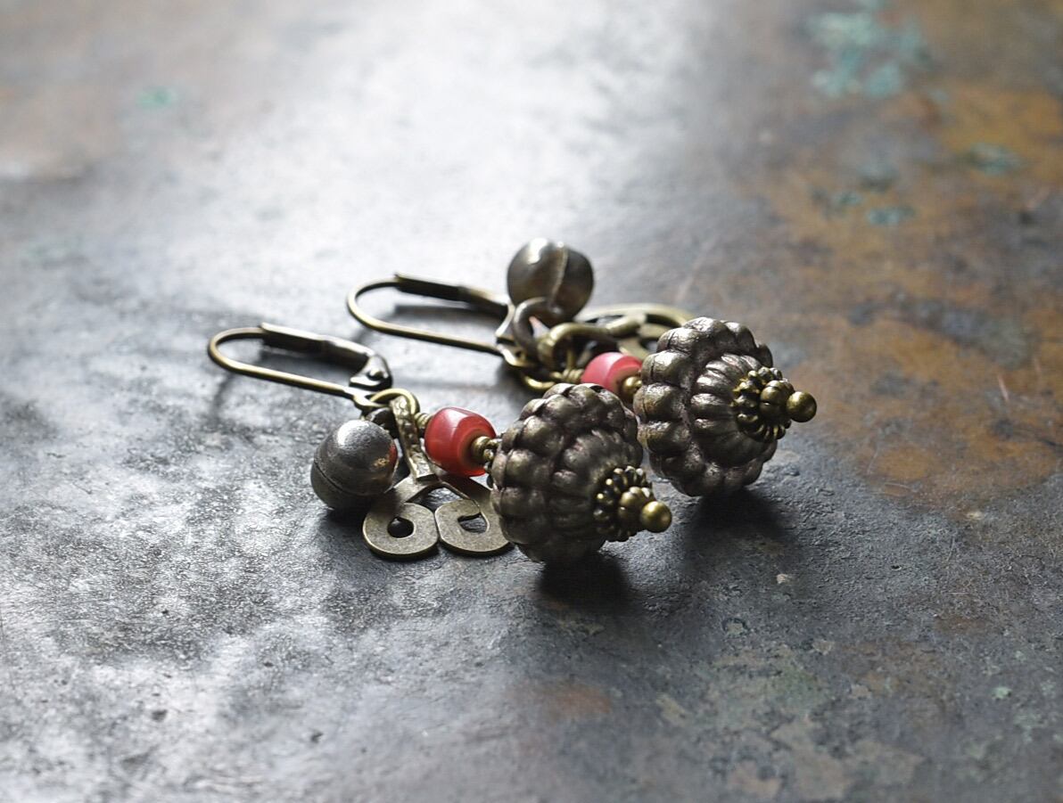 インドメタルビーズと金赤ホワイトハーツ、アフガンメタルパーツ、小さな鈴のピアス