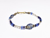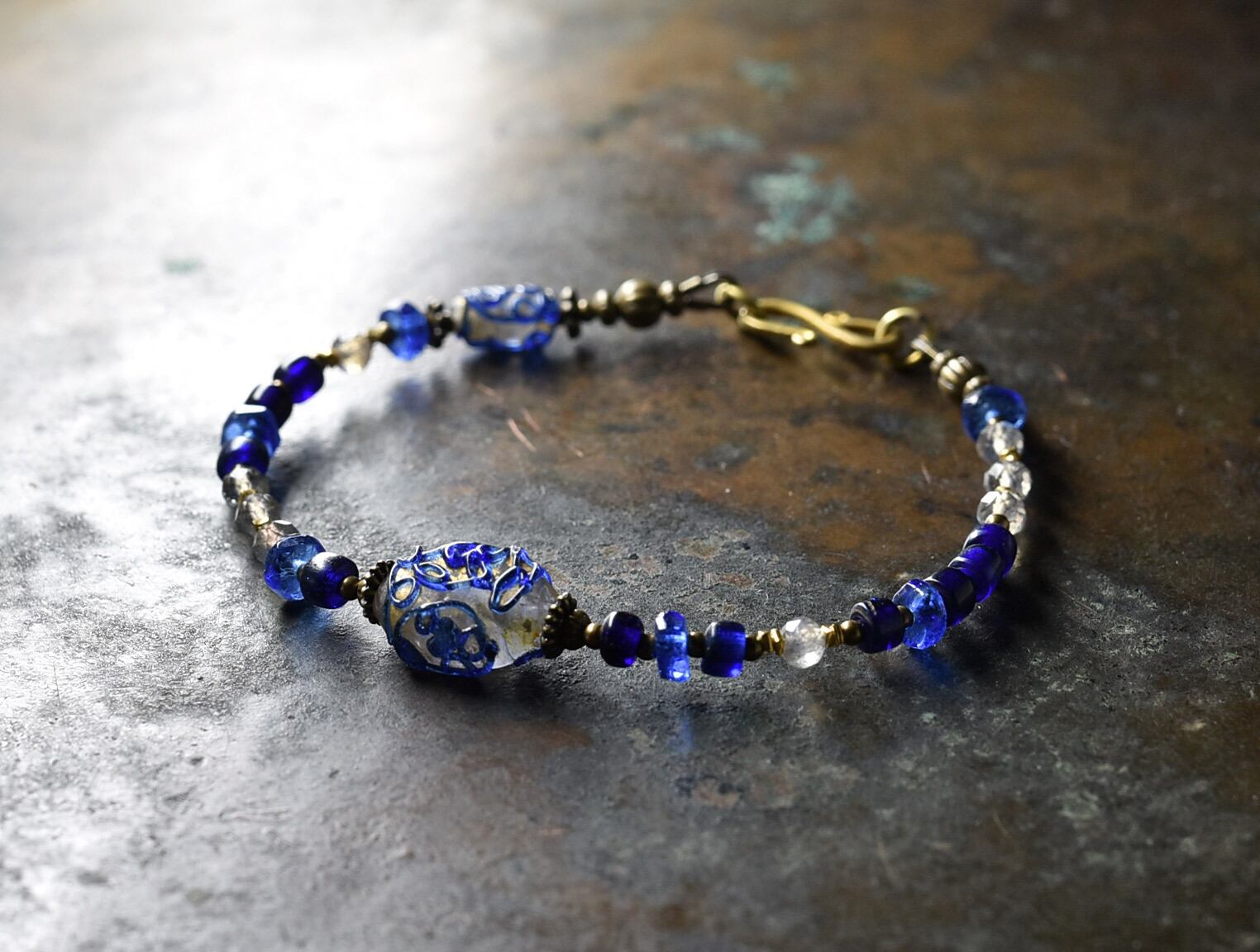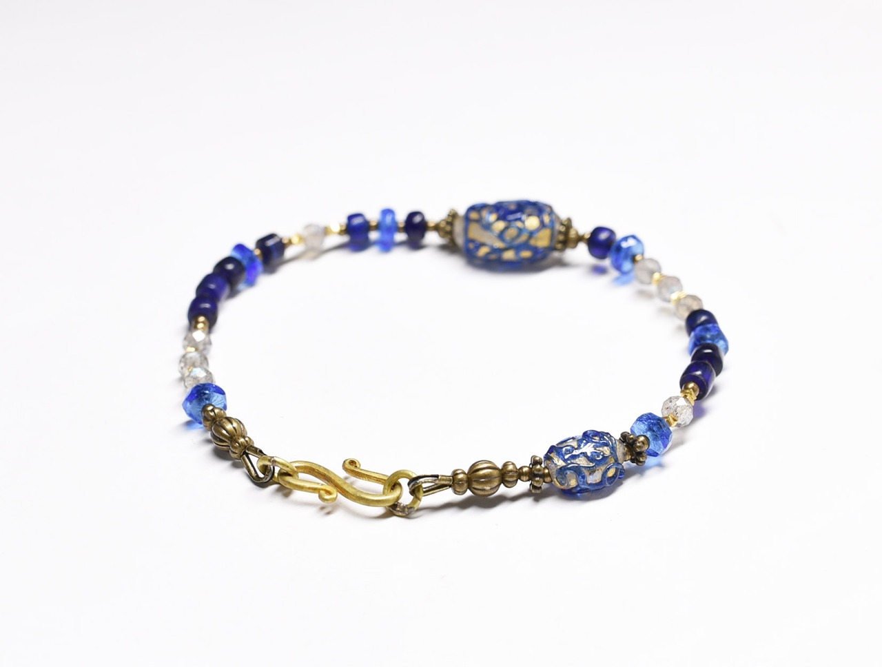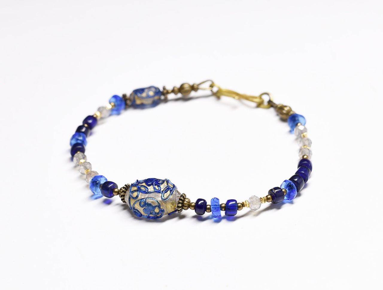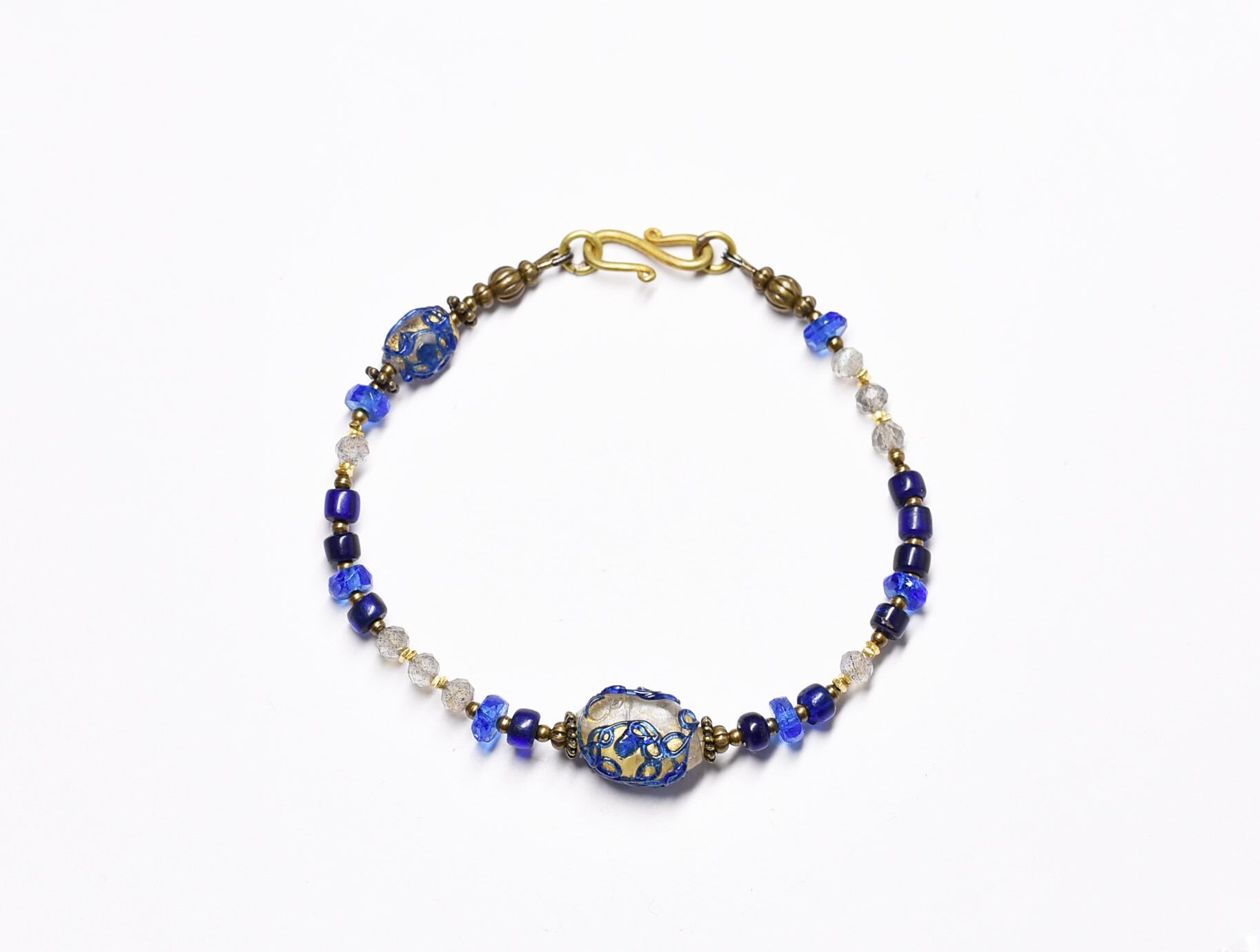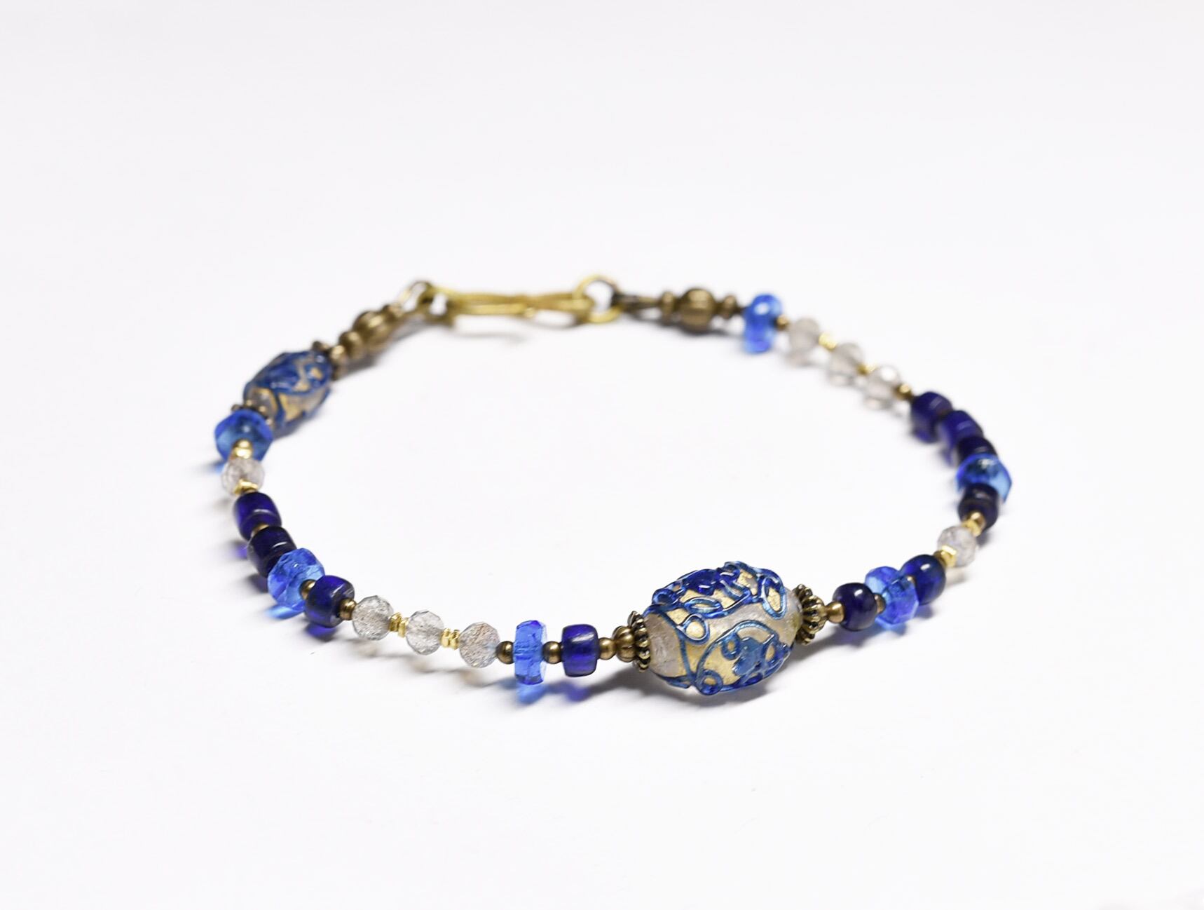アンティーク瑠璃色トレイルデコレーションの金箔装飾ビーズと瑠璃色ビーズ、ラブラドライトのブレス(再販)