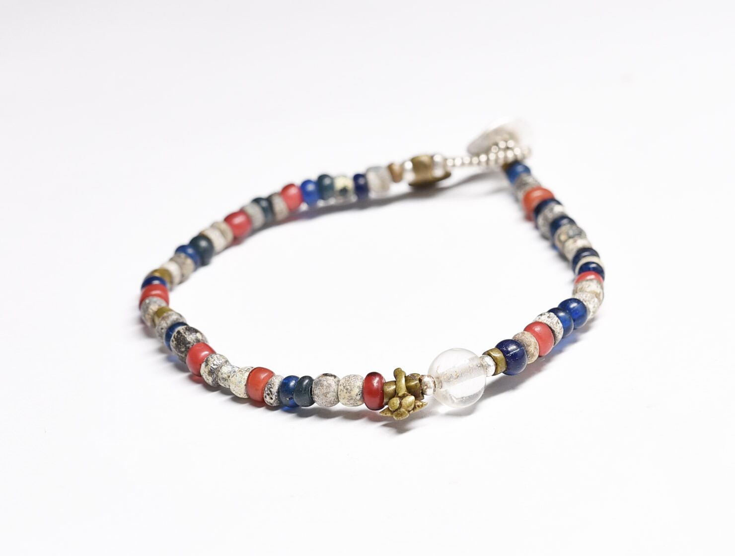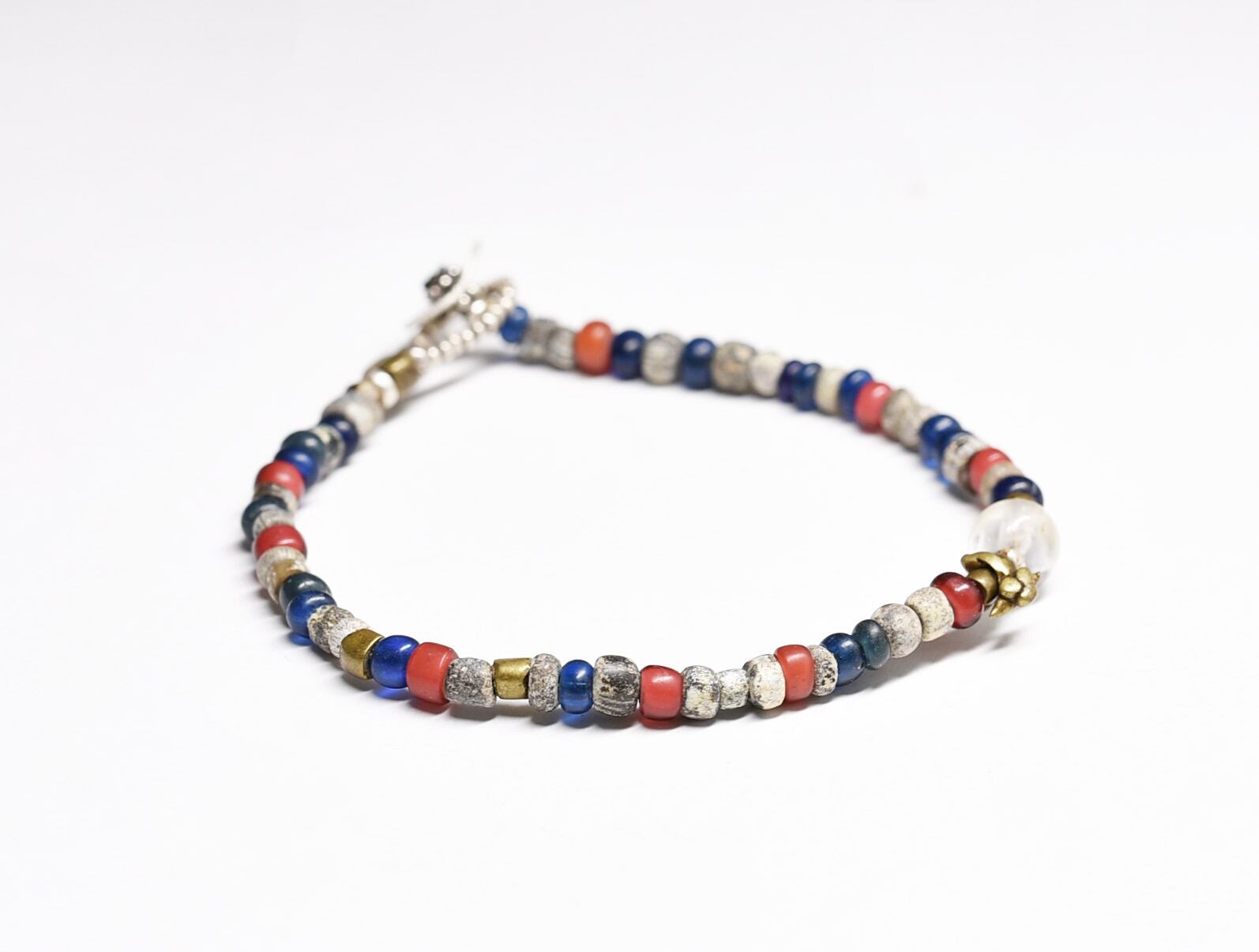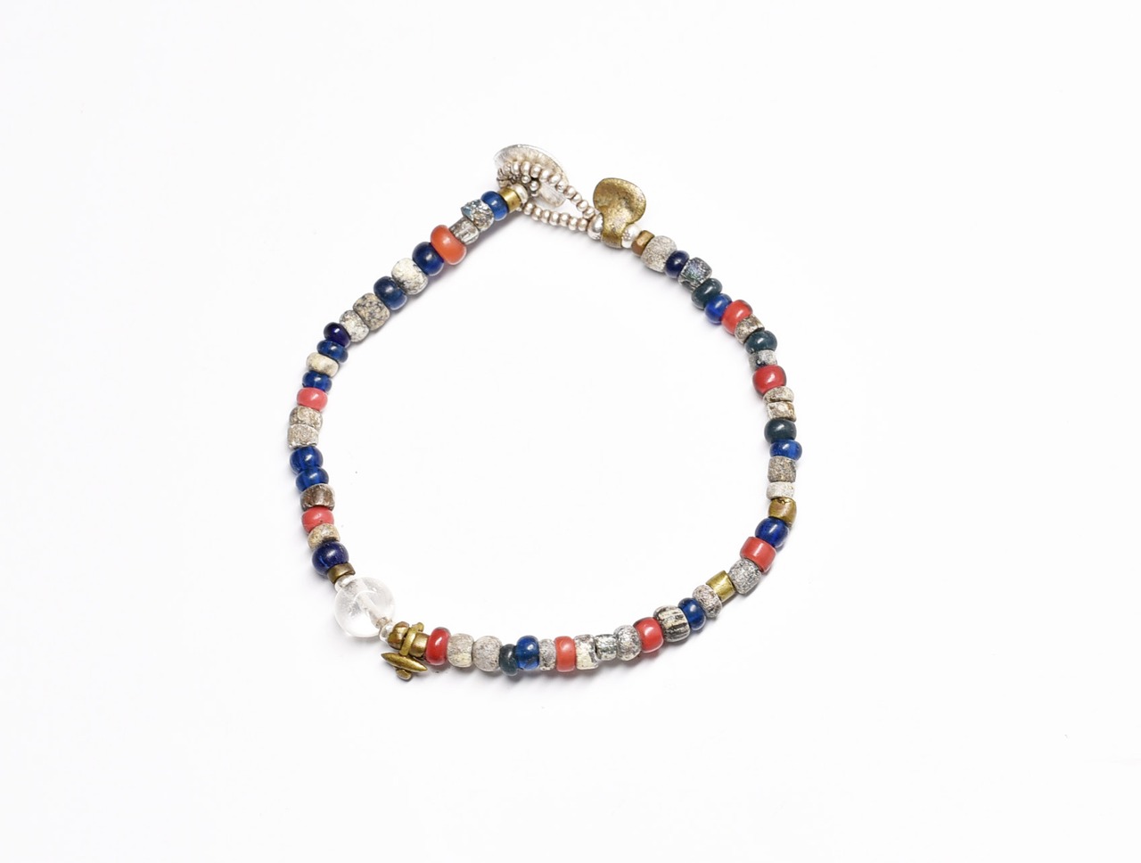 古代水晶、出土ビーズと、金赤ホワイトハーツ、oldオリッサブラスなどを繋いだブレスです。