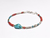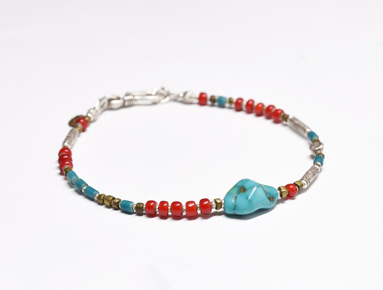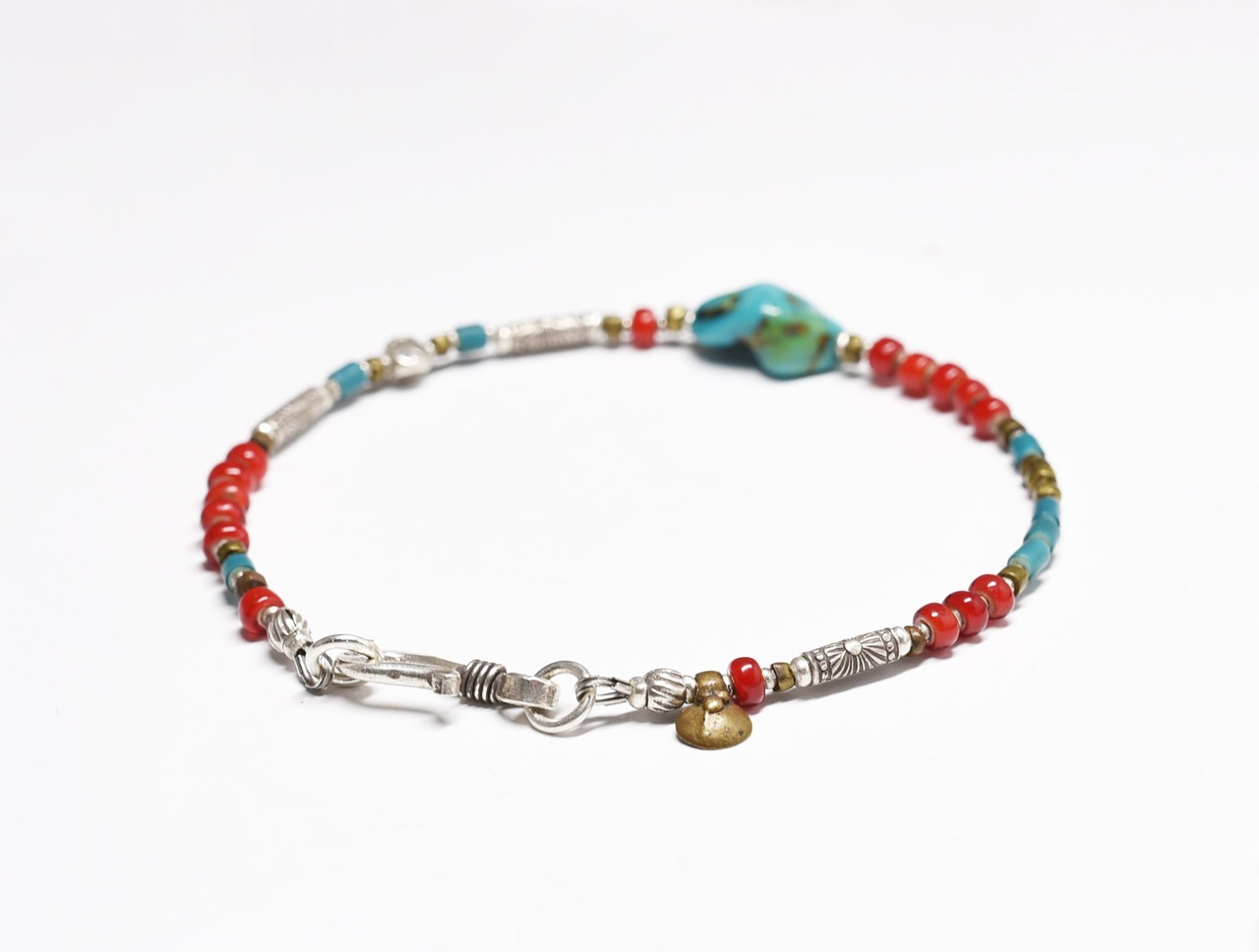 アリゾナターコイズと2種類のホワイトハーツ、カレンシルバー、oldオリッサブラスを繋いだアンクレットです。