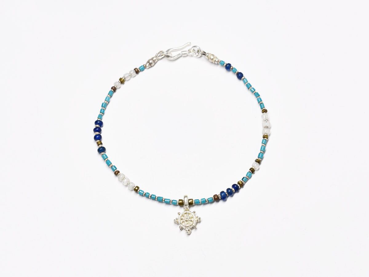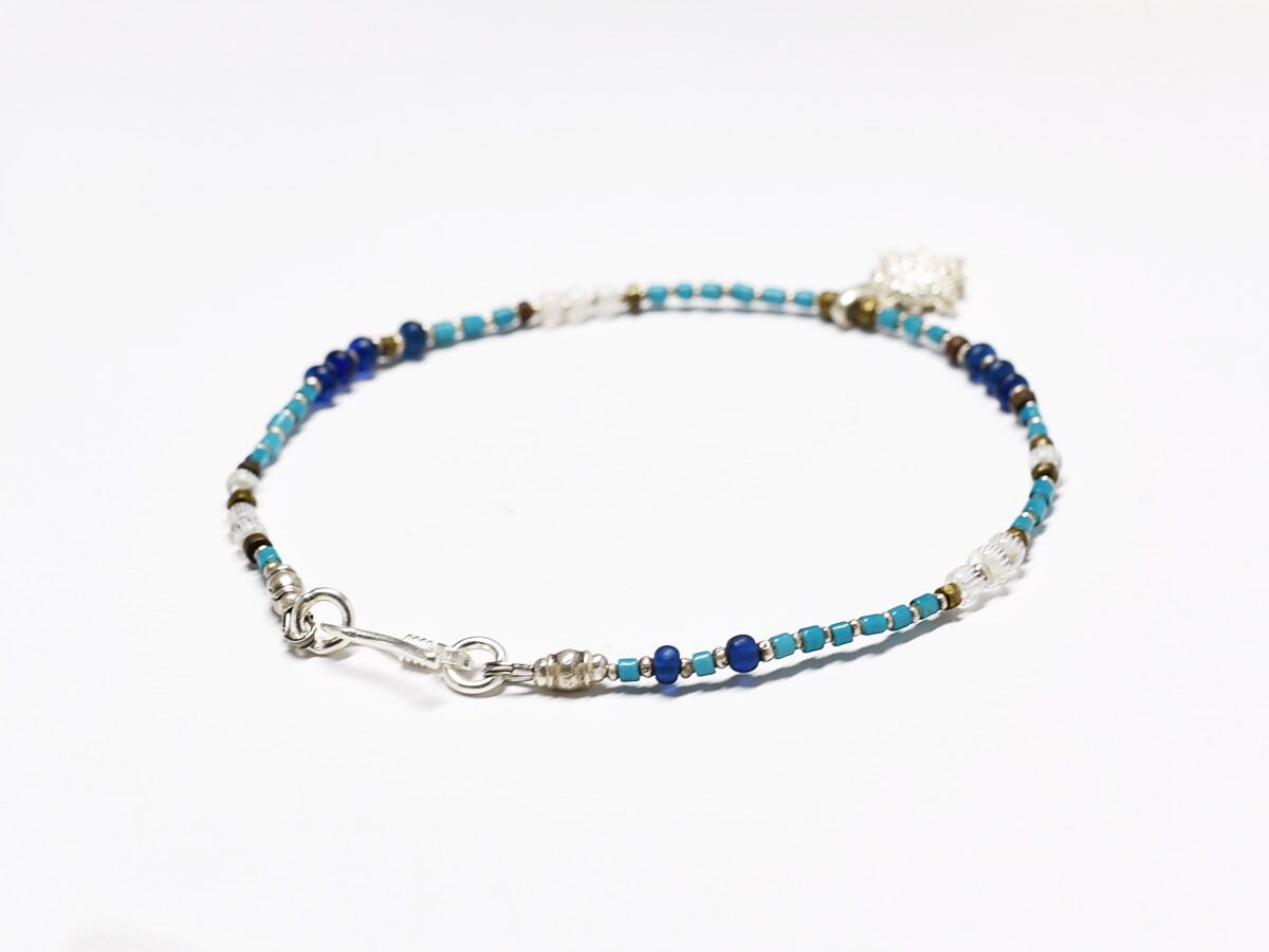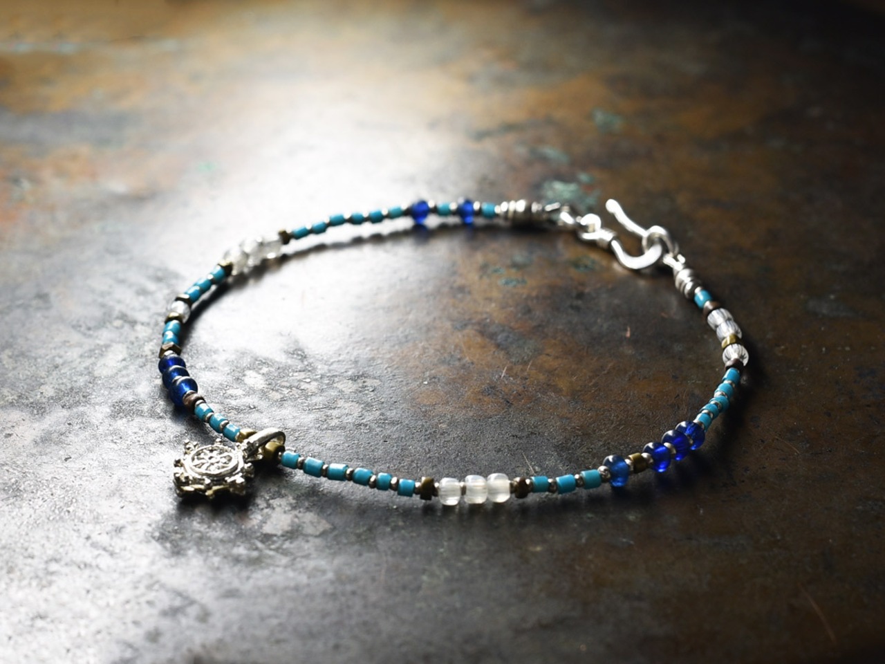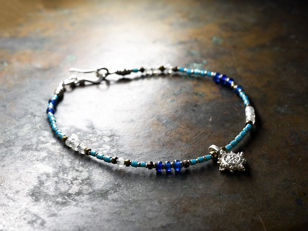 チベットシルバーマーカーとターコイズブルーホワイトハーツ、ブルーアンティークビーズ、グーズベリー、oldオリッサブラス、カレンシルバーを繋いだアンクレットです。