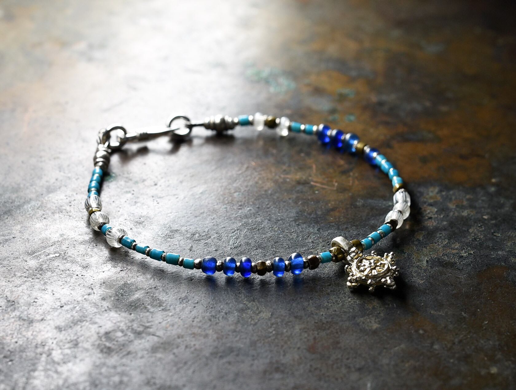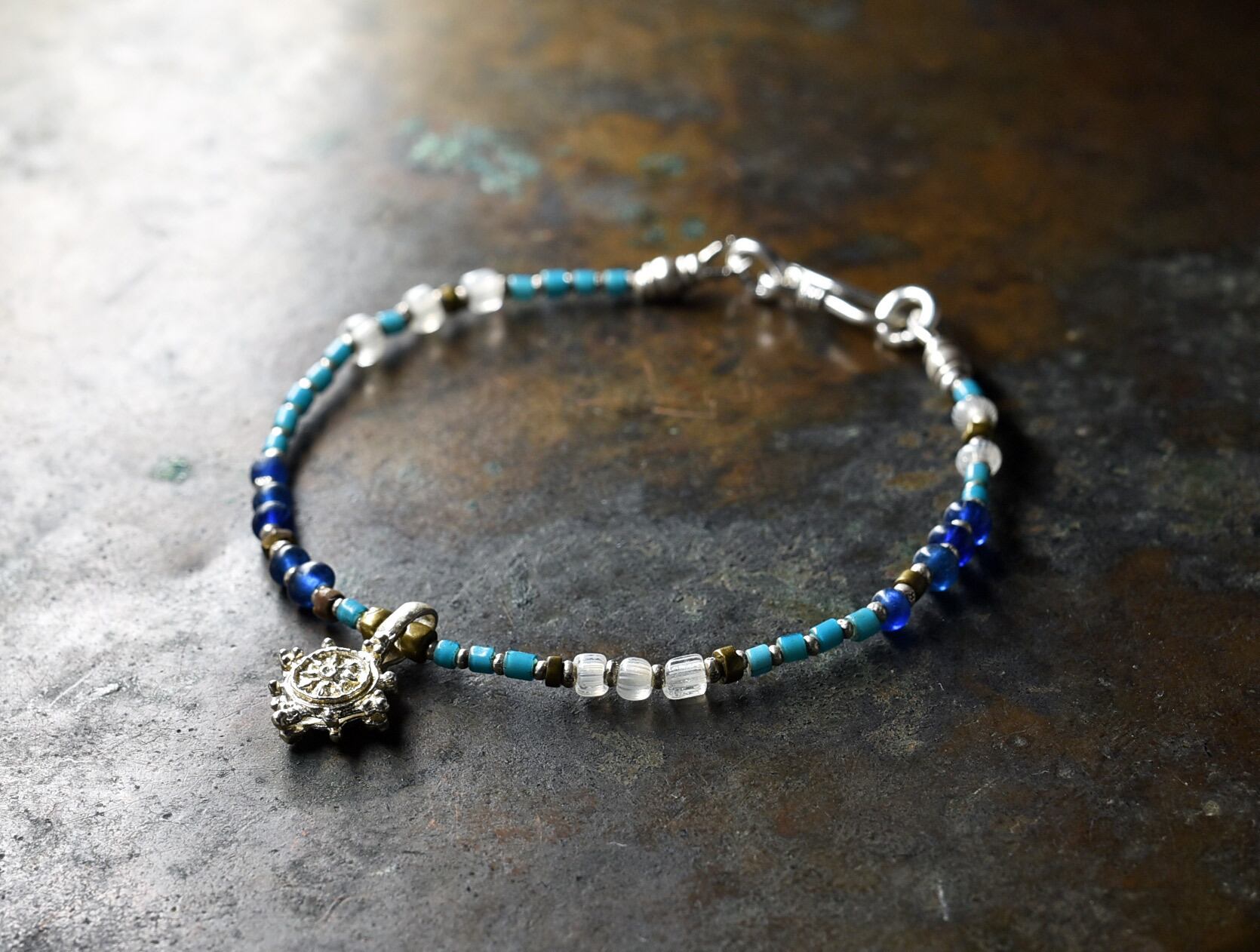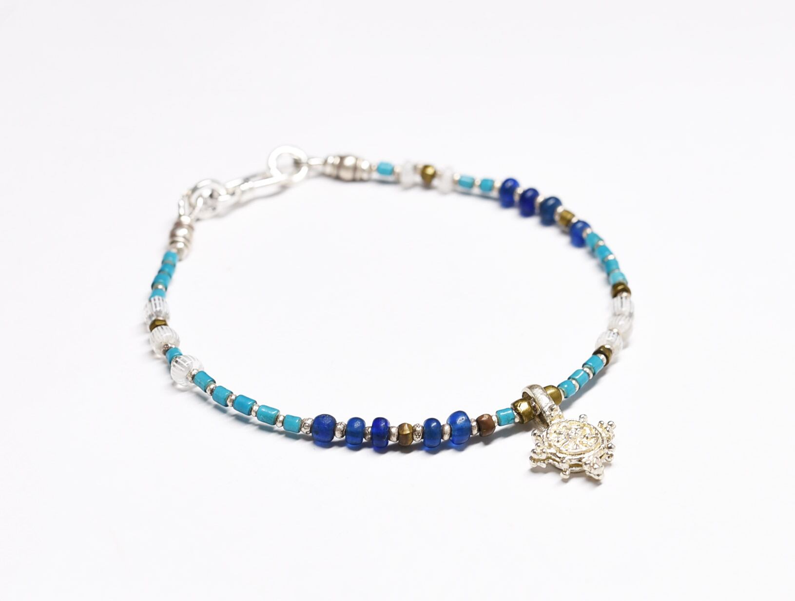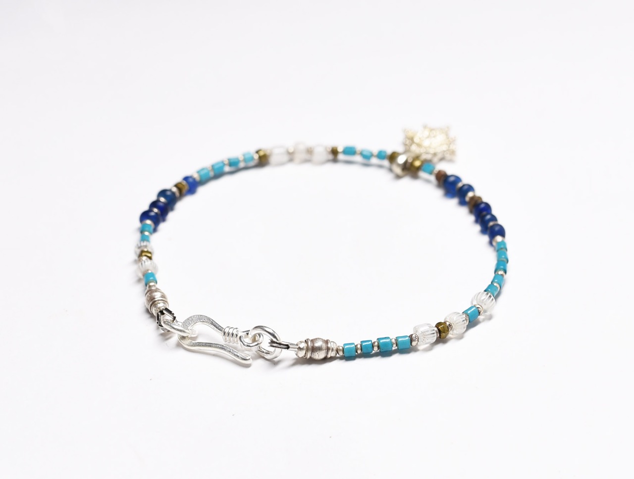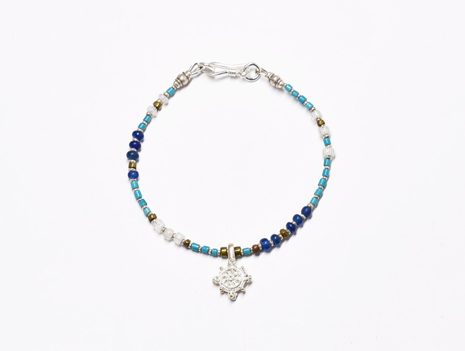 チベットシルバーマーカーとターコイズブルーホワイトハーツ、ブルーアンティークビーズ、グーズベリー、oldオリッサブラス、カレンシルバーを繋いだ華奢なブレスです。