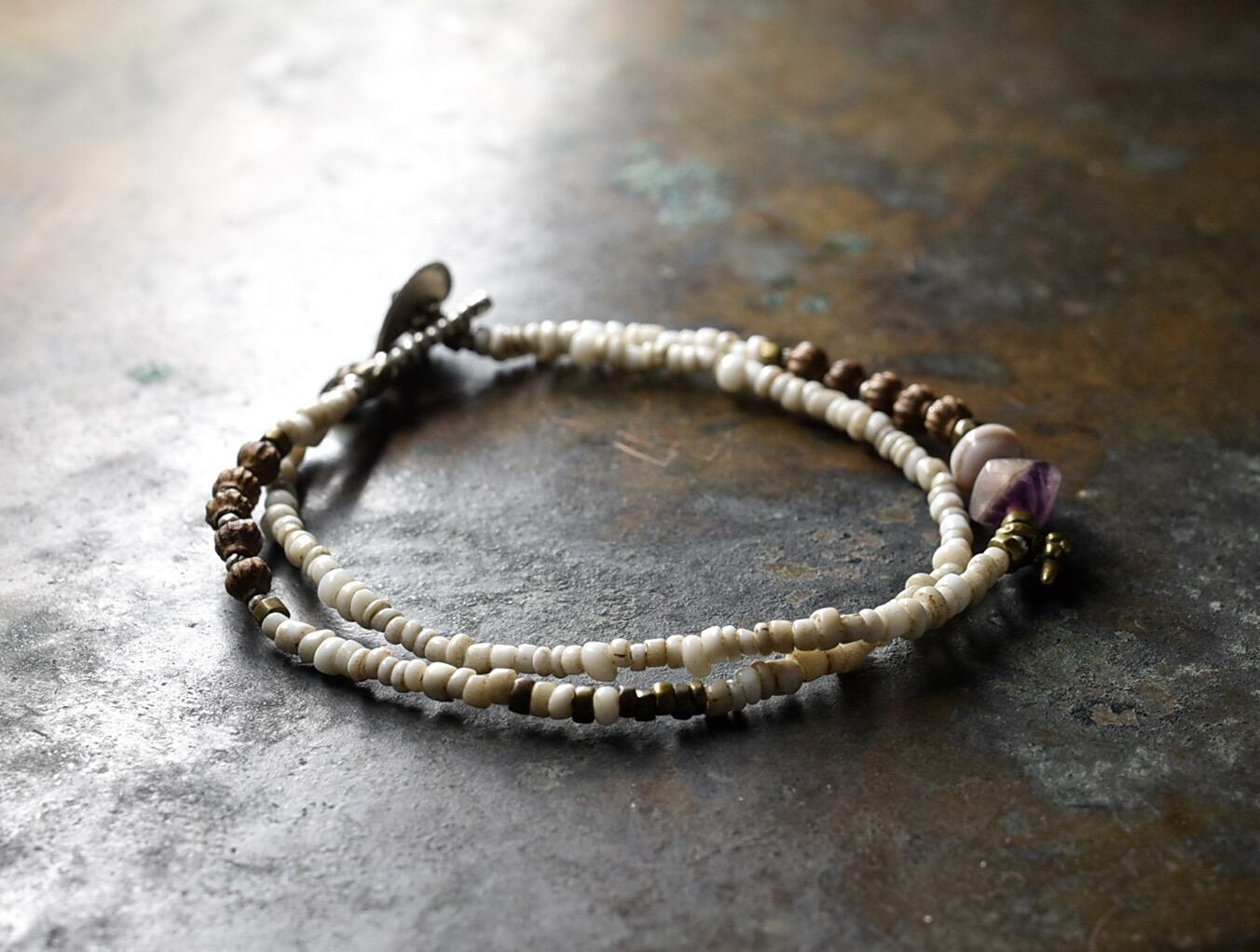 古代アメジストと古代瑪瑙、ホワイトシードビーズ、oldオリッサブラス、木の実の2連ブレス