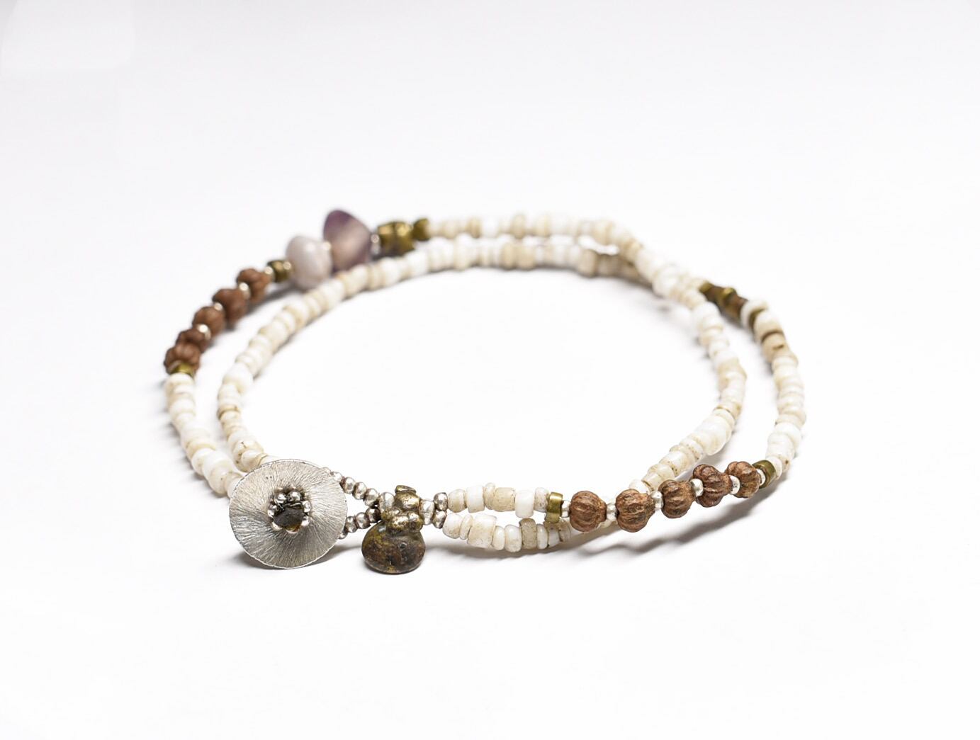 古代アメジスト、古代瑪瑙、シードビーズ、木の実、oldオリッサブラス、カレンシルバーを繋いだ2連のブレスです。