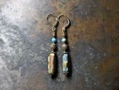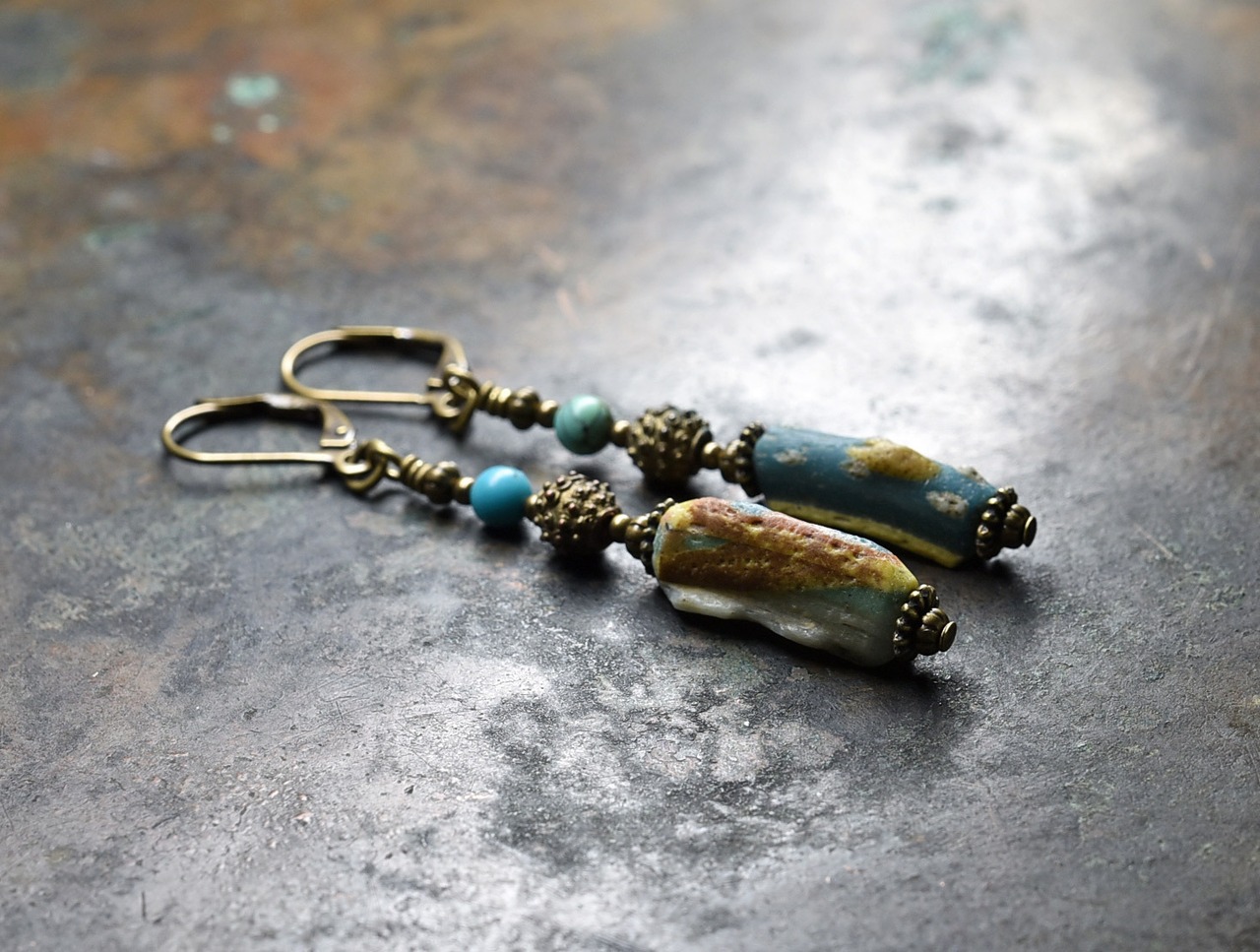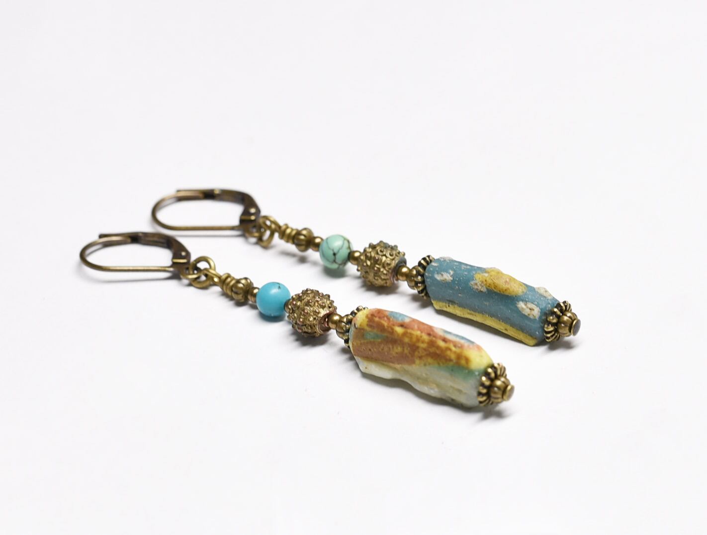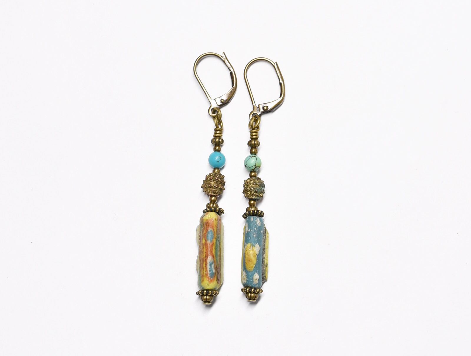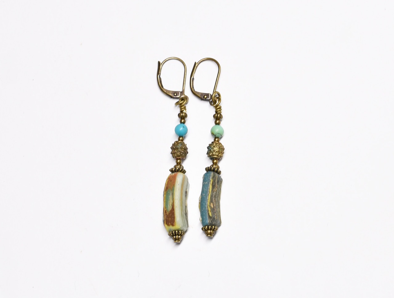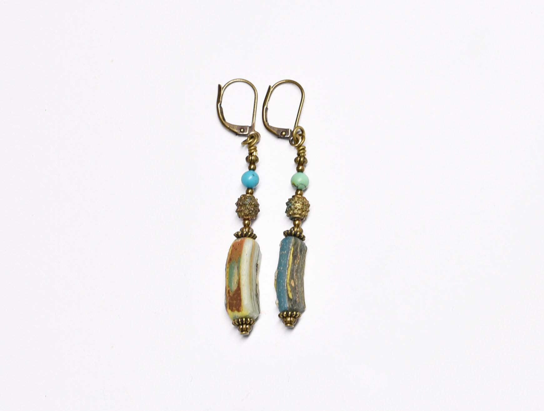 モザイク模様が施されたローマングラスとブラスビーズ、ターコイズを繋いだアンシメトリーなピアスです。