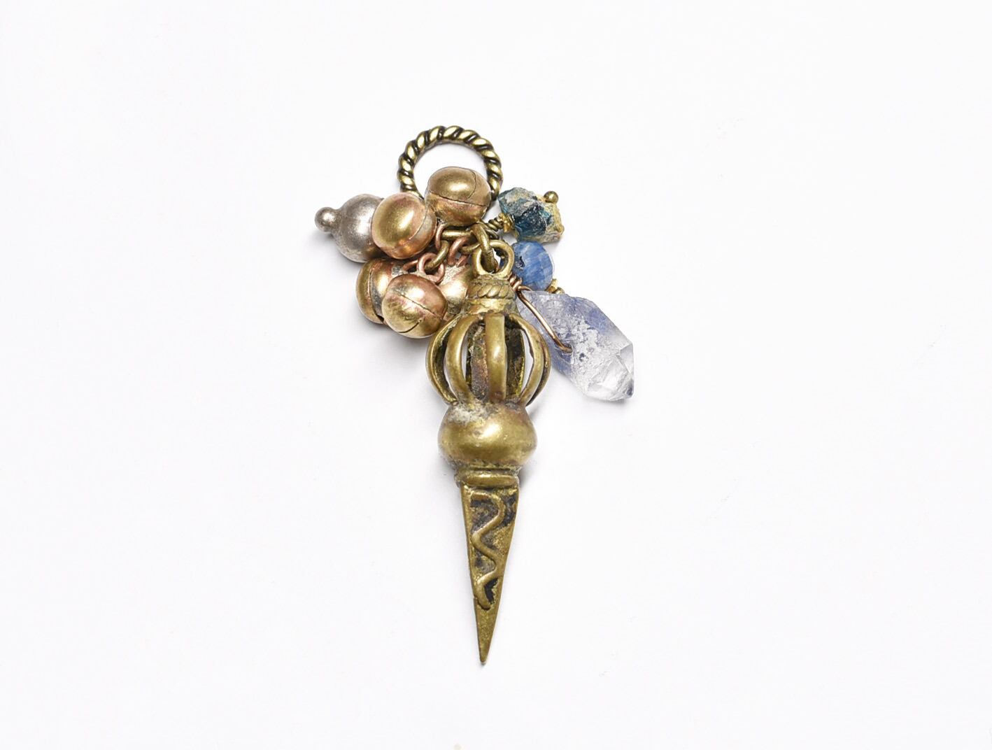 ブルパとたわわな鈴、デュモルチェライトインクォーツ、カイヤナイト、ローマングラスを繋いだペンダントトップです。