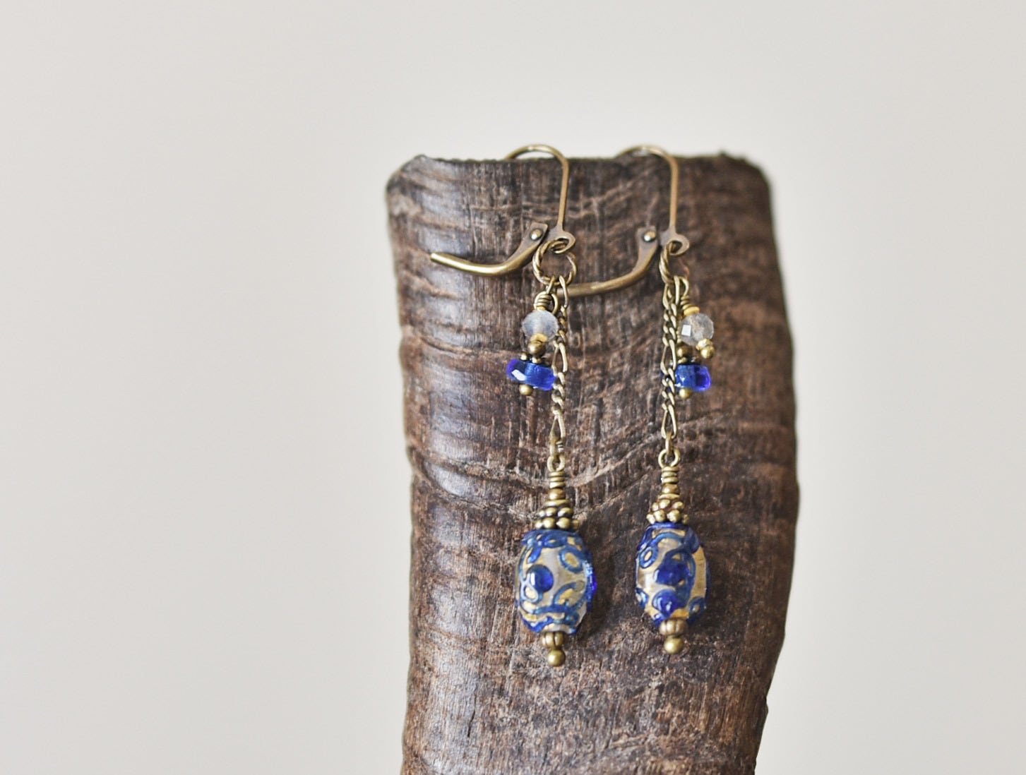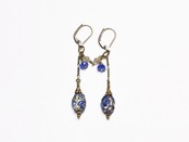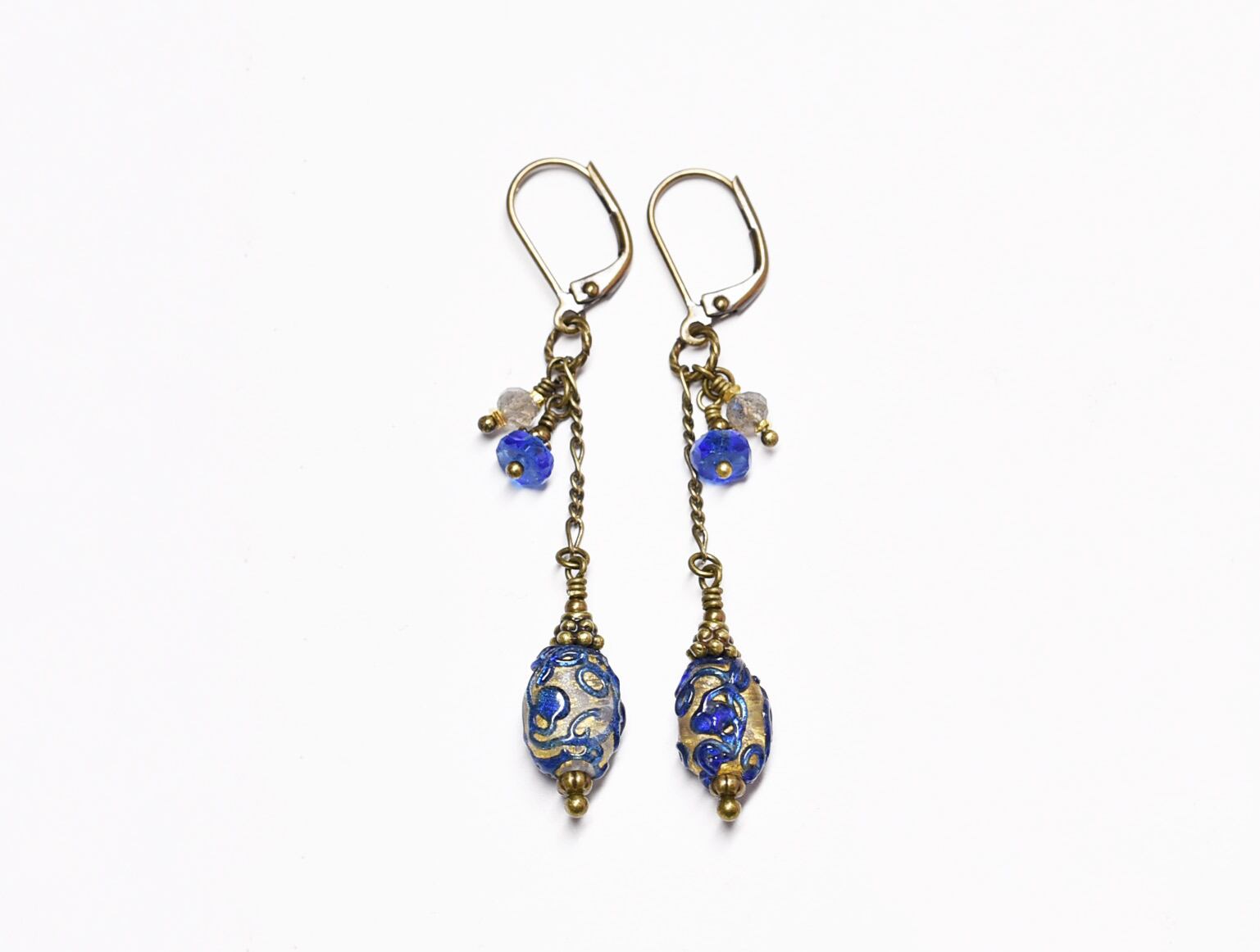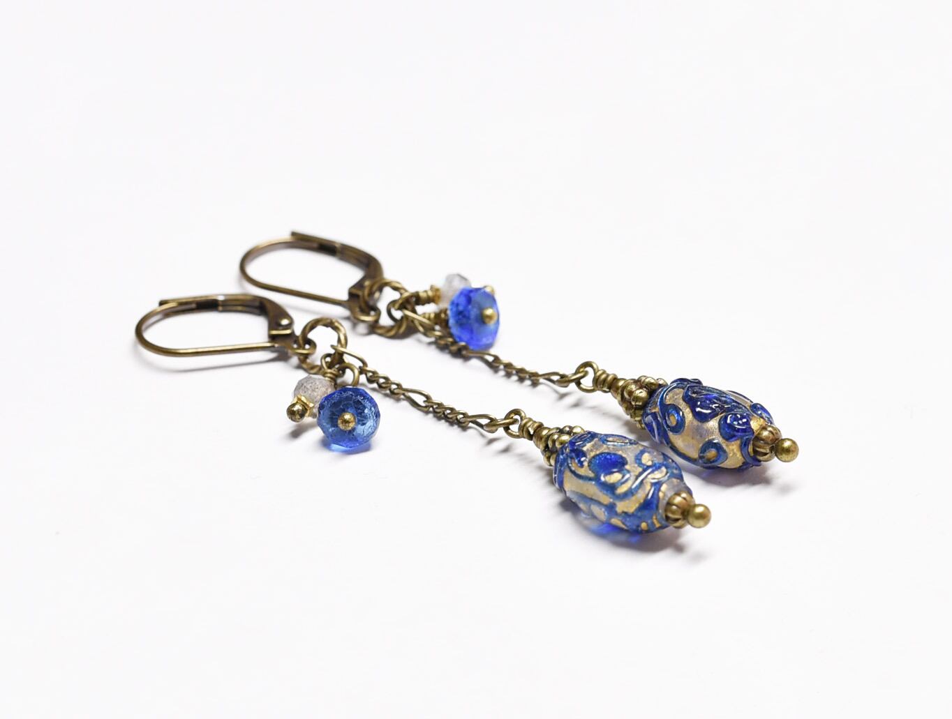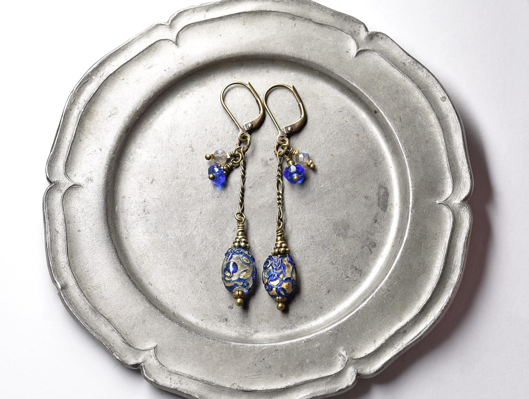 アンティーク瑠璃色トレイルデコレーションの金箔装飾ビーズとラブラドライトのチェーンピアス