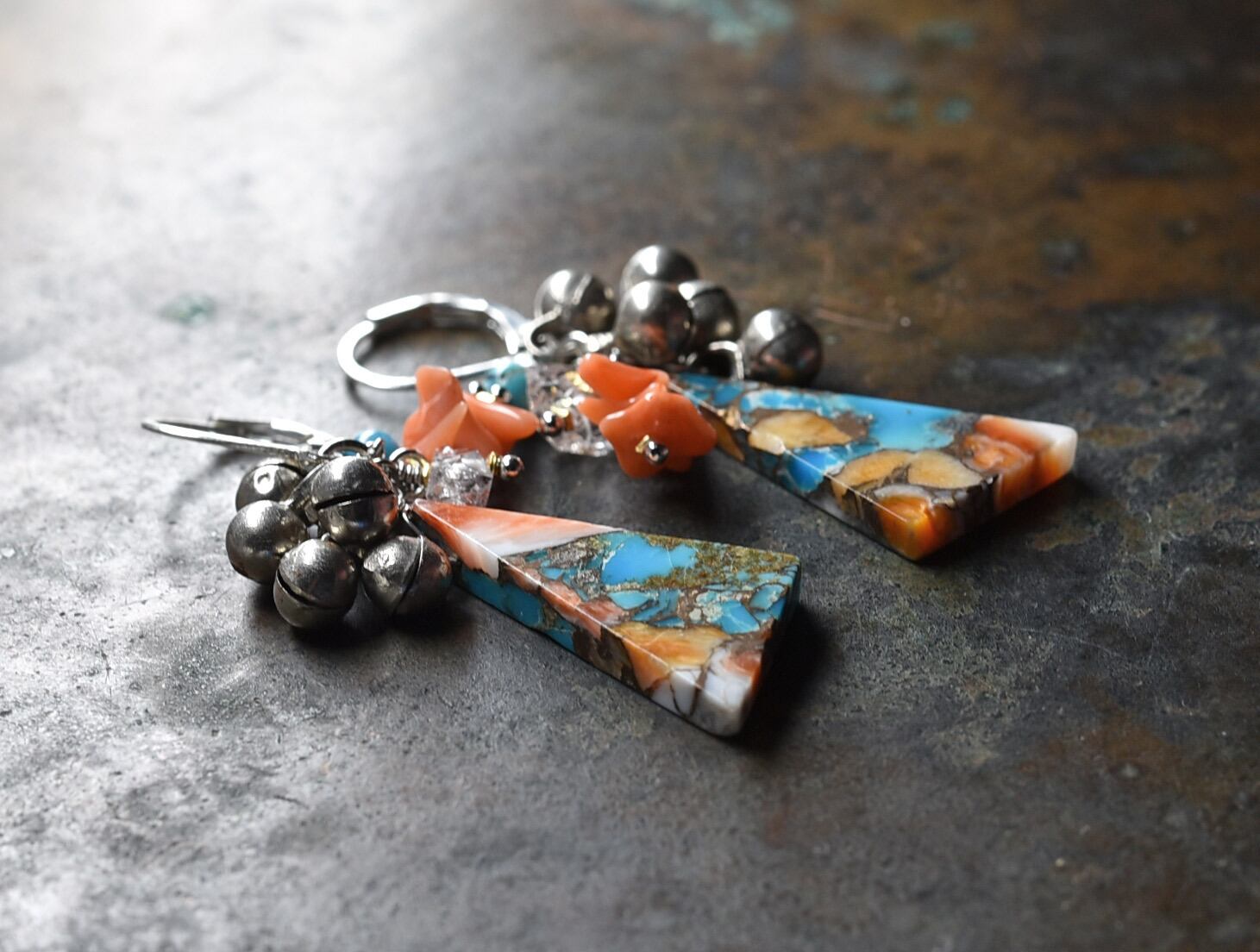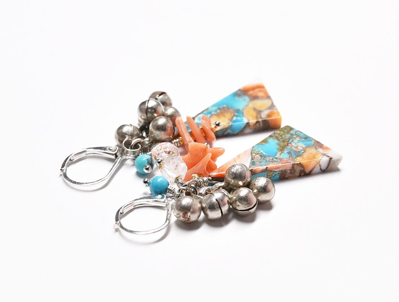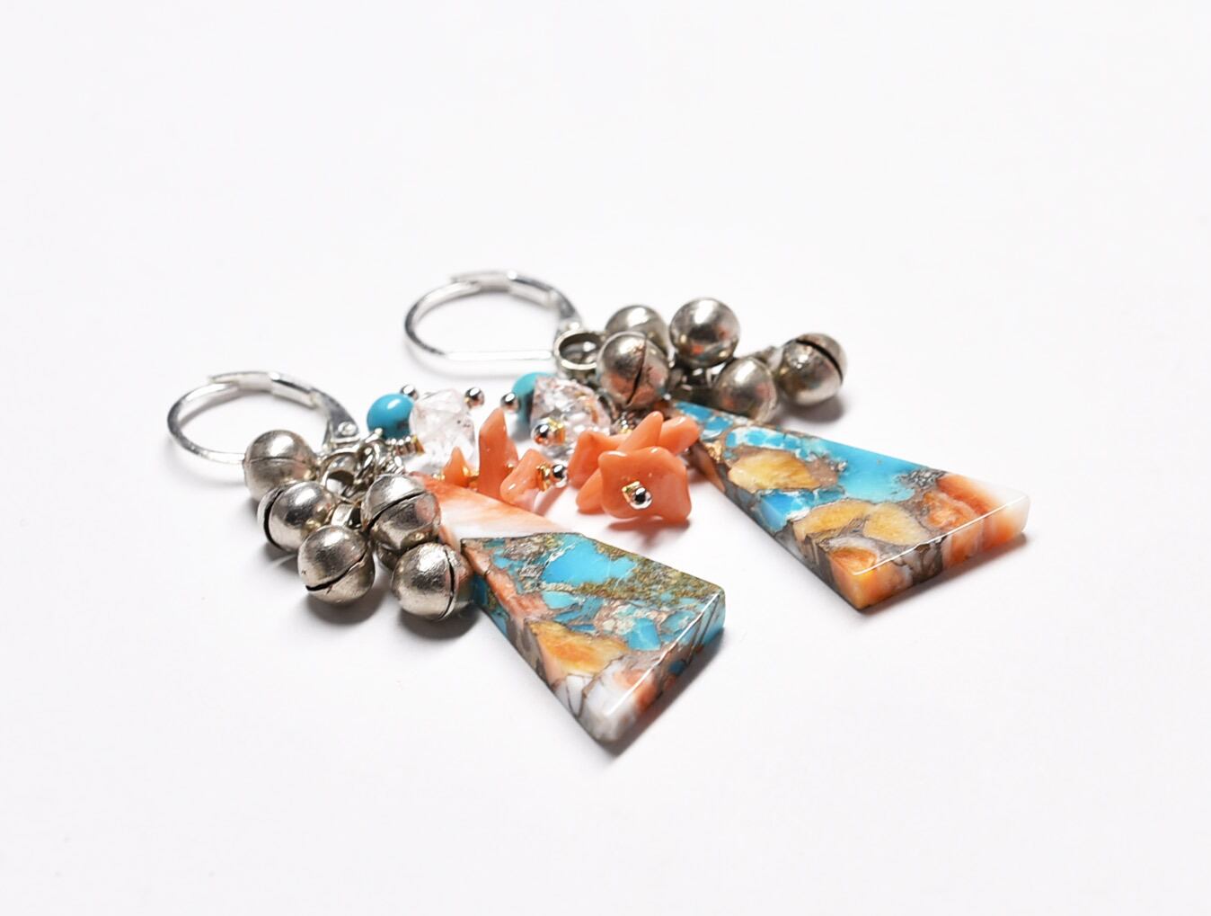 オイスターコッパーターコイズとたわわな鈴、ハーキマーダイヤモンド、ターコイズ、珊瑚を繋いだピアスです。