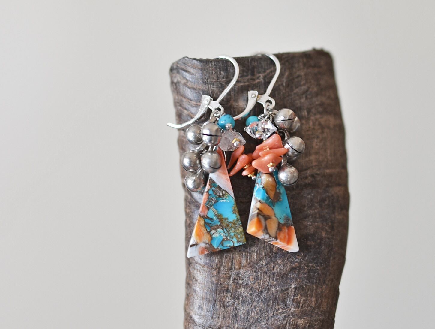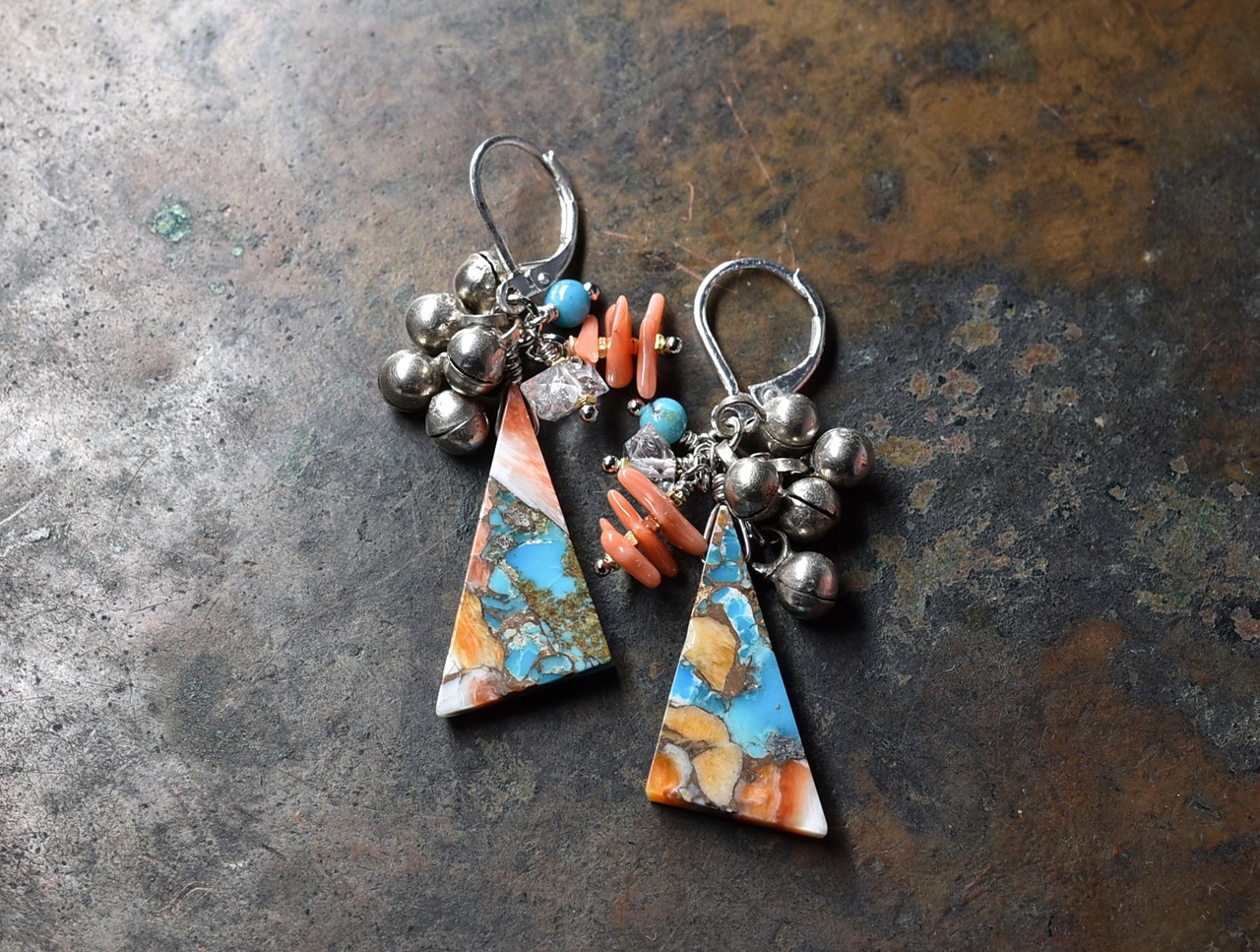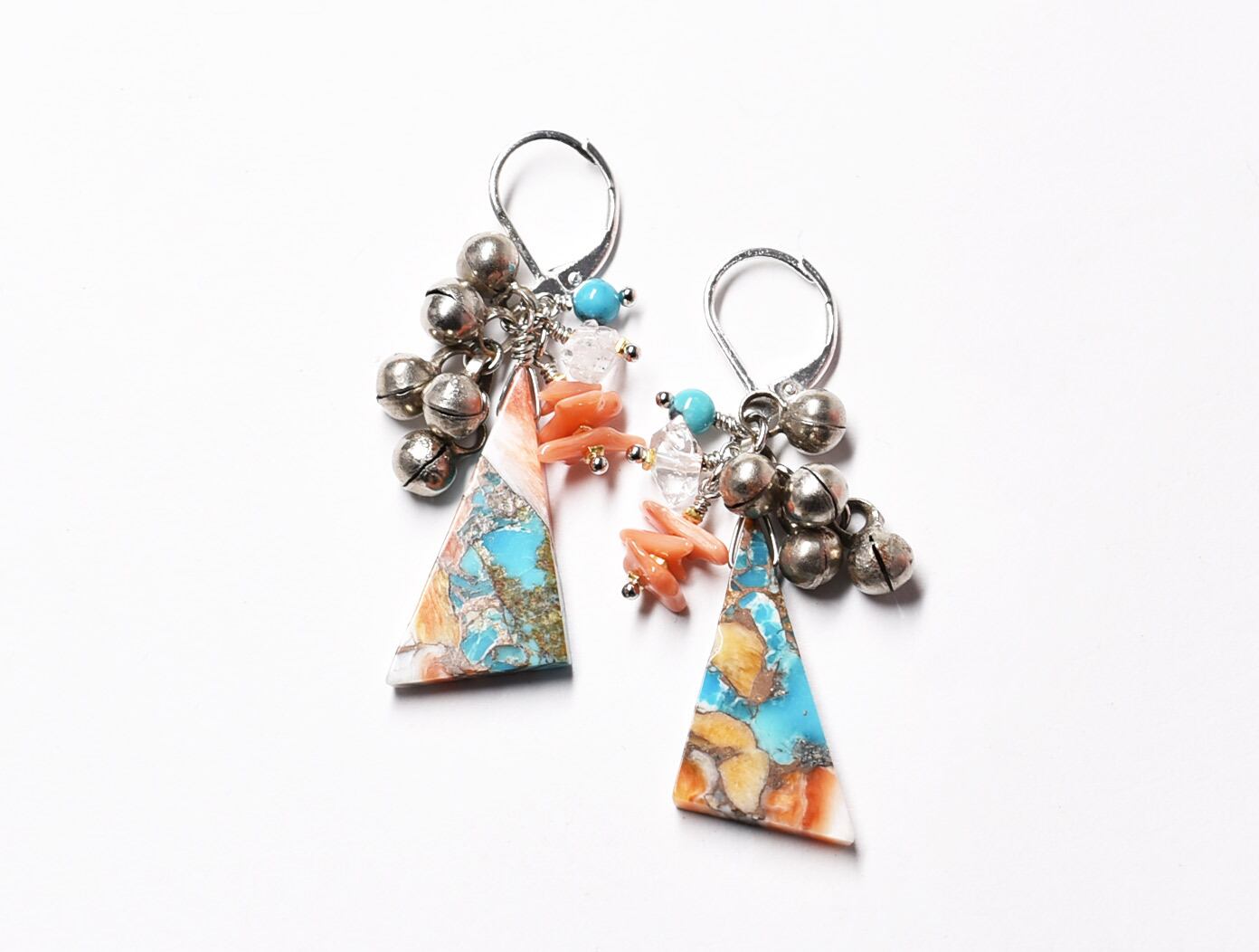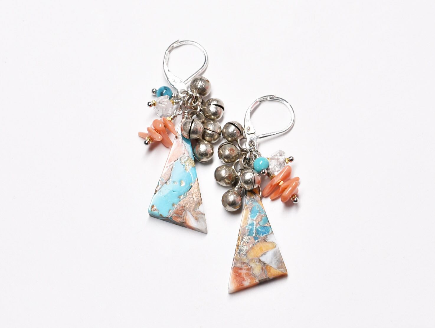 オイスターコッパーターコイズとたわわな鈴、ハーキマーダイヤモンド、ターコイズ、珊瑚を繋いだピアスです。