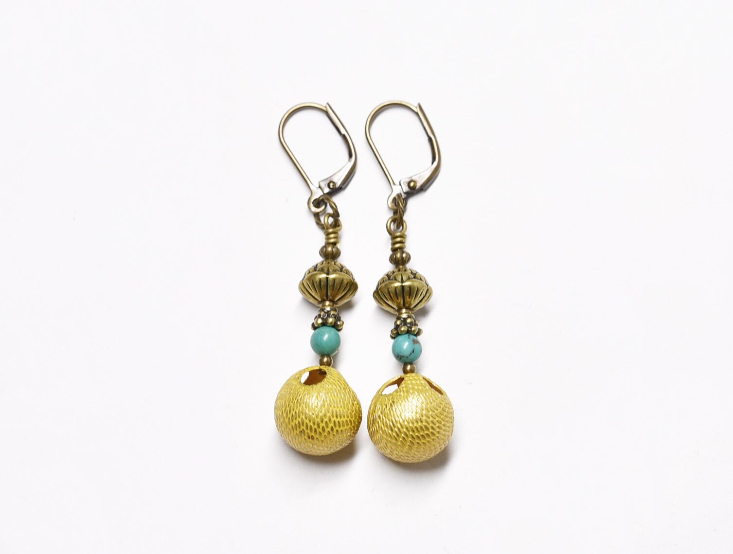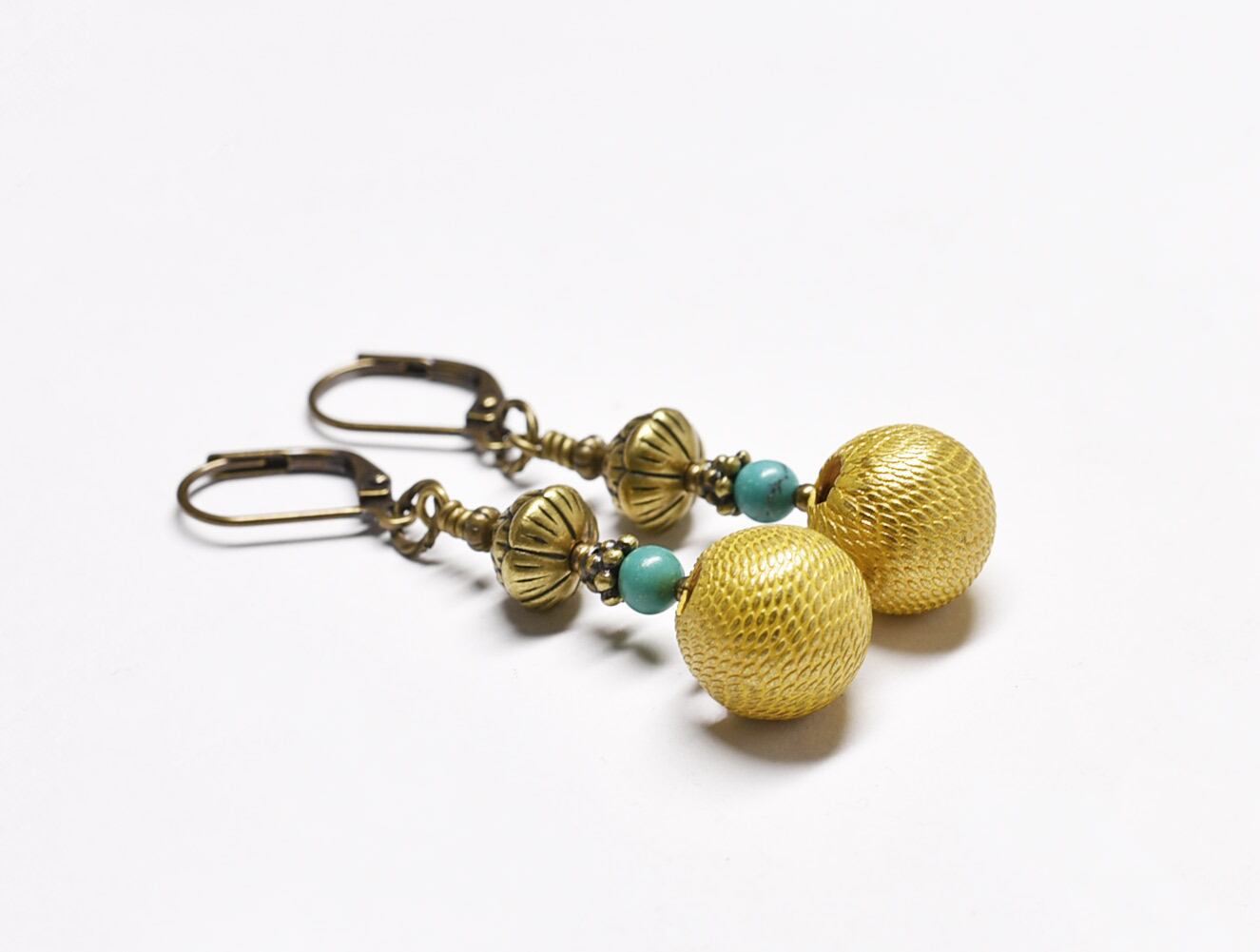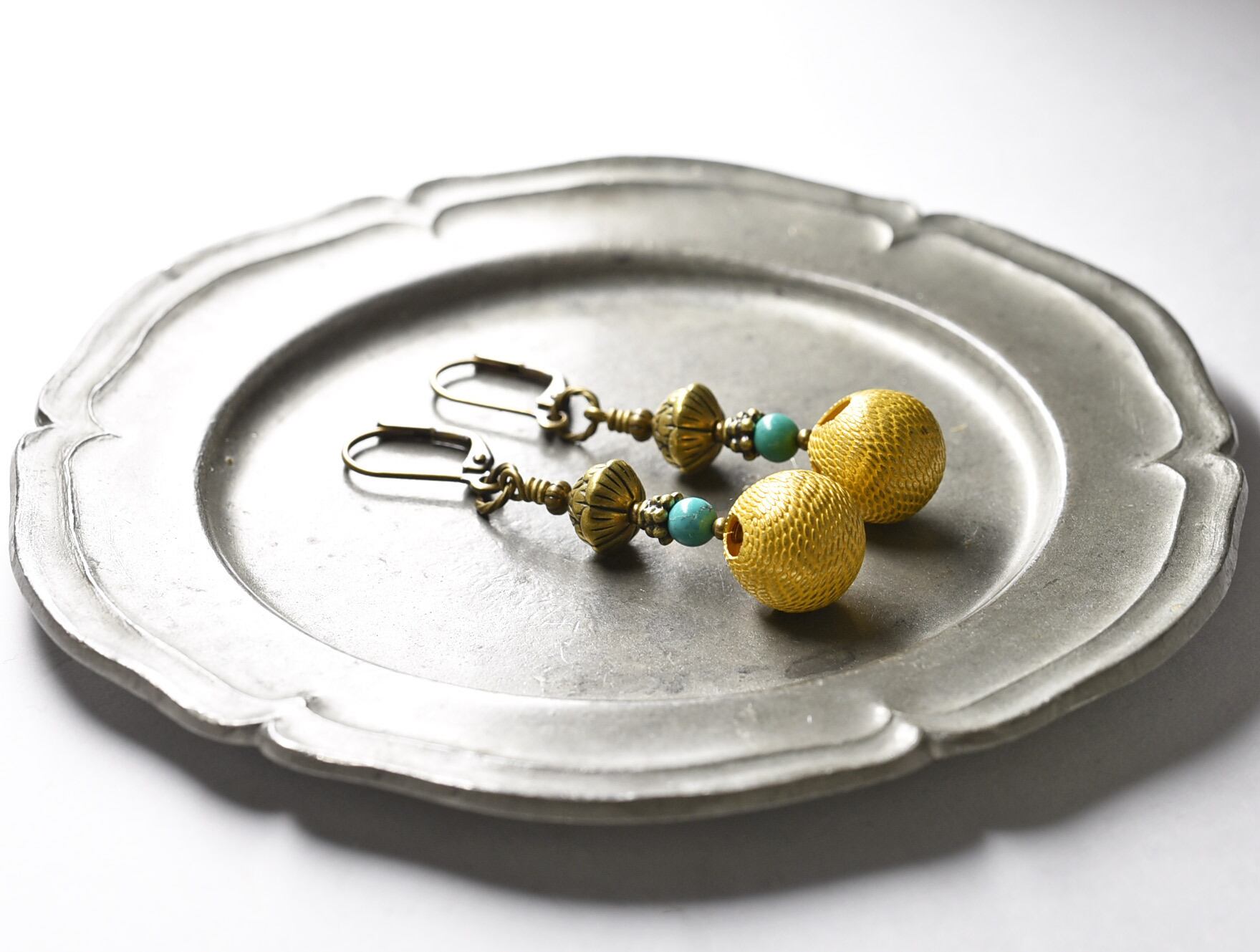 フランスデッドストックメタルとターコイズ、蓮華ブラスを繋いだピアスです。