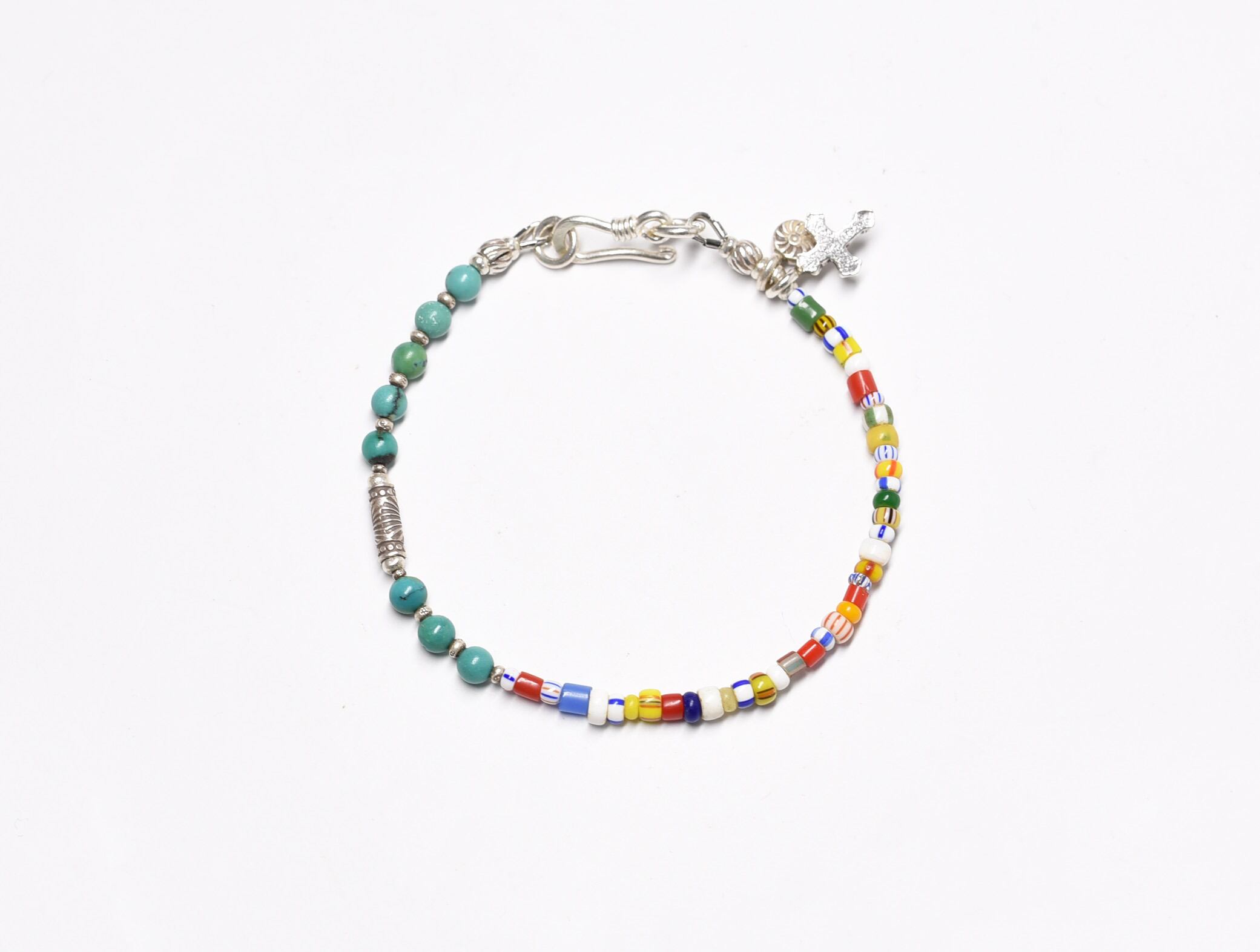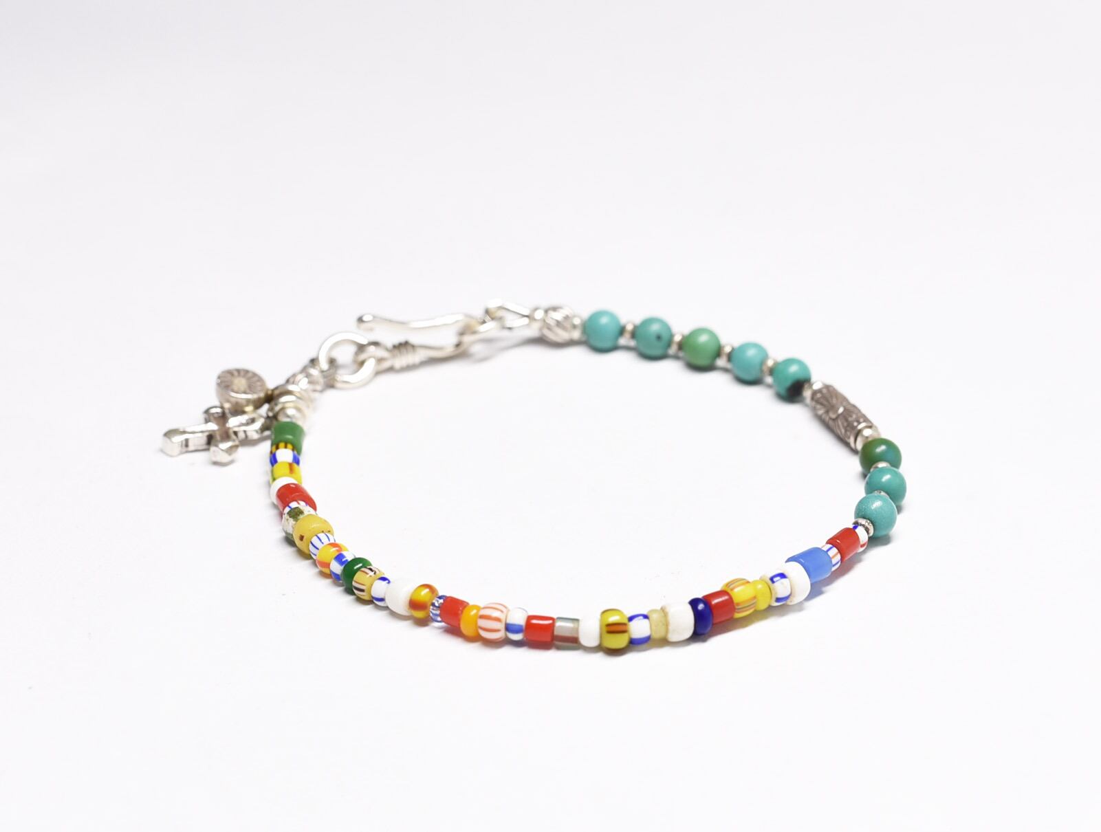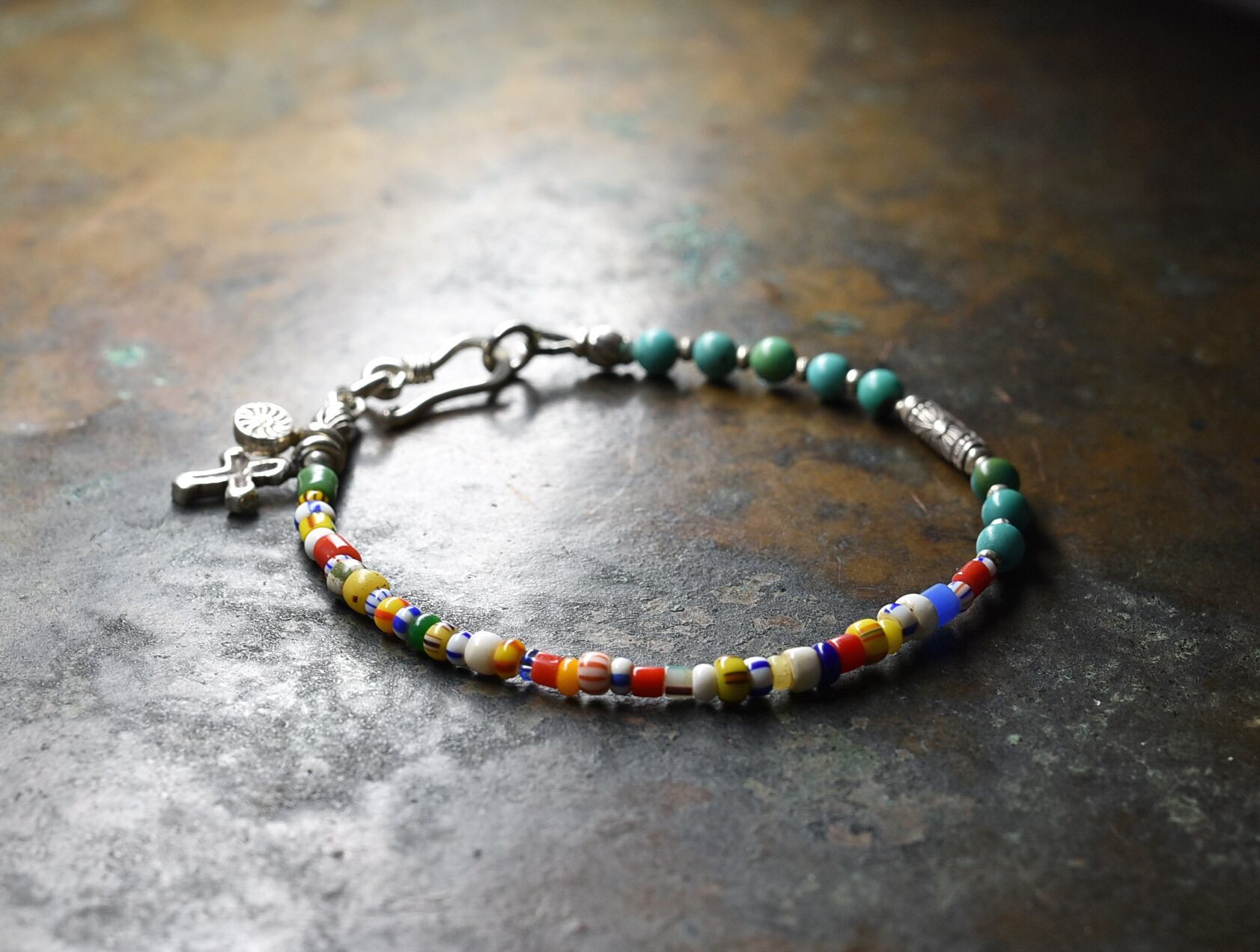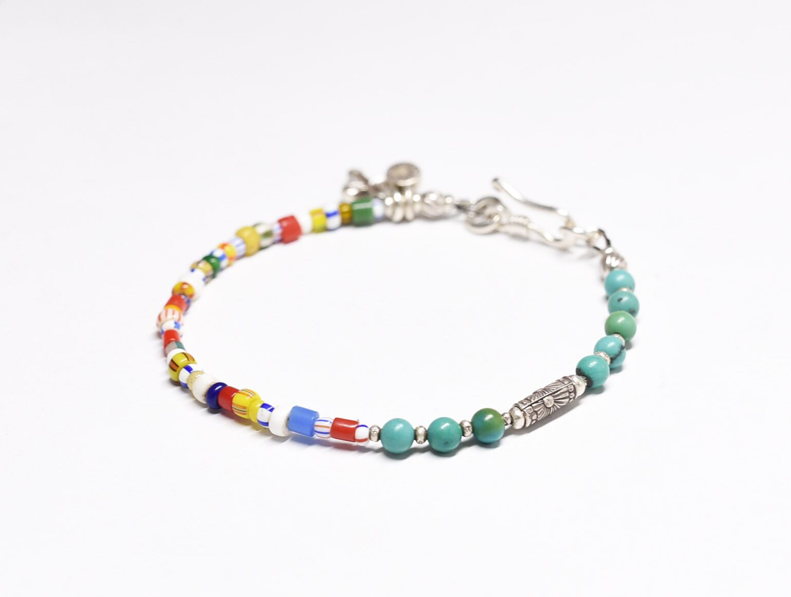 クリスマスビーズと丸いターコイズ、カレンシルバーを繋いだカラフルなブレスです。