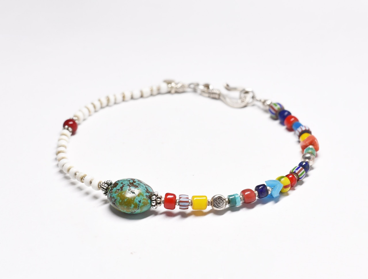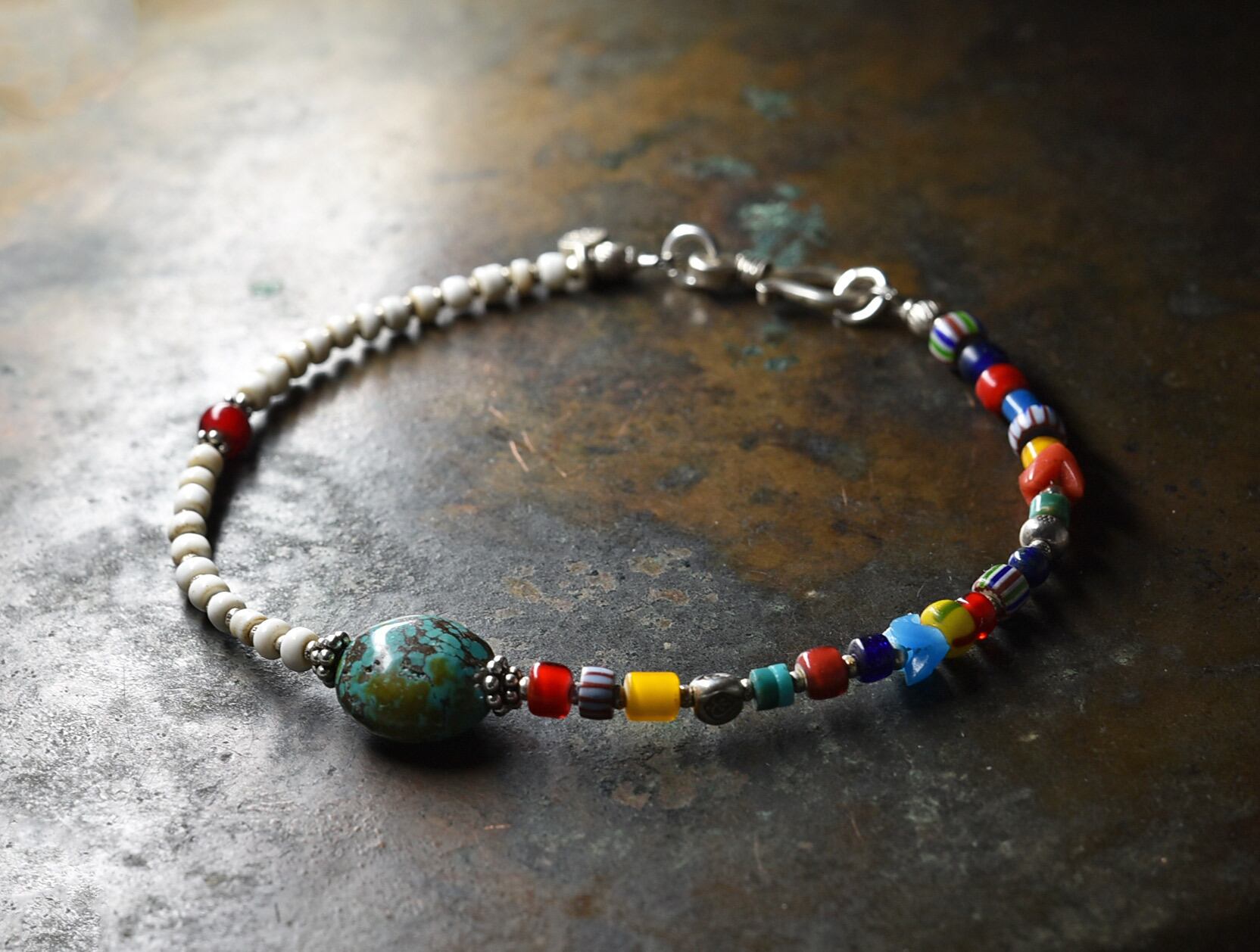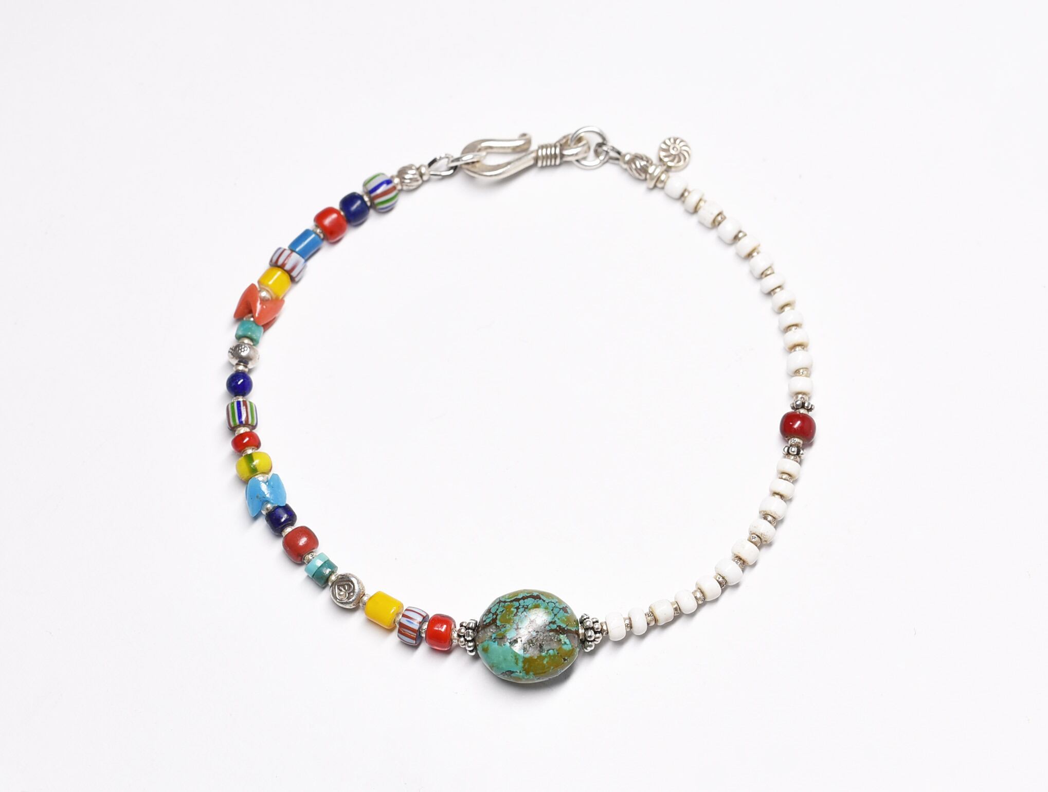 チベタンターコイズとカラフルなアンティークビーズ、カレンシルバーなど繋いだアンクレットです。